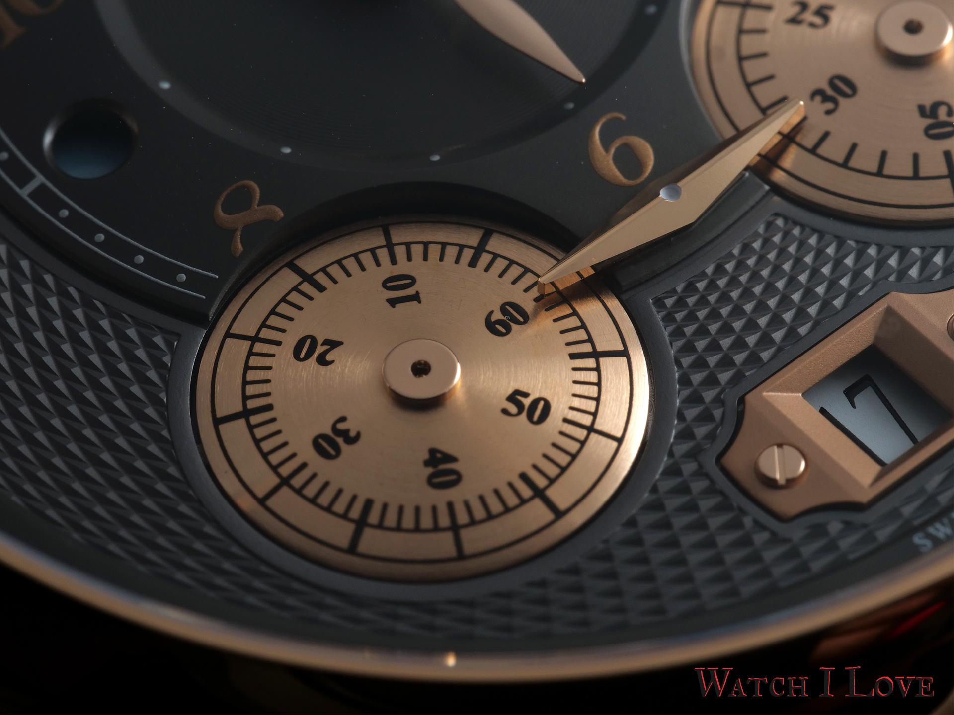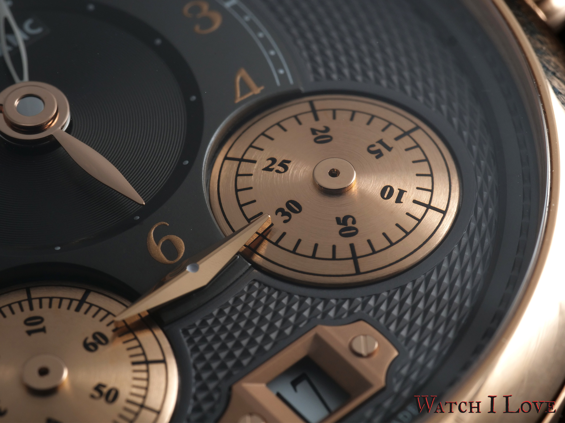 The dial of the Nicolas Rieussec chrono is a playful collection of finishes in multi-level surfaces. The guilloché pattern surrounds the various displays present on the dial.