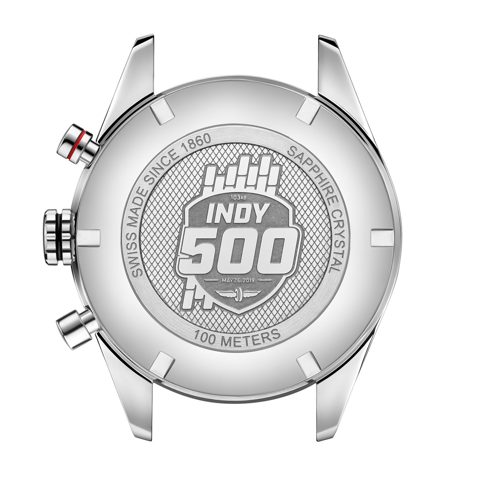 - Diameter 43 mm, stainless steel brushed case, black aluminum polished tachymeter fixed bezel, sapphire crystal, water-resistant to 200 metres (20 bar), steel case back with special “Indy 500” engraving