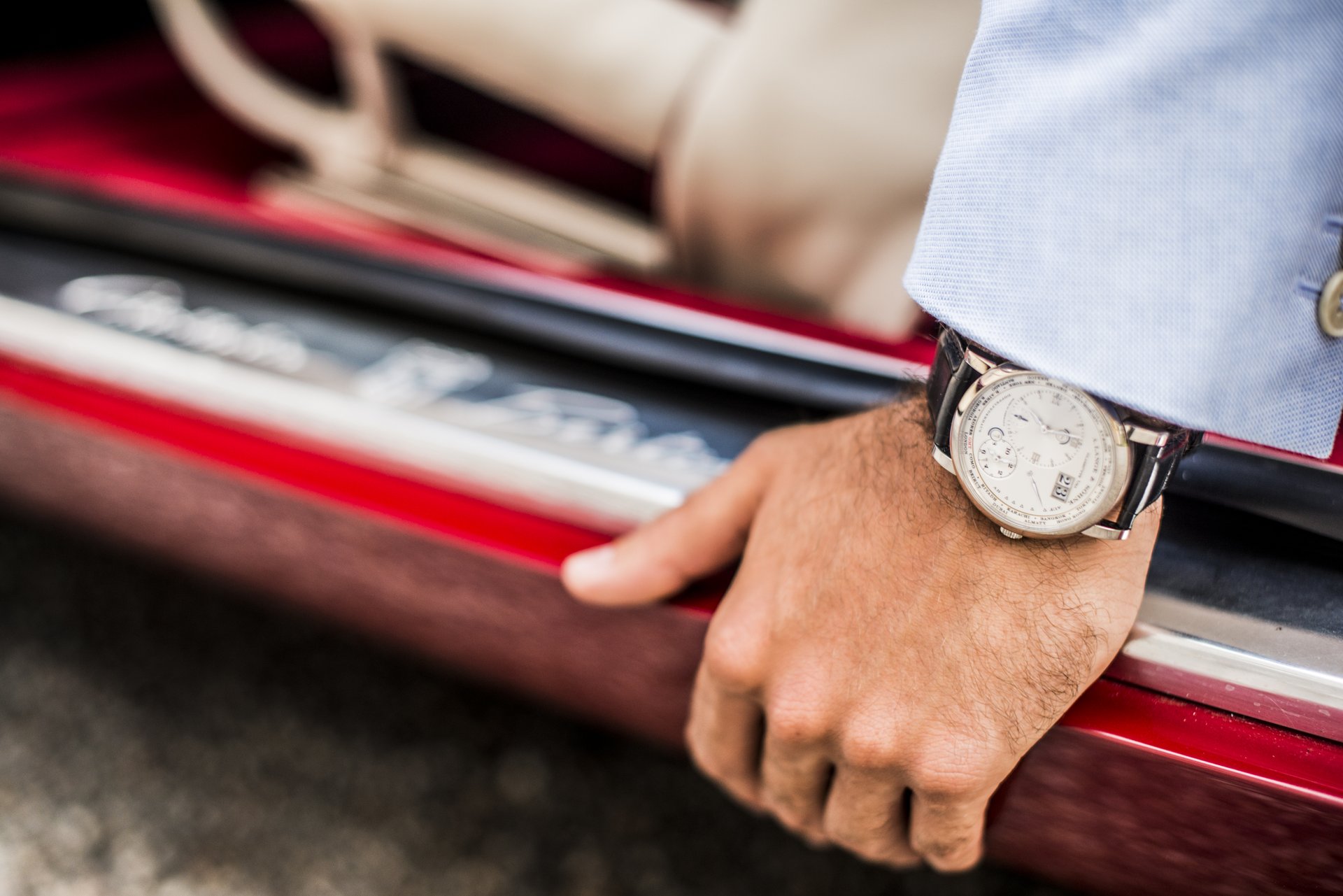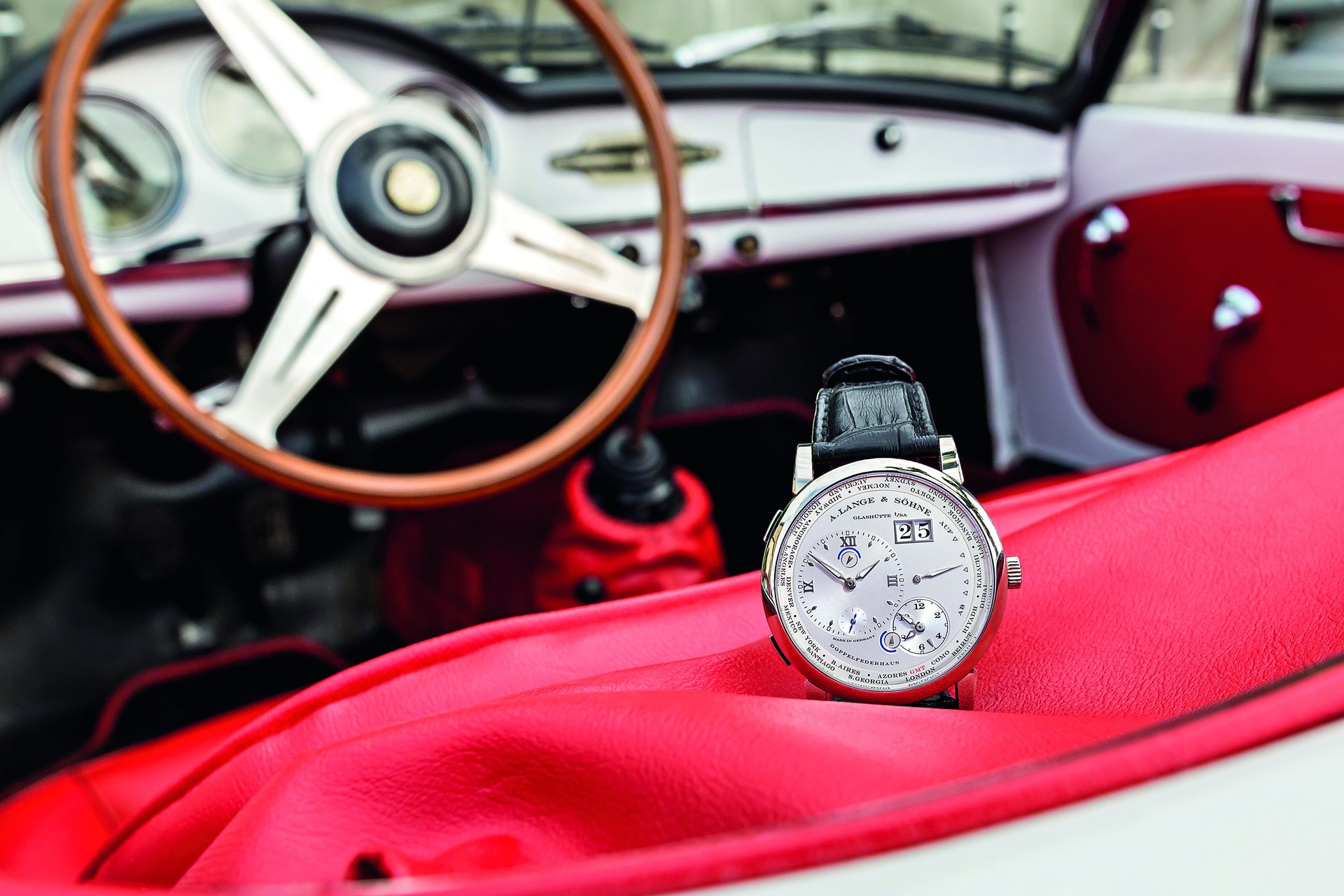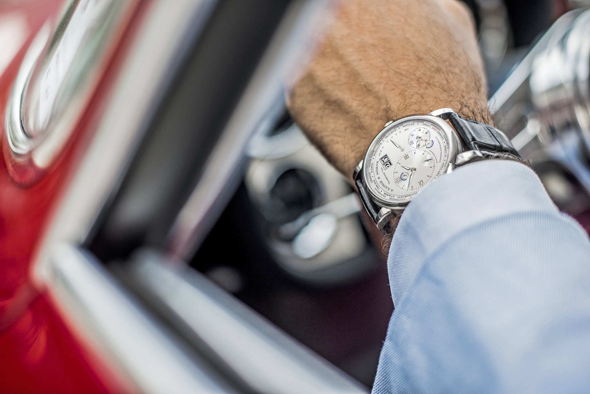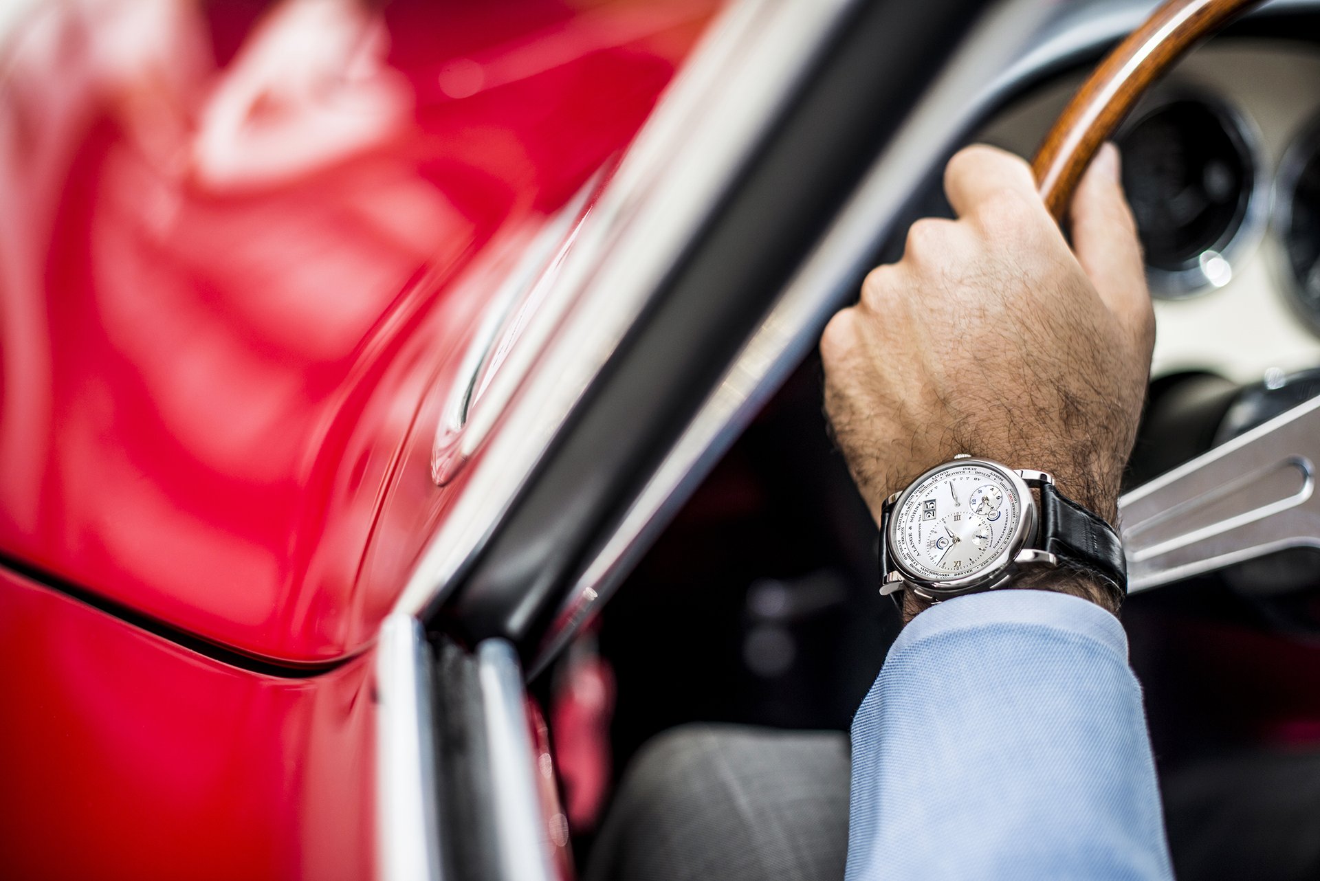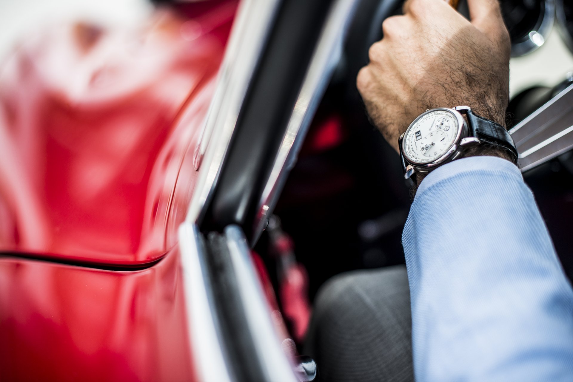 Duccio Lopresto: The LANGE 1 TIME ZONE is a unique piece of art. It showcases the best engineering and manufacturing qualities available in watches today. The beautiful design is priceless, too. It is completely different from any other watch. This is why I love it so much; it is just like a one-off custom-built classic car. Something you do not buy for investment, but because you want to own something special, to feel special. I can fit this watch into this specific mindset. Watches and cars have a lot in common – beauty, engineering, manufacturing and more –and this watch is surely something I would definitely associate with cars from our collection.