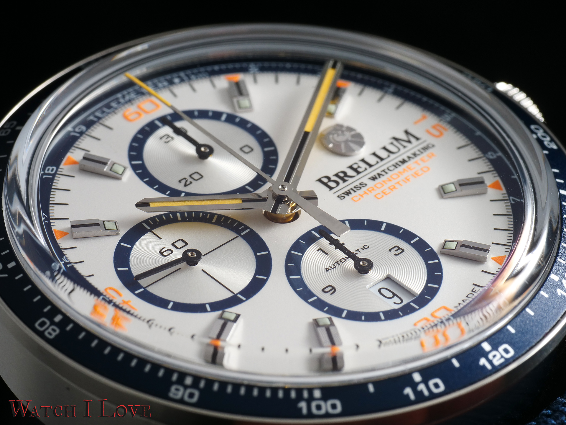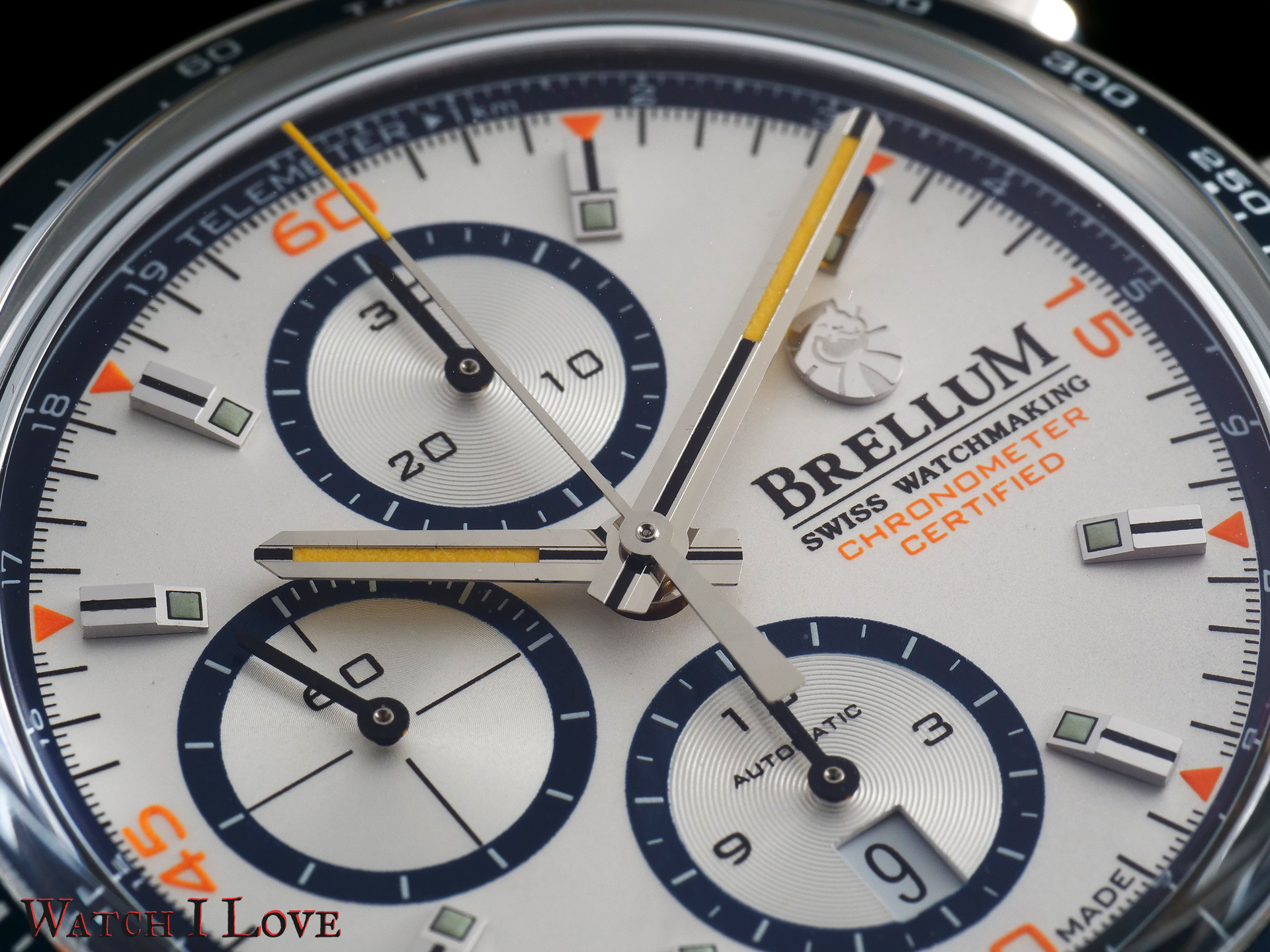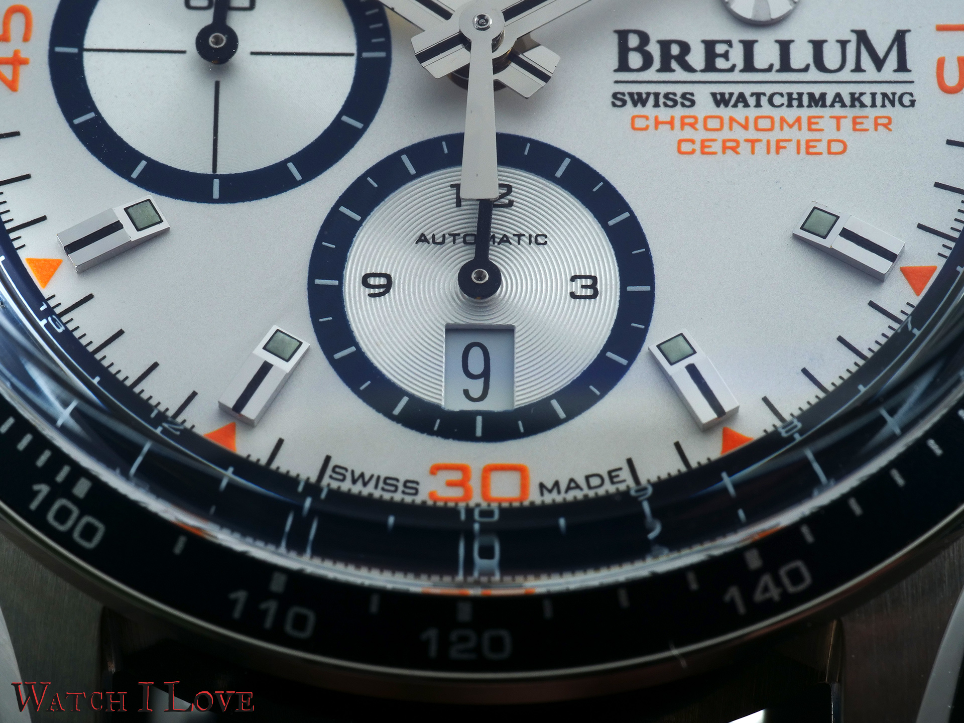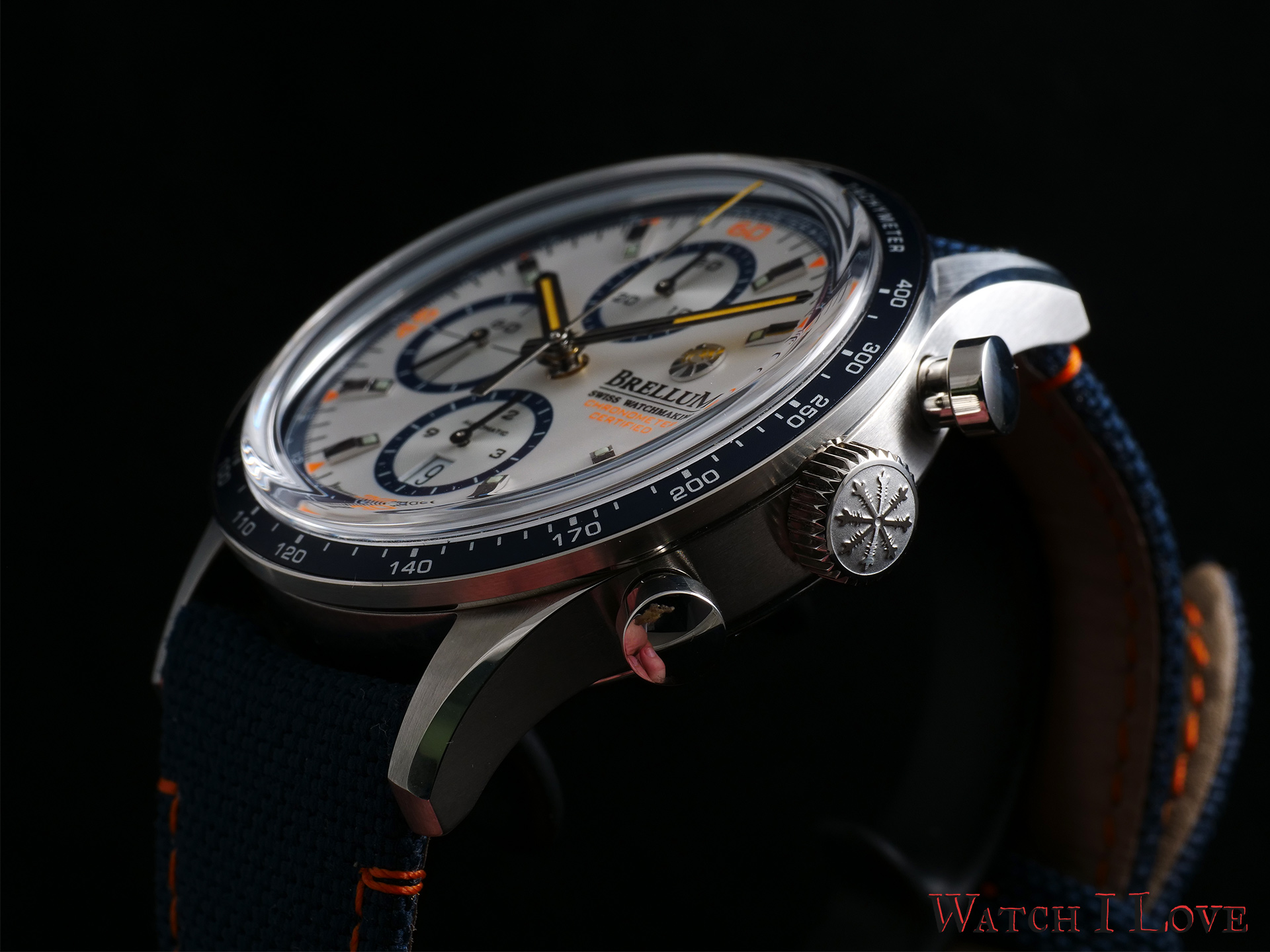 The chronograph’s seconds have extra decorations with orange elements: Roman numerals for every 15 seconds and indexes for every 5 seconds. Together with the “Chronometer Certified” inscription, these orange accents create a joyful atmosphere.