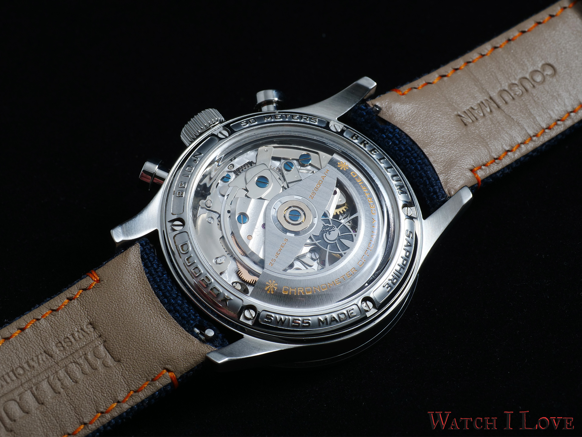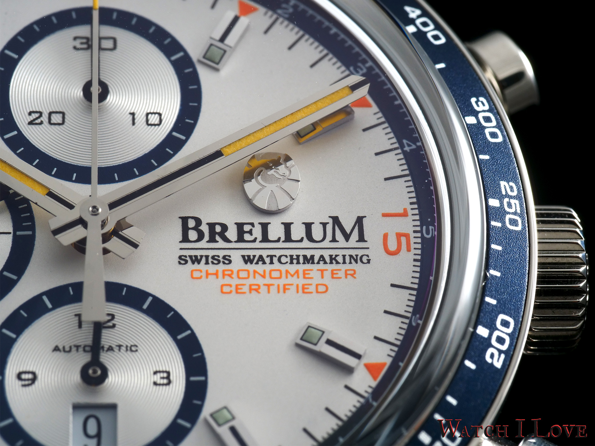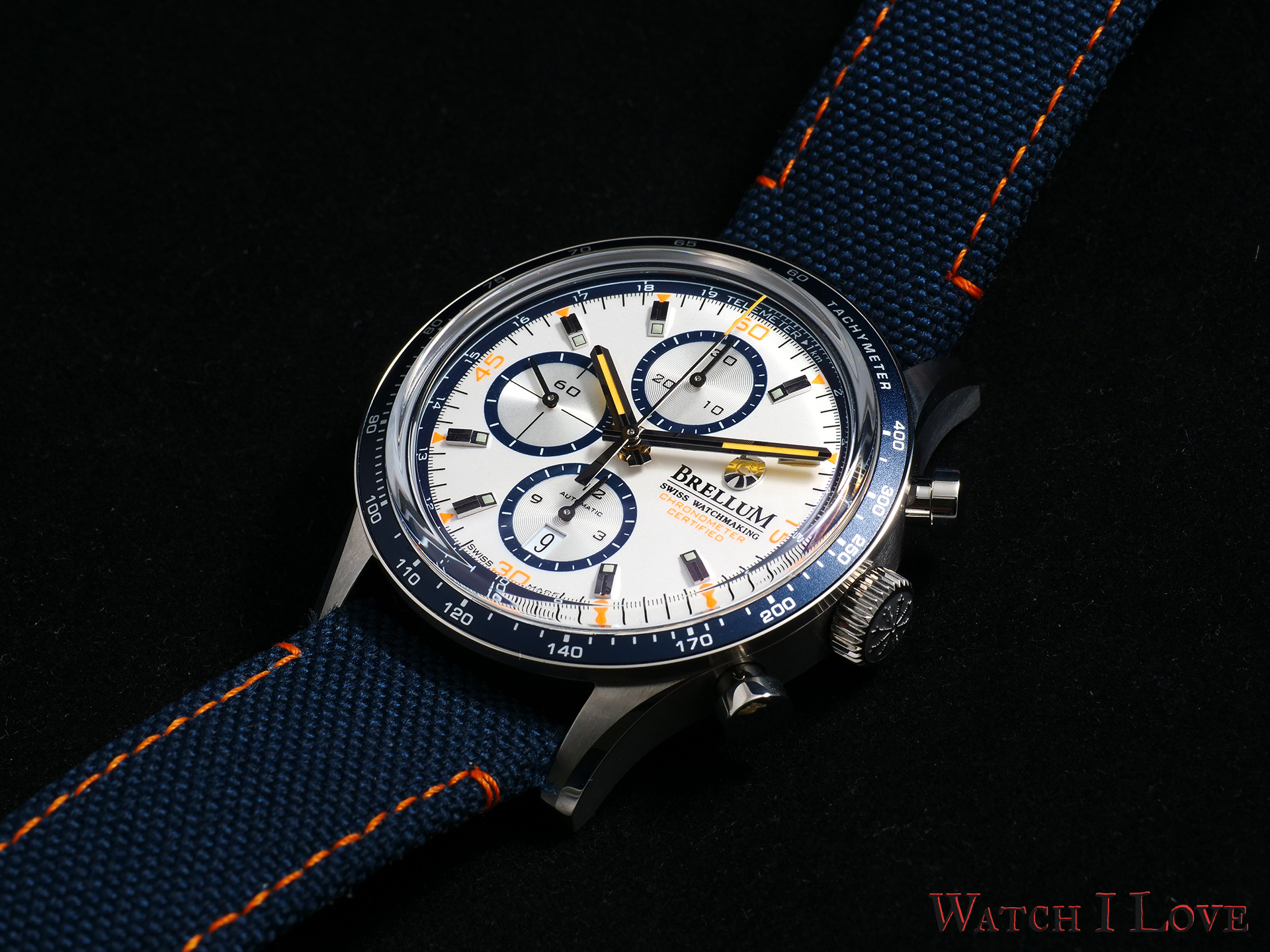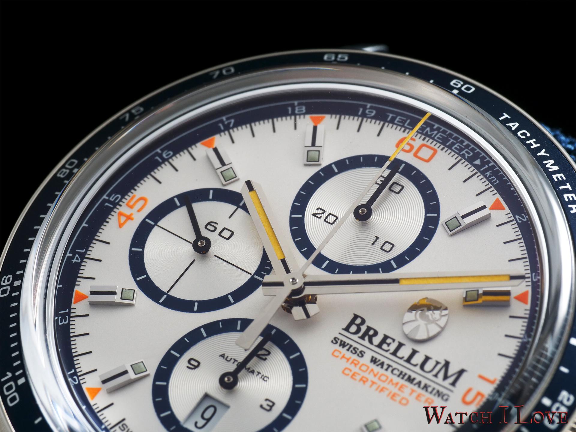 The chronograph’s seconds have extra decorations with orange elements: Roman numerals for every 15 seconds and indexes for every 5 seconds. Together with the “Chronometer Certified” inscription, these orange accents create a joyful atmosphere.