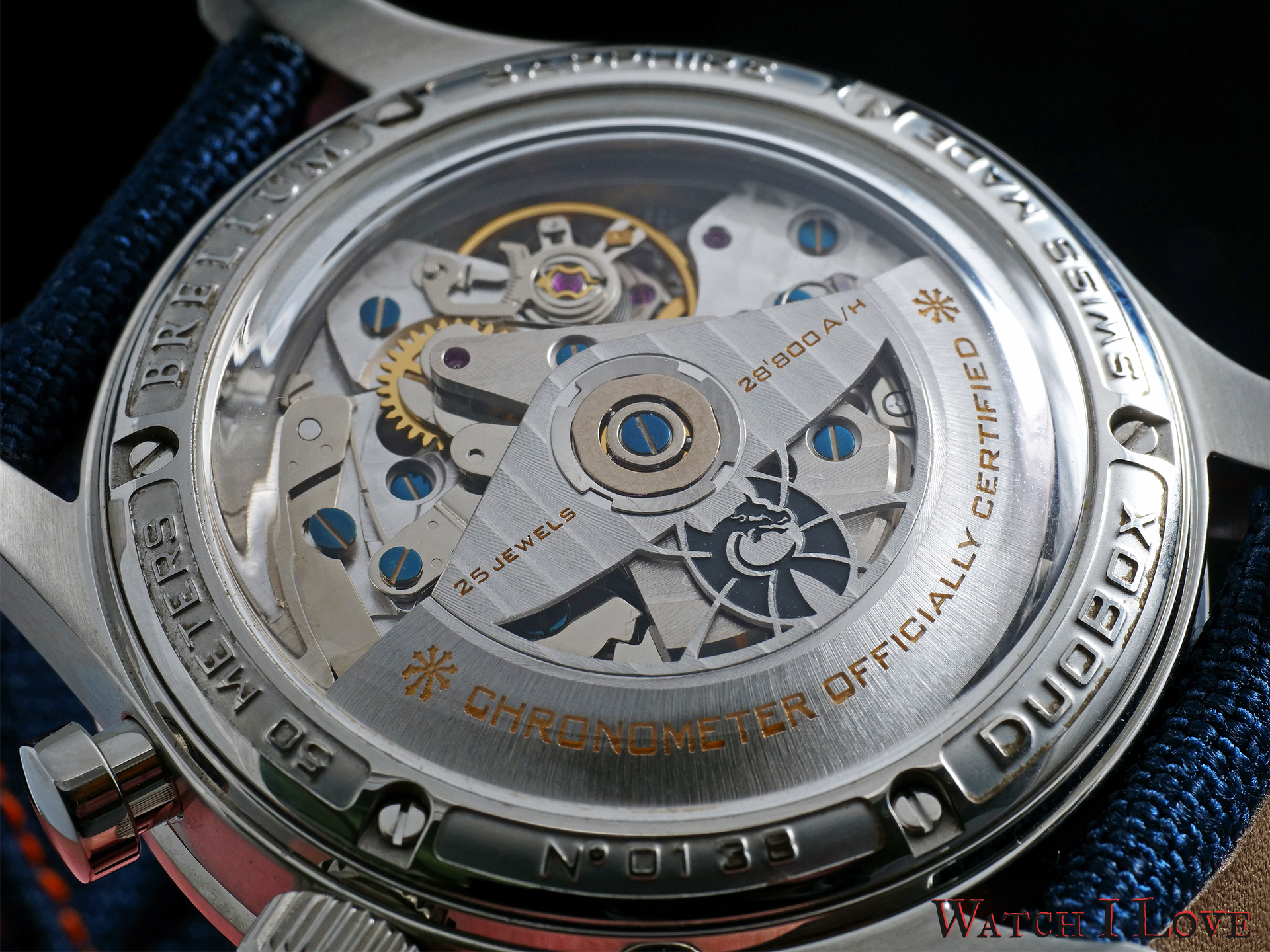 The movement is machine decorated. The rotor weight features the Brellum signature. The finishes used are perlage, Cote de Geneve, brushing and blue screws. The movement is a pleasant appearance under the box sapphire.