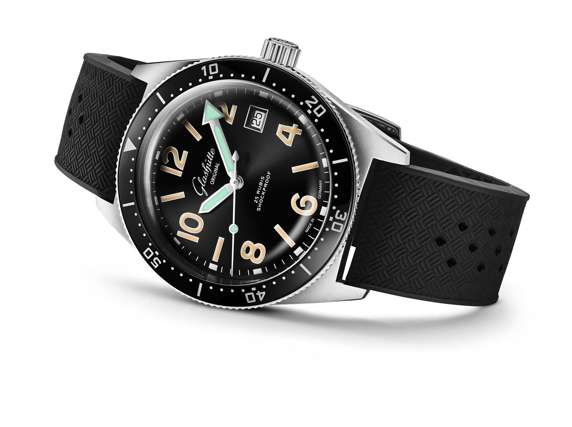 The SeaQ by Glashütte Original is available in two versions: as the SeaQ in both a limited and an unlimited version, and as the SeaQ Panorama Date with black or blue dial. The “Spezimatic Type RP TS 200”, developed specifically for sports divers, served as an ideal example and inspiration for the new diver’s watch.