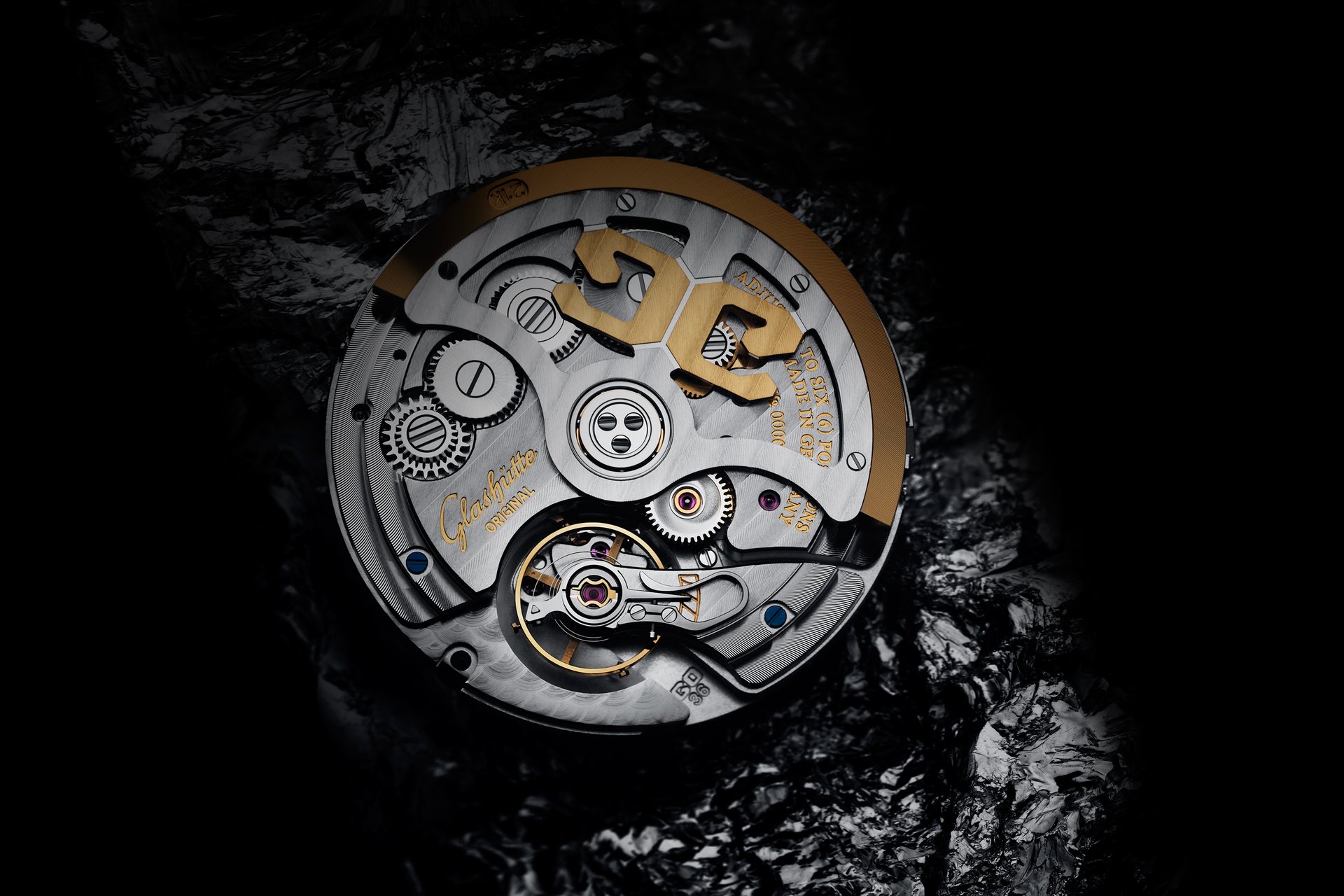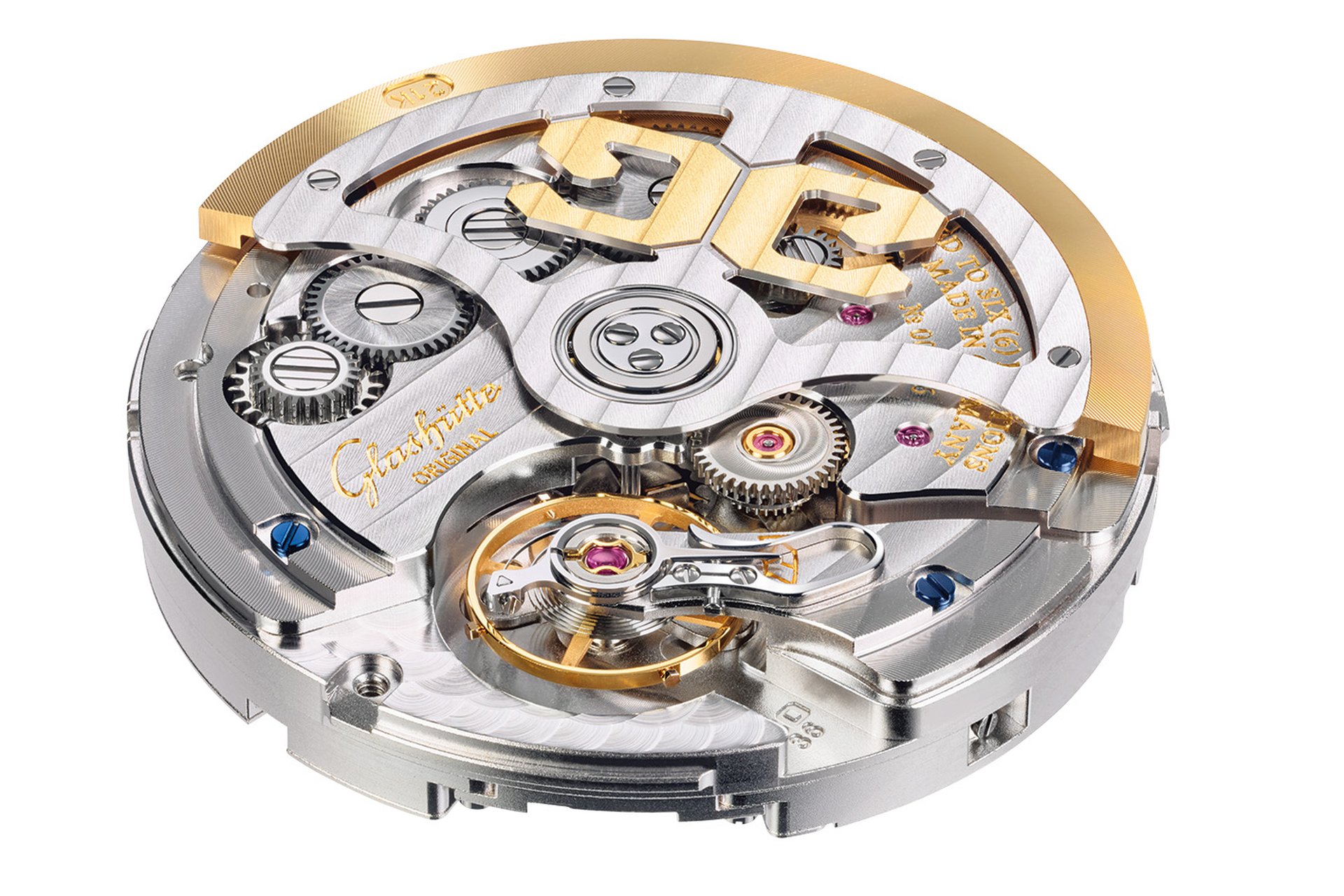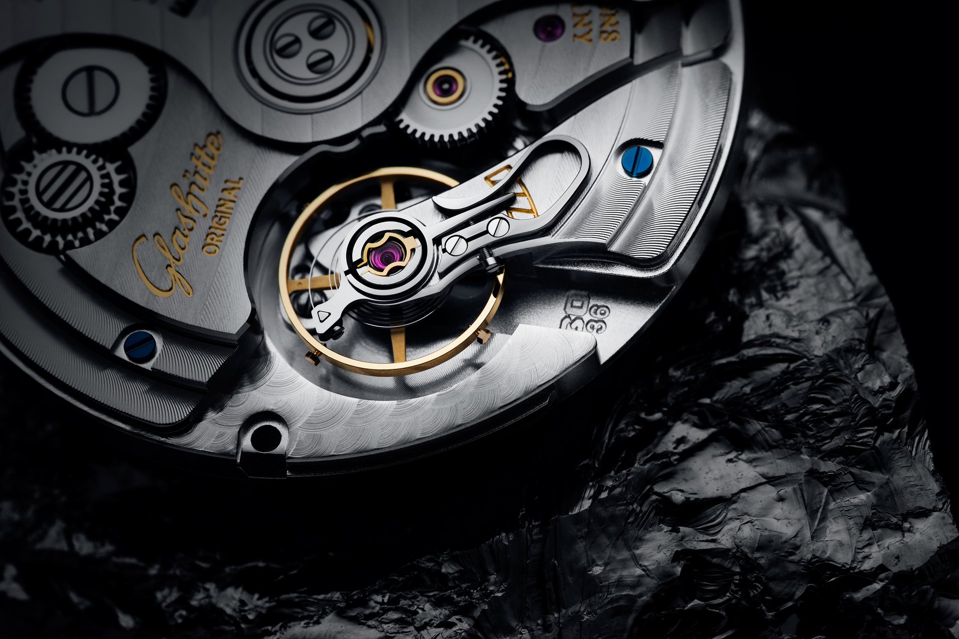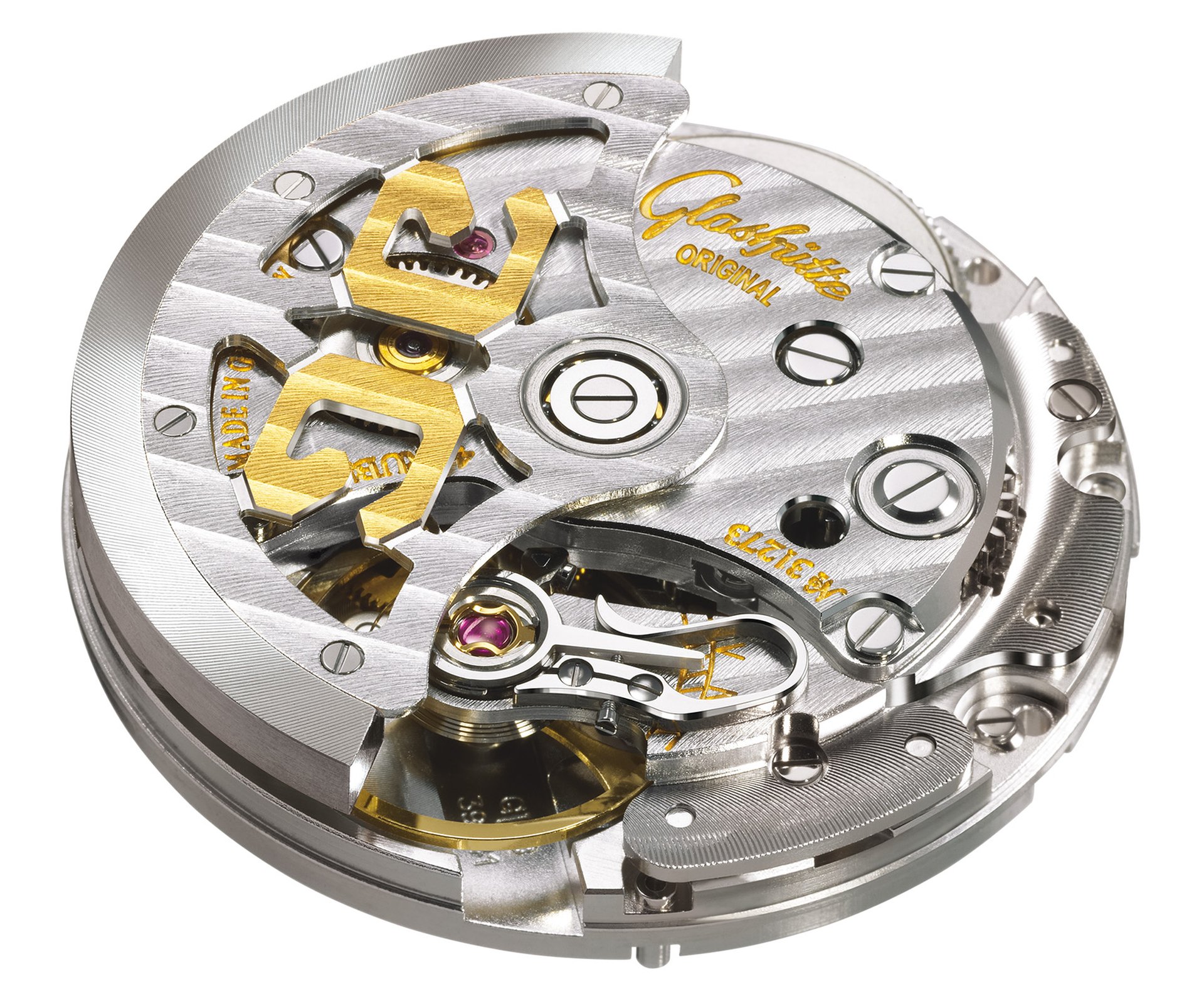Additional details: Automatic movement, hour/minute/second (central), second stop, date, exquisitely finished movement, skeletonized rotor, bevelled edges, polished steel parts, polished screws, Glashütte stripe finish, swan-neck fine adjustment