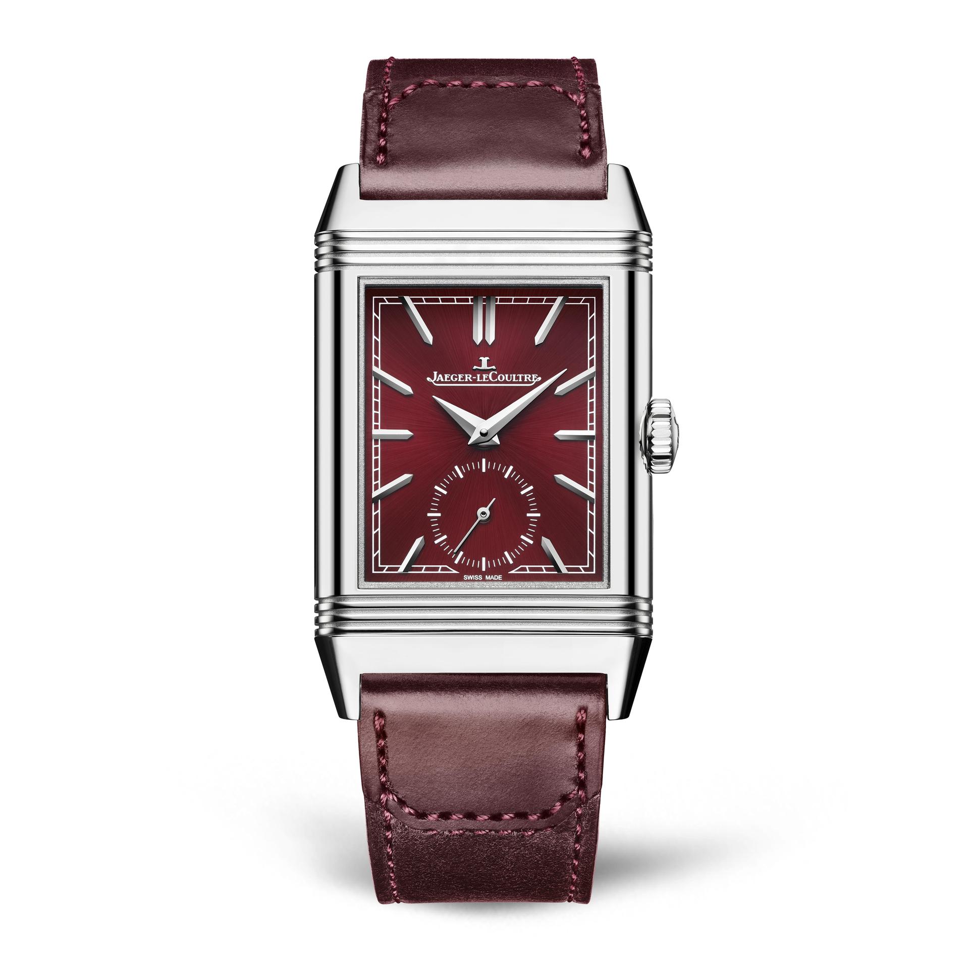 To achieve flawless aesthetics and extra sophistication, on the Reverso Tribute Small Seconds the Manufacture’s craftsmen have matched the shade of the sunray-brushed dial to the leather strap. Dressed in shimmering wine tones accentuated by topstitching, the strap has been designed by Casa Fagliano. It serves as a clever nod to the shared polo heritage of the Reverso and the famous Argentinian boot maker, which is intimately involved in international polo championships.