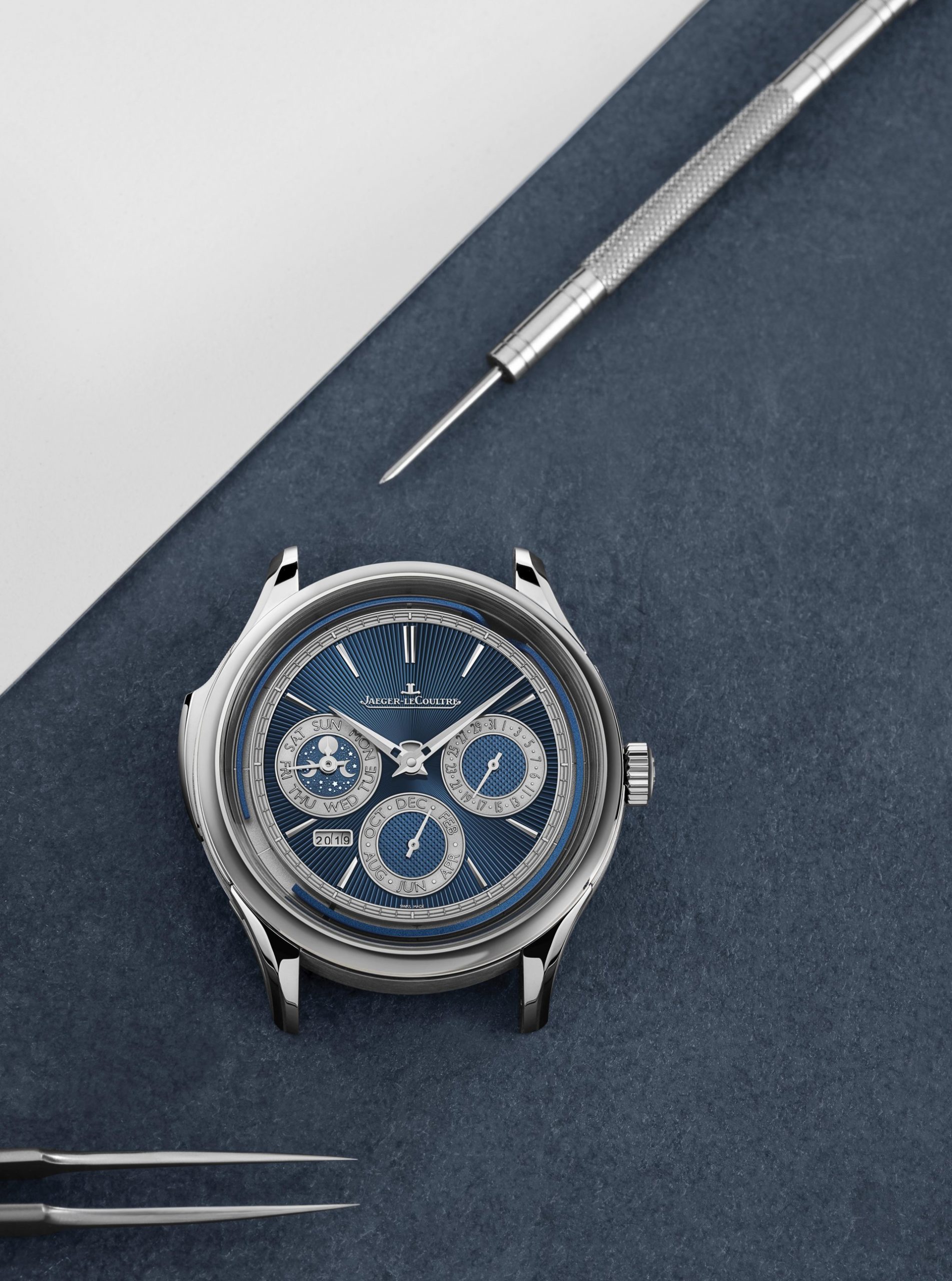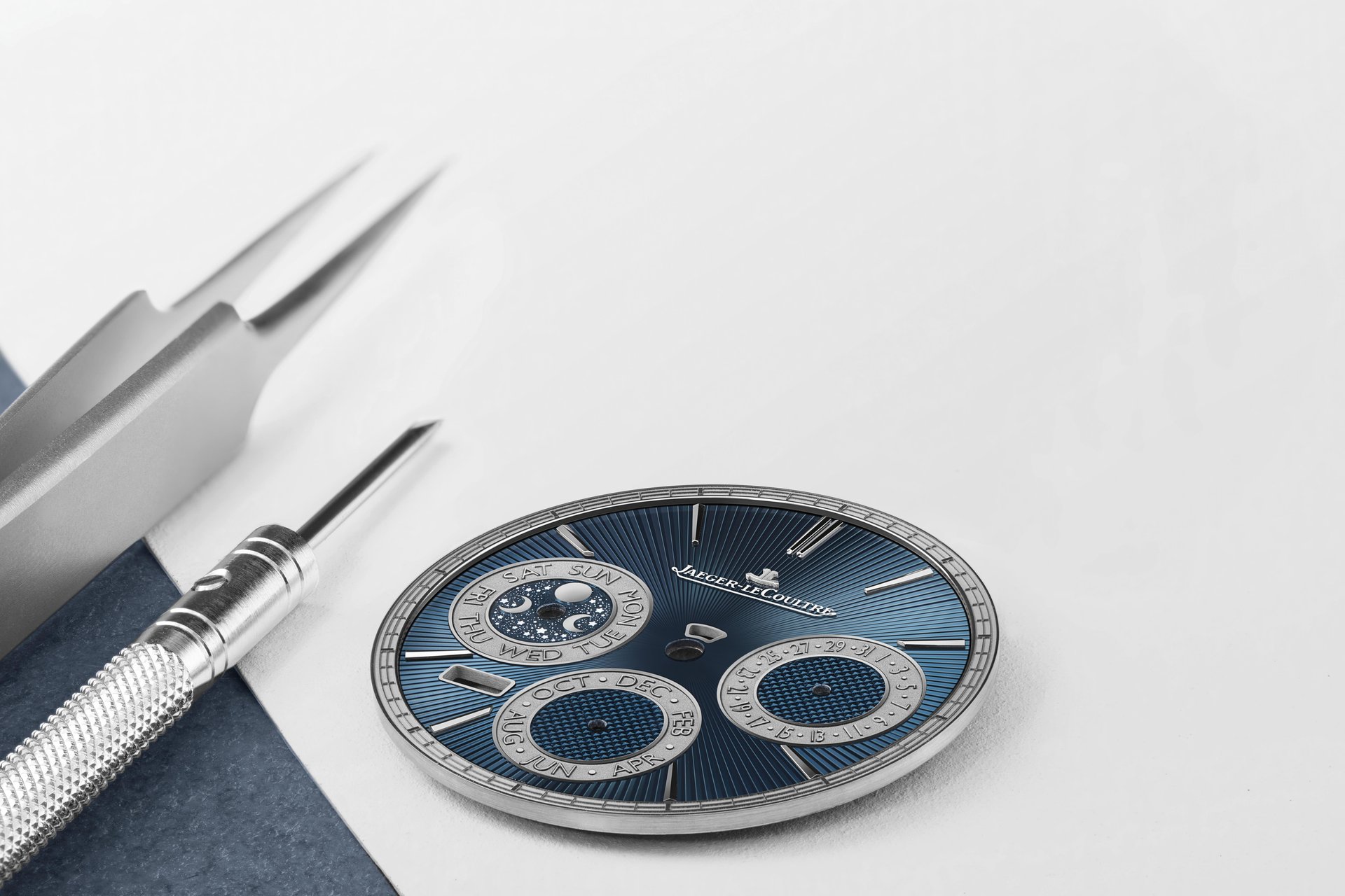 A dial of solid white gold is first decorated with guillochage on century-old rose engines, each round of guilloché work repeated several times in order to achieve the correct depth of engraving. The perpetual calendar counters are then precision laser-welded onto the dial, before the remaining spaces are filled with translucent enamel in another multi-stage process. The enamel is then polished, resulting in the final dial of shimmering vitreous blue that changes in hue with the light and angle.