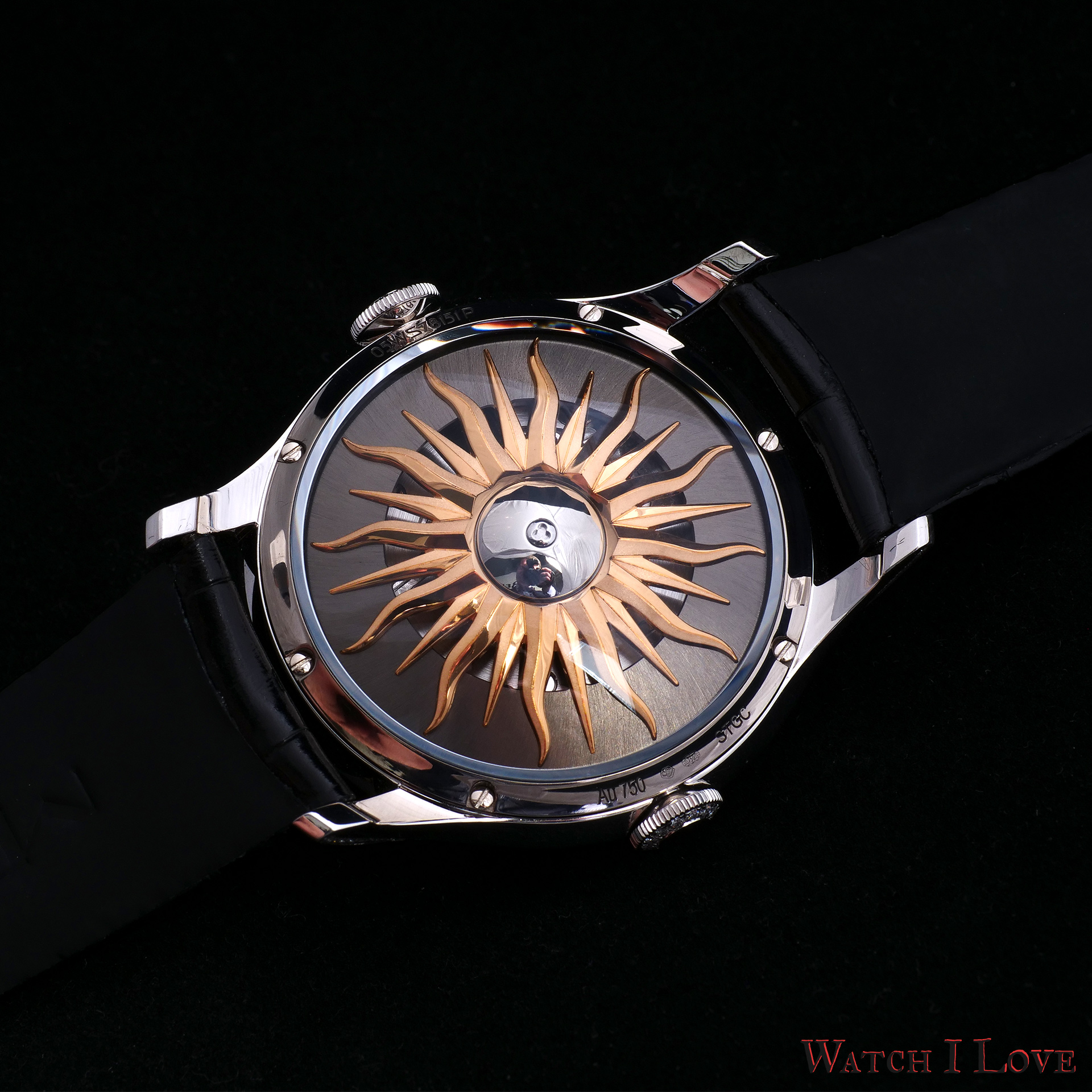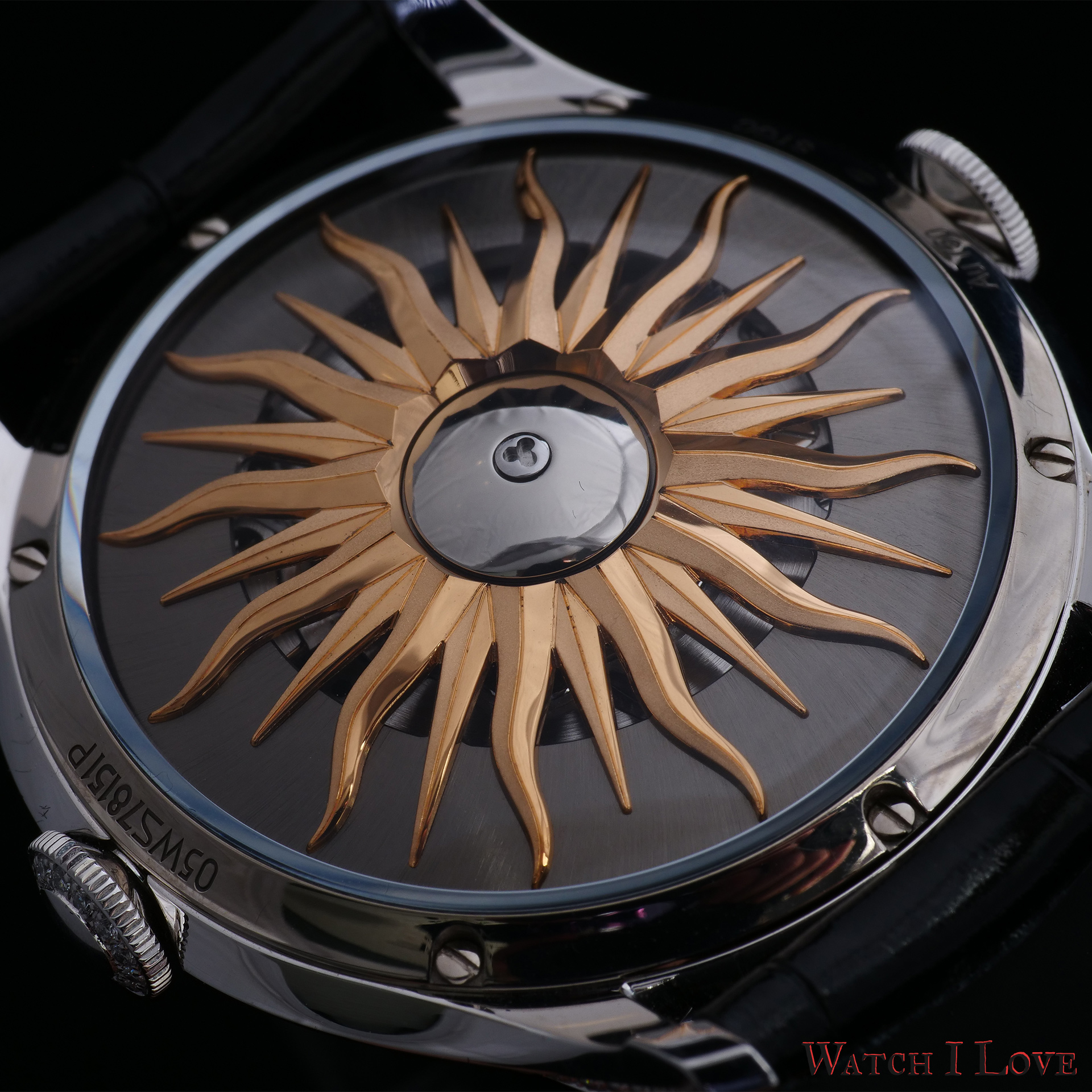 - Three-dimensional sun winding rotor in 18k 5N+ red gold, titanium and platinum.