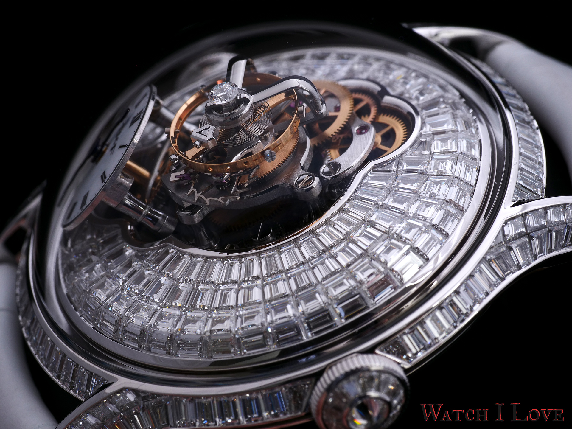 294-baguette diamonds and 3 stones (134-baguette diamonds on the dial, 124-baguette diamonds on the case, 12-baguette diamonds on the buckle, 24-baguette diamonds and 2 stones for the crowns, 1 stone on top of the tourbillon cage). About 8.2 ct.