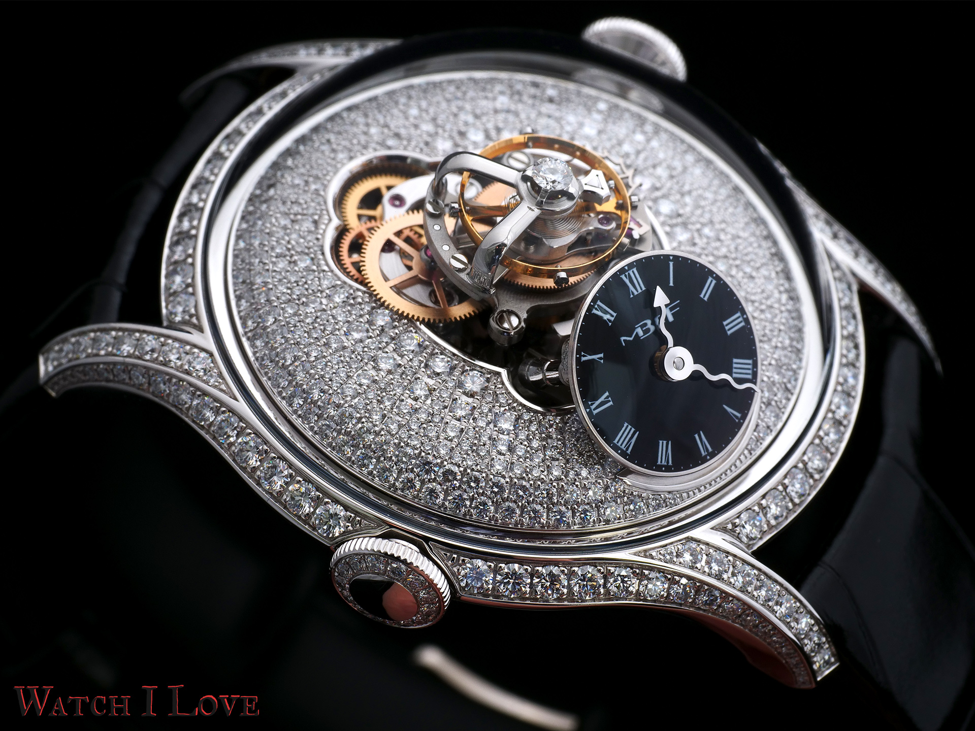 - Three-dimensional vertical architecture, automatic winding, conceived and developed in-house by MB&F