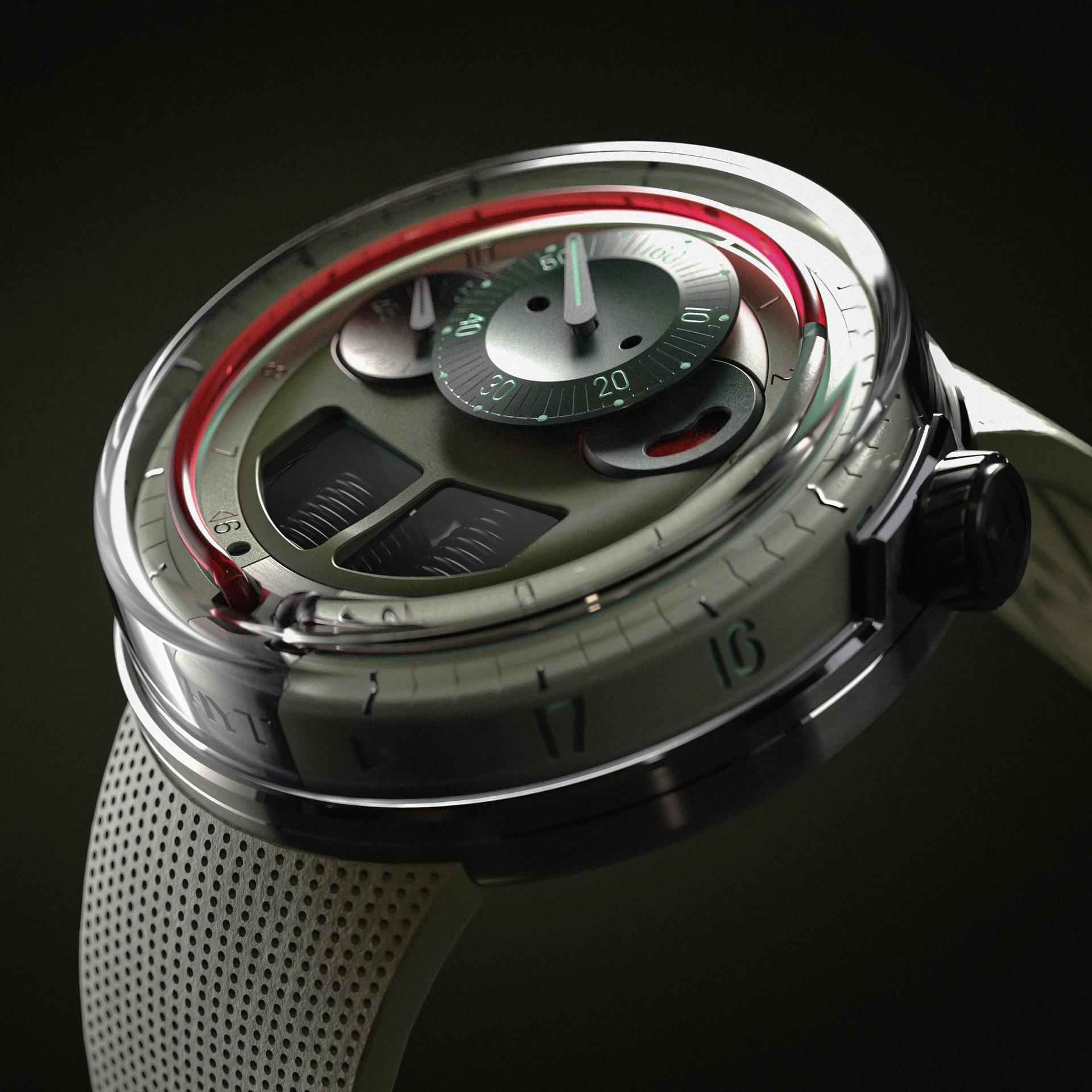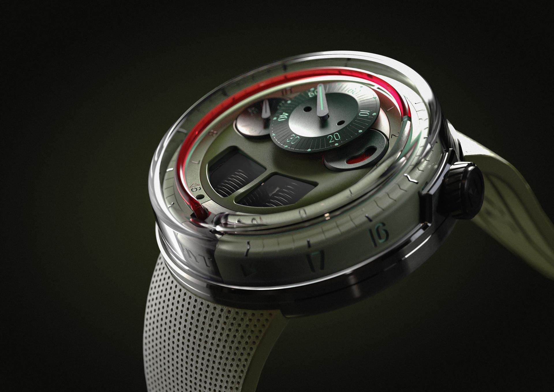 The new H0 model’s take on transience and transparency has two variations. In one of these, a khaki dial and rubber strap stylishly camouflage the DLC anthracite coating of the stainless steel case. Red and pale green complete the colour palette, with the former taking on the essential task of visualizing recently elapsed hours. A slate grey version, with a slight hint of blue, embraces a serene black case and bright accents on the dial for accessible timekeeping. Ebony-coloured liquid shows the now morphing into memories before our very eyes.