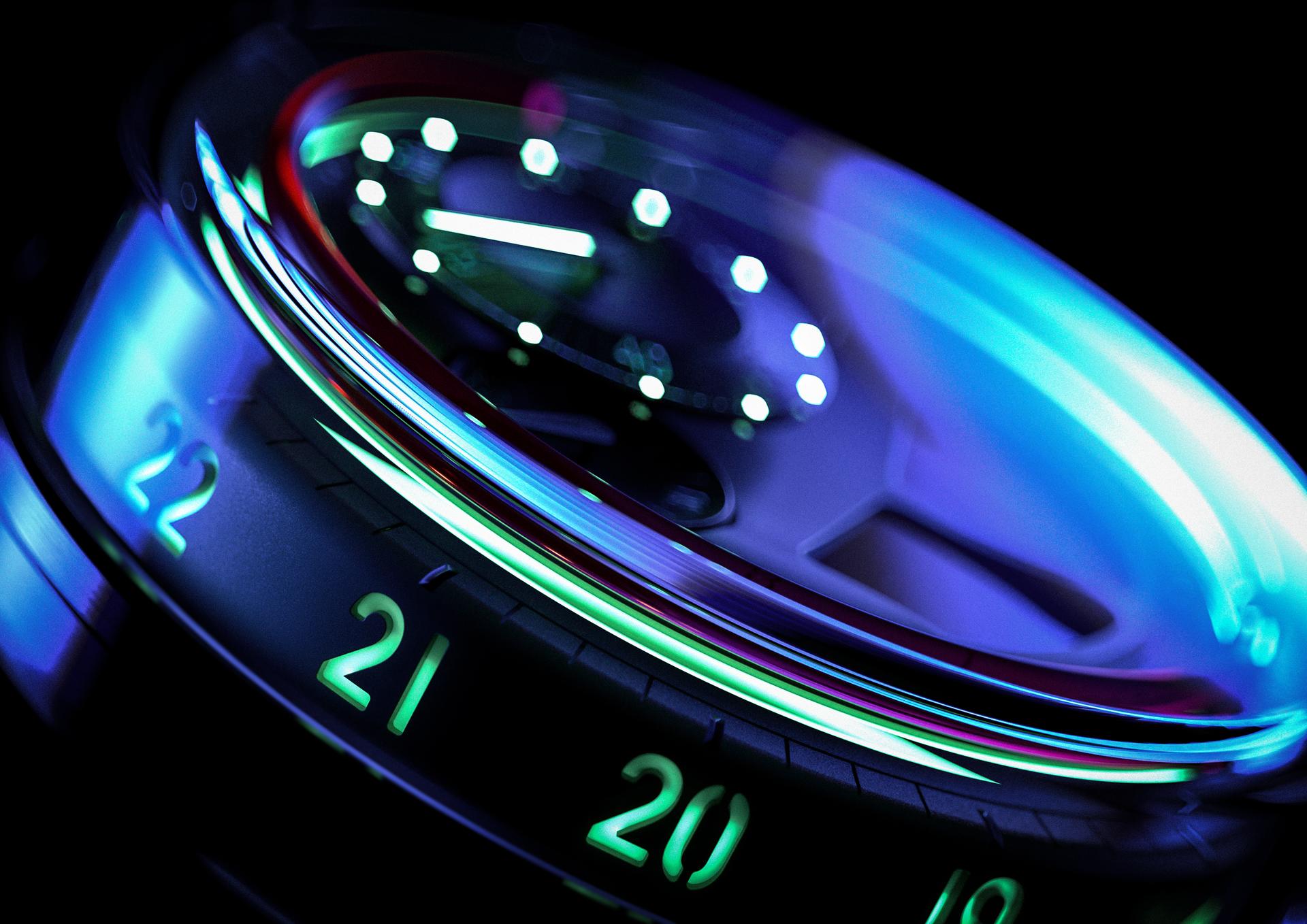 In an era where agendas are prone to overflow, the latest H0 focuses on making time’s flow meaningful. Avant-garde esthetics, with a form resembling a smoothed pebble, a curved dial and the HYT patented fluidic module, are the platform for relevant functionality. Bold digits, marking the passing hours, circumnavigate the side of the case and glow in the dark. This expresses the H0 commitment to three-dimensionality. After all, since when have time and space satisfied themselves with two dimensions or one perspective? An extra visual dimension comes from smoky grey sapphire glass windows in front of the bellows that constitute liquid time’s powerhouse.