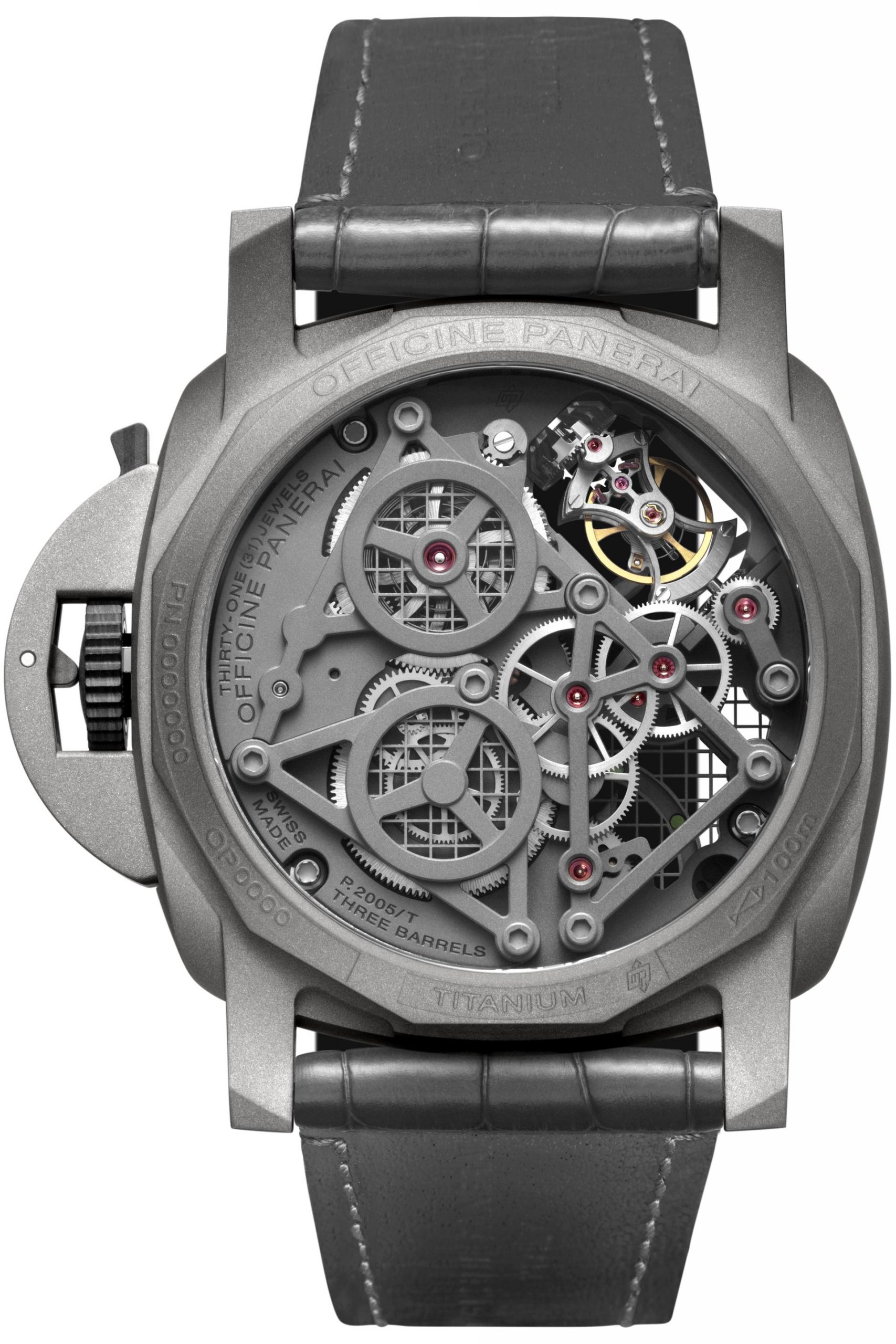 The powerful identity of the Luminor Tourbillon GMT is immediately and unequivocally conveyed by the P.2005/T calibre within it. A hand-wound mechanical Manufacture movement with GMT function, introduced by Panerai for the first time in 2016, it stands out for its unusual, innovative structure, which had never been used before by the Maison. Mechanical interpretation with steam punk influences are all that remain of the conventional layout of mechanical watch, which has been distorted and intentionally stripped to the bone. The result is a minimalist design with an original, modern approach, including its three spring barrels mounted in series (patented) which provide a power reserve of six days. It too is entirely made of titanium; this has helped to restrict its weight to just 23 grams. The result of Panerai’s expressive power and technical skills, it relies for its performance on a tourbillon device with a cage designed to rotate – once every 30 seconds instead of the traditional 60 seconds – on an axis which is perpendicular to that of the balance wheel. This inspired design, developed not to amaze but to compensate for the effects of gravity on the regulator, results in more even running. The movement has now been further developed to display the power reserve indicator on the front of the watch for the first time, a feature which is extremely useful as well as spectacular.