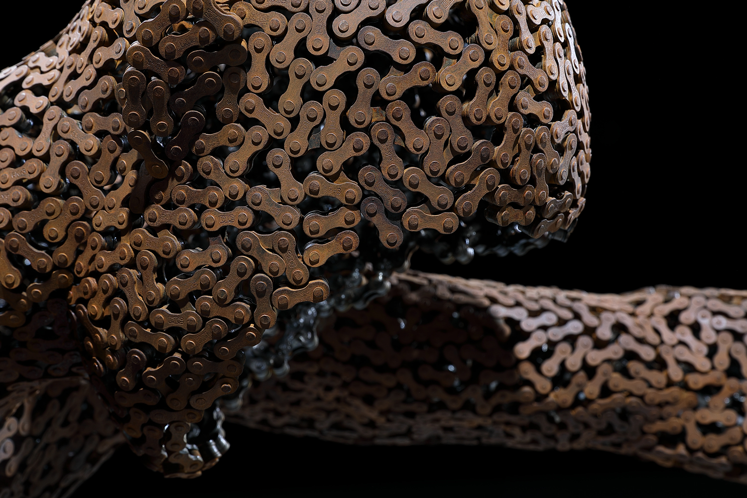 The creation process begins by disassembling and reassembling the bike or industrial chain so that it is in good condition. Then, after the pose and form are clear to him, Young-Deok creates a 3-D model on his computer, followed by a clay or Styrofoam model which is then covered with plaster to create a mould. After the plaster modelling is complete, the chain is assembled link-by-link around and over the mould. The final step is to treat the piece with a special coating.
