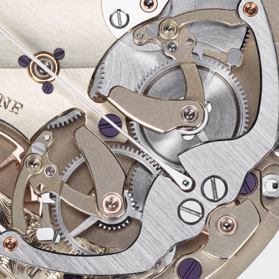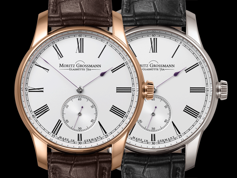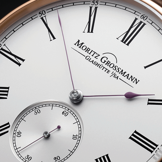 Once again echoing the design of Moritz Grossmann’s pocket watches, the hour and minute hands are extremely delicately crafted and measure just 0.1 mm in width at the narrowest point. At its tip, the second hand is no more than five-hundredths of a millimetre. The hands are manually crafted in the manufactory and annealed over an open flame to achieve the distinctive Moritz Grossmann brown-violet hue.