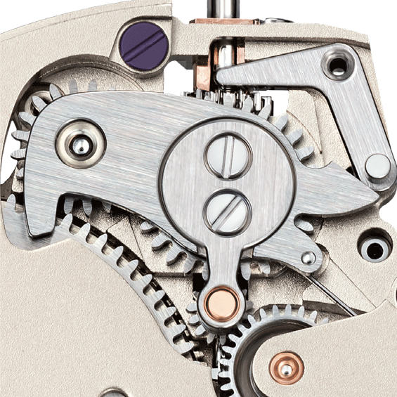 The hammer’s centre of mass is further away from its rotational axis than with a central rotor. This results in a high torque, which in turn caters for powerful winding. Thanks to the special ratchet mechanism, hammer movements from just five degrees can be used to wind the mainspring.
