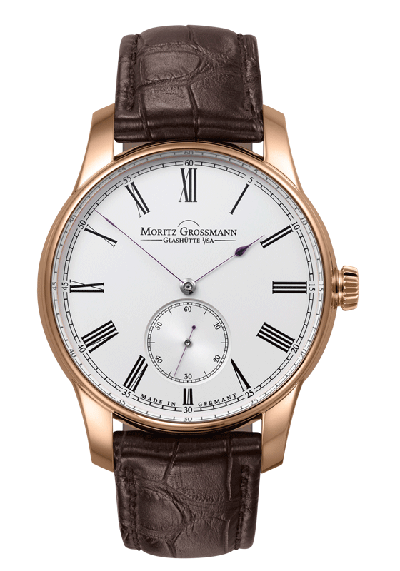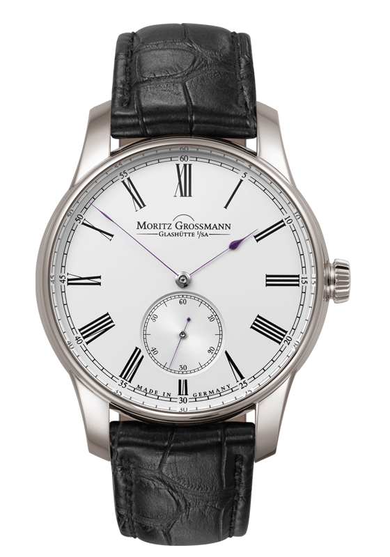 Large, intricately finished Roman numerals adorn the dial, the design of which is reminiscent of the historical pocket watches by Moritz Grossmann. The hands are another nod to the historical models. The hour hand stands out thanks to its pear-shaped tip, while the minute hand moves round the scale in a needle-like, slender design.