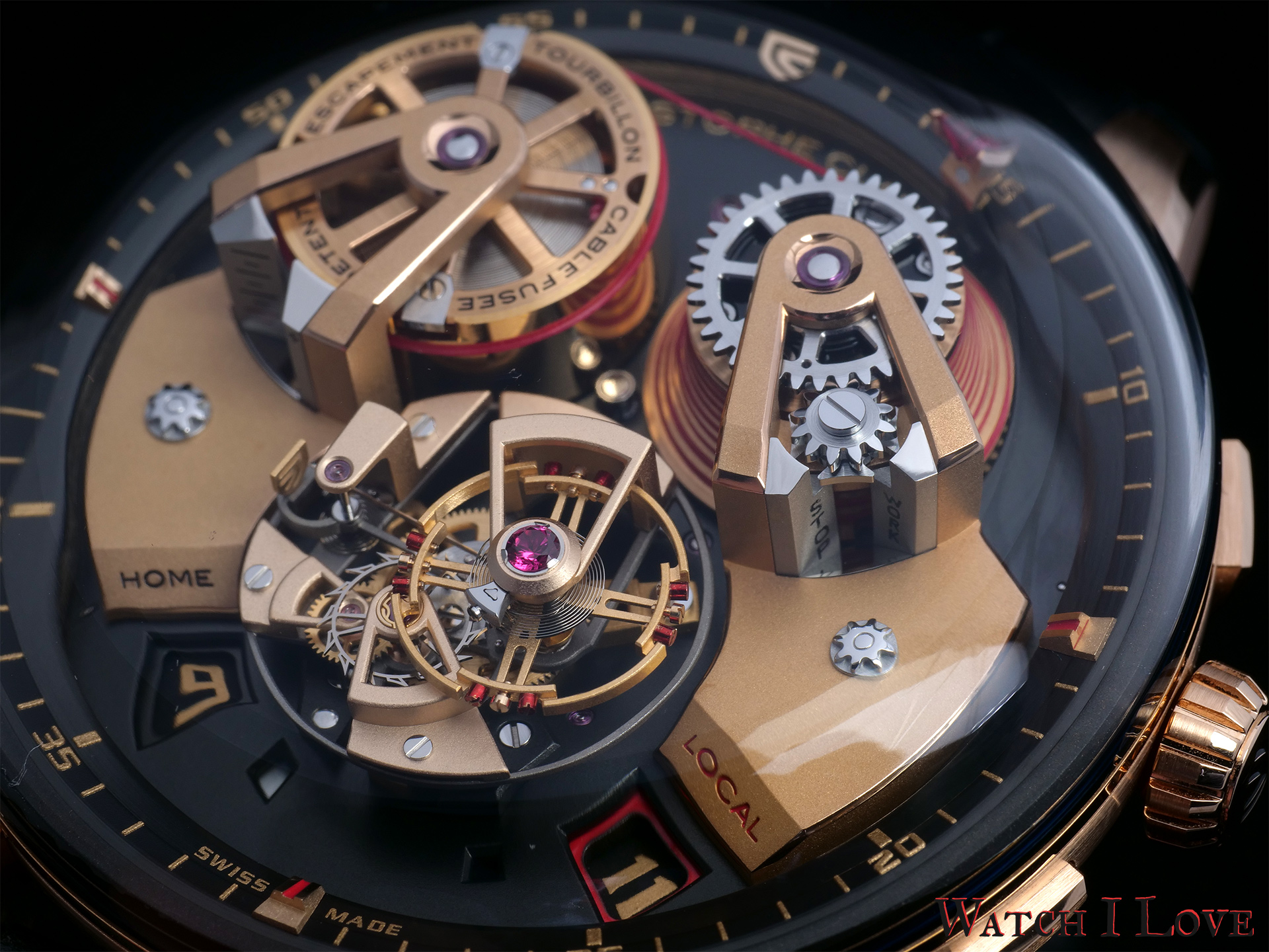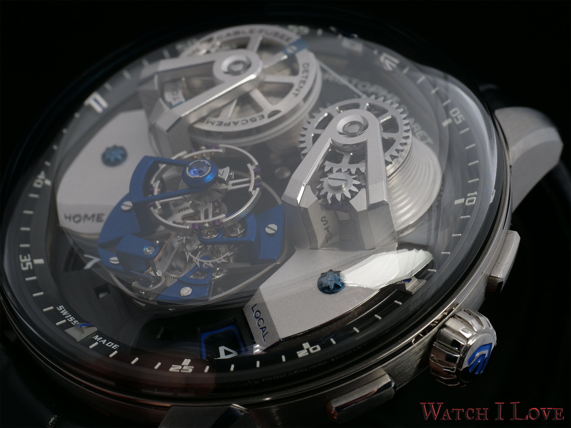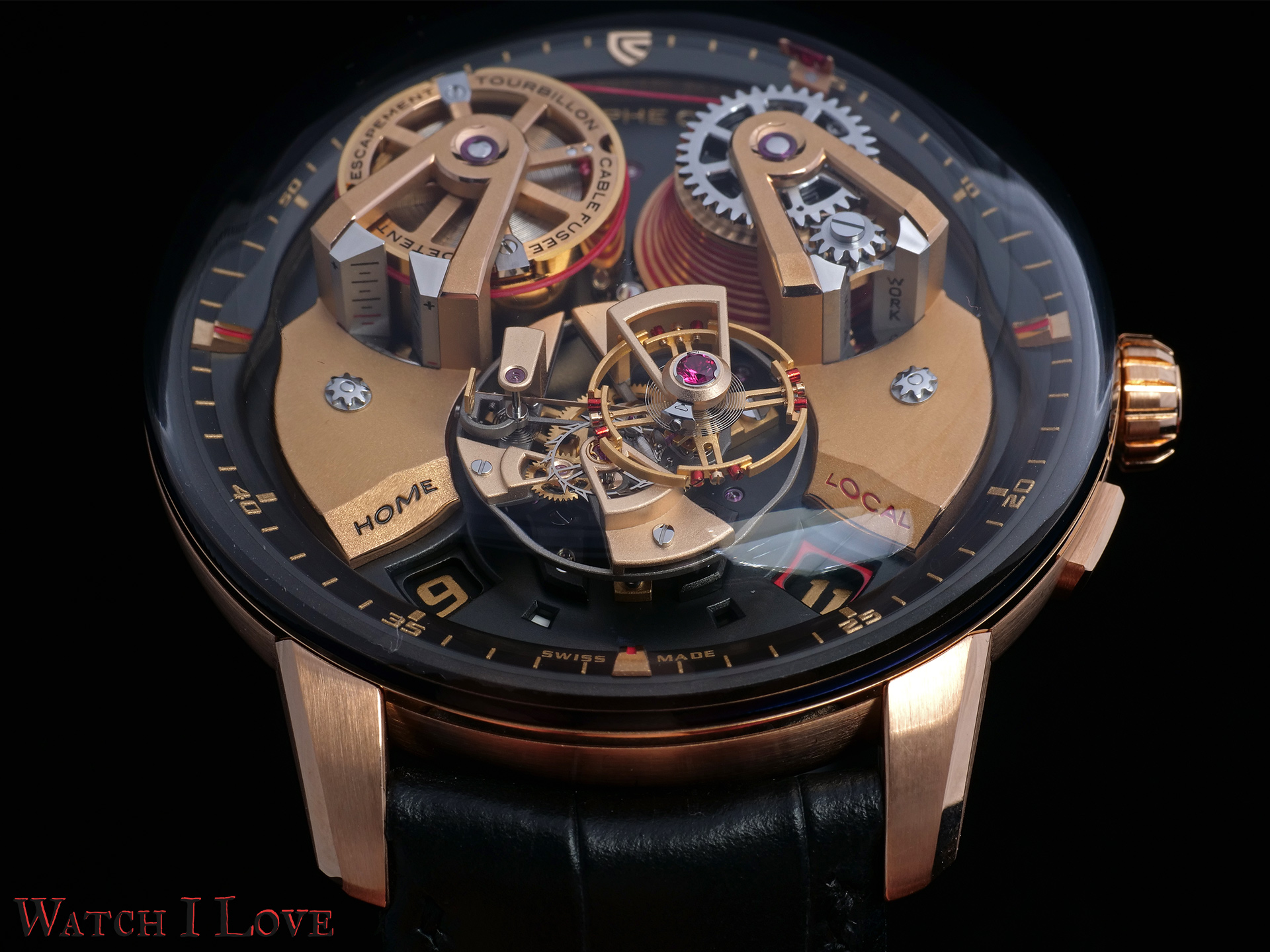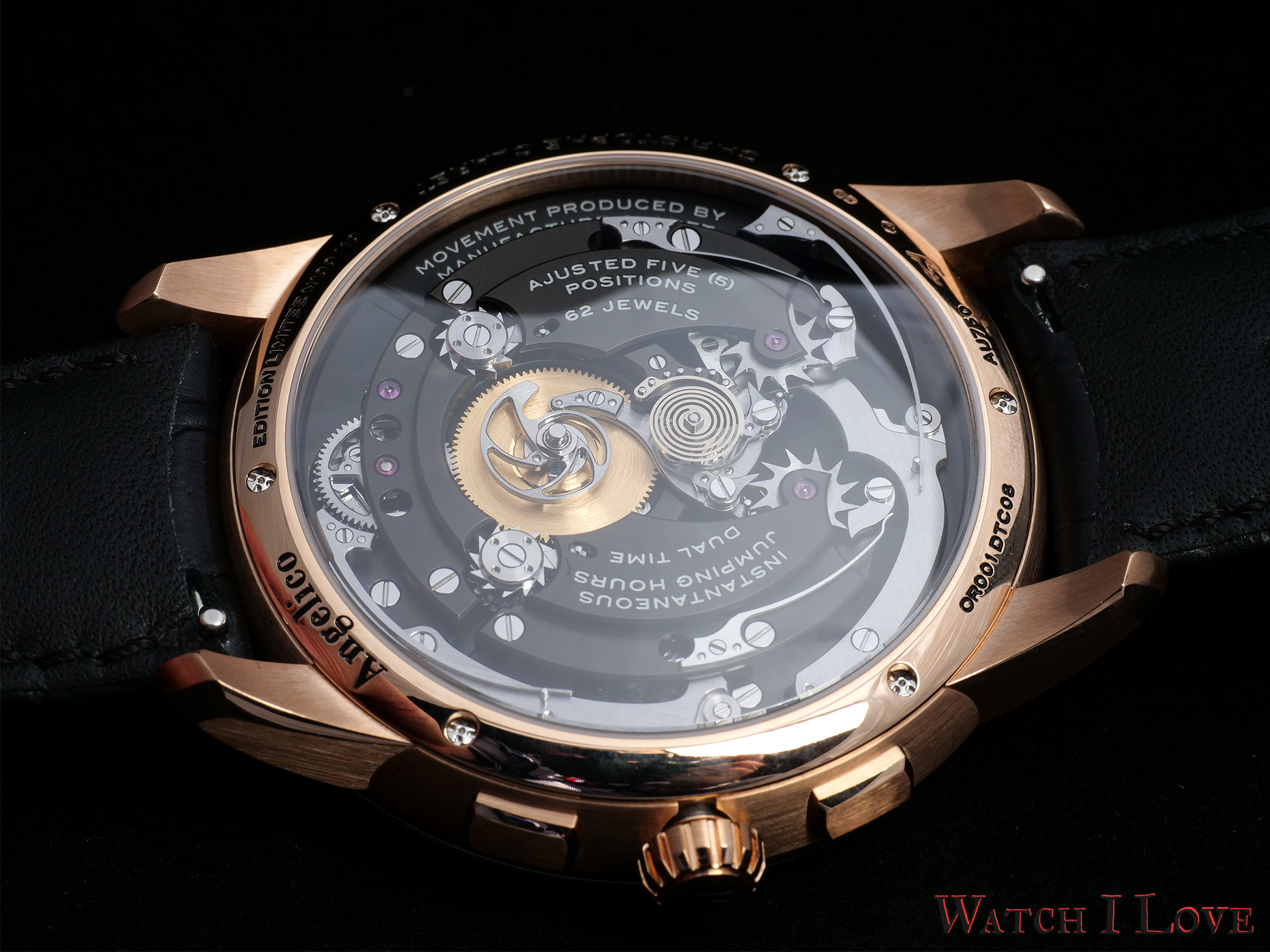 The most important feature of the Angelico is not the time display. Even if the watch is capable of instant-jump dual-time display with day/night indicator. The stars of the show are the 6-minute tourbillon with detent escapement and the cable-type fusee.