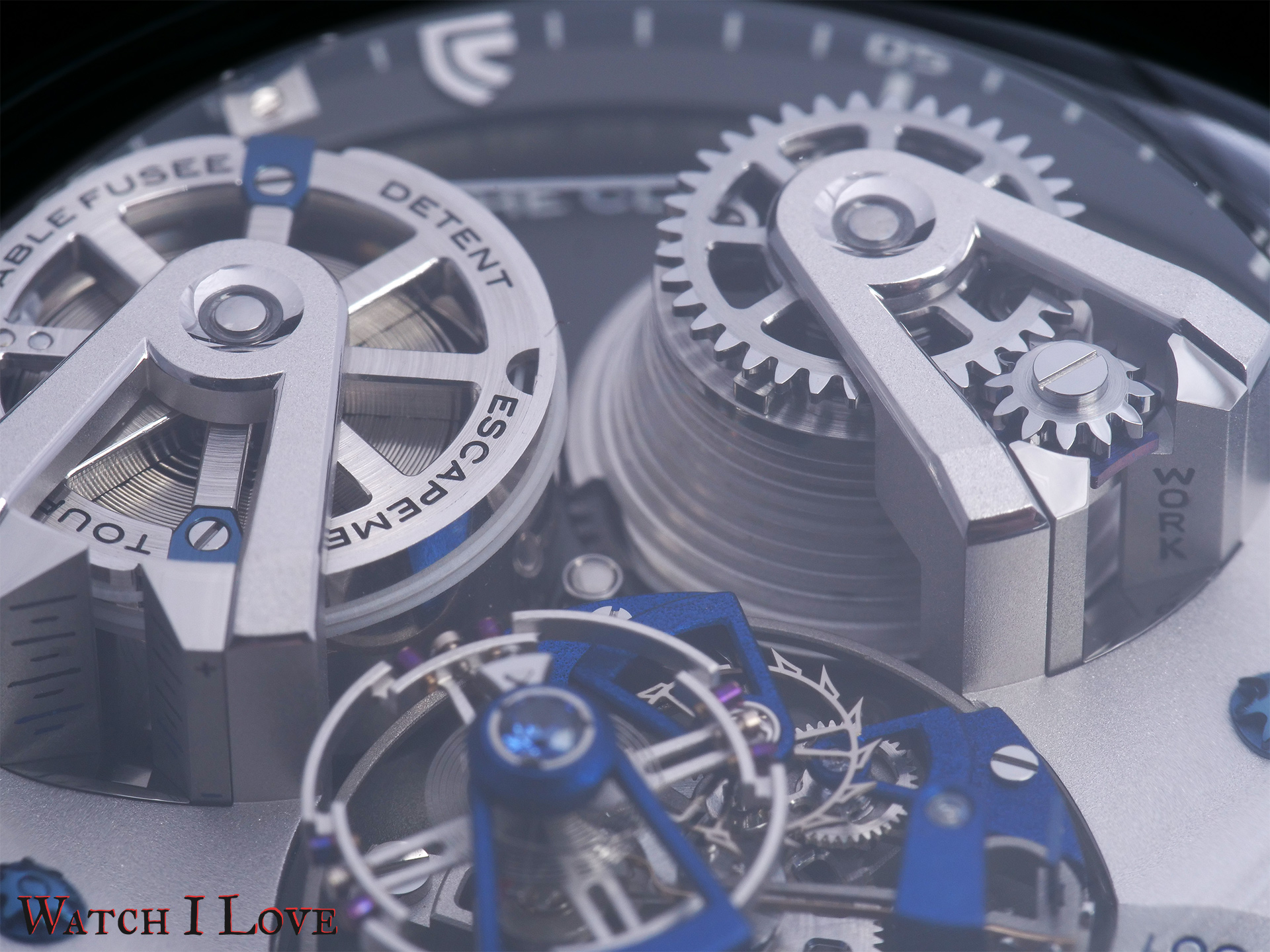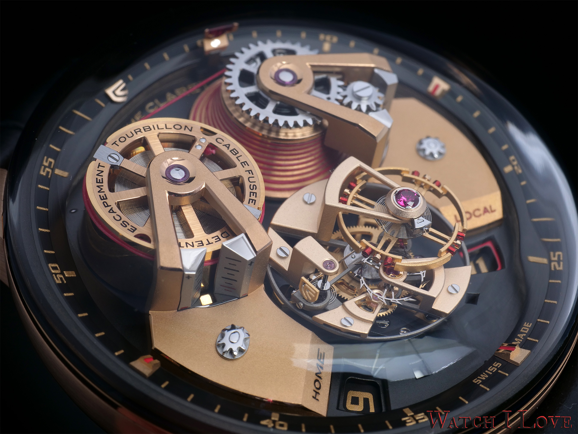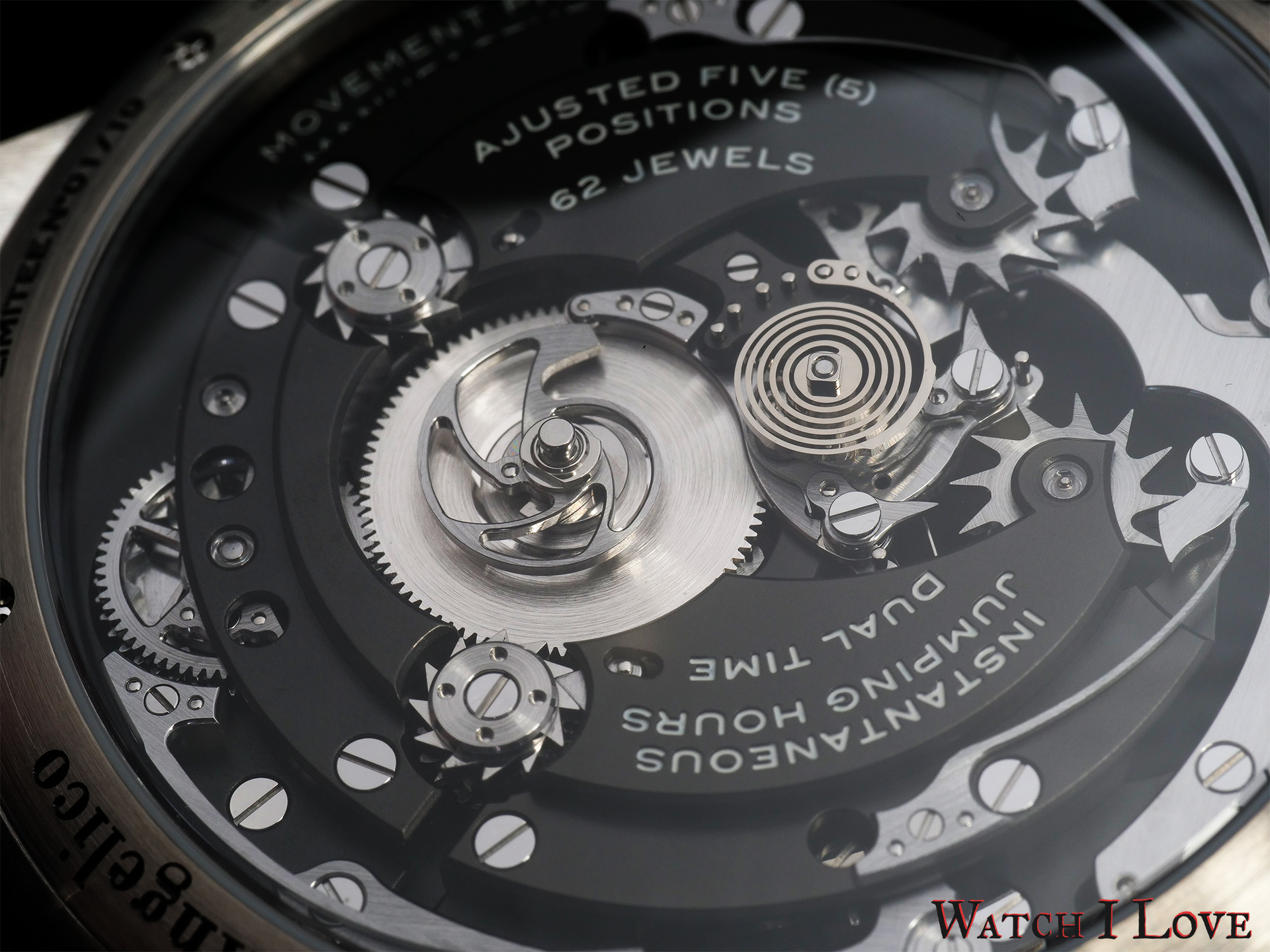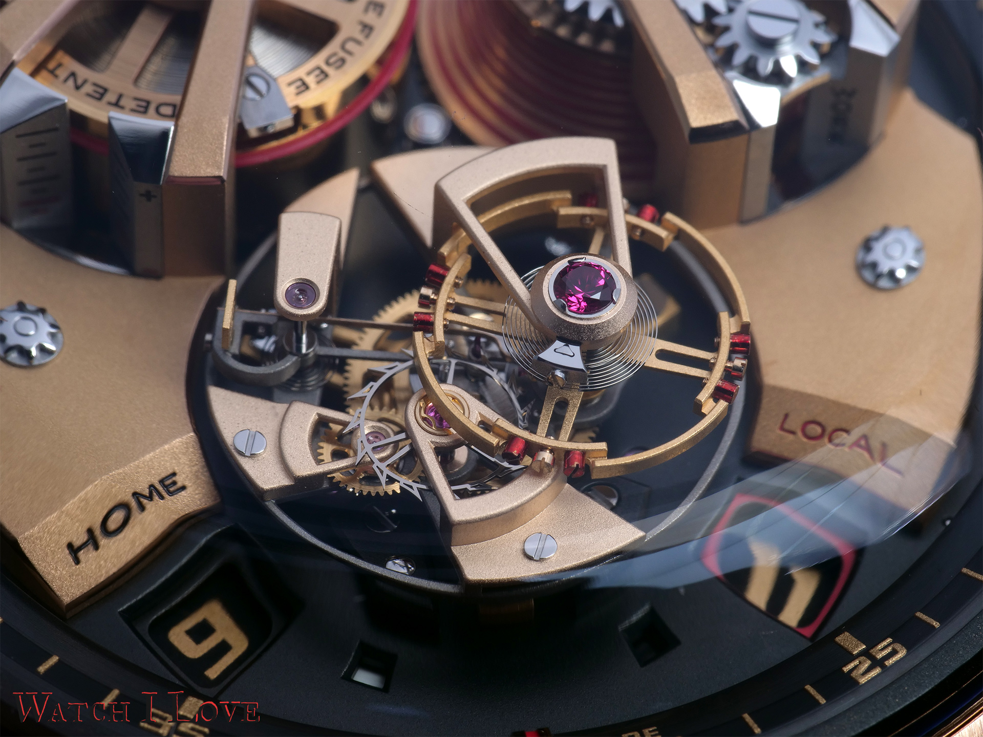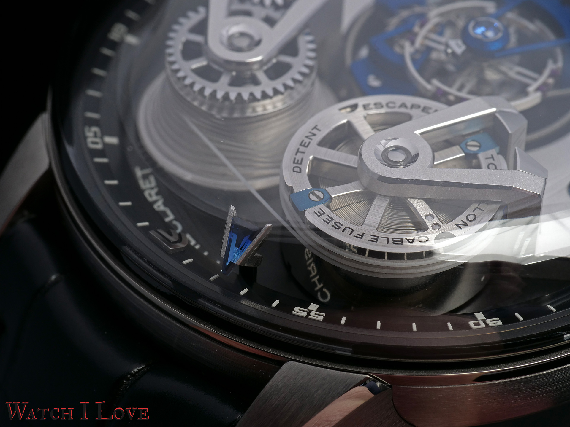 The most important feature of the Angelico is not the time display. Even if the watch is capable of instant-jump dual-time display with day/night indicator. The stars of the show are the 6-minute tourbillon with detent escapement and the cable-type fusee.