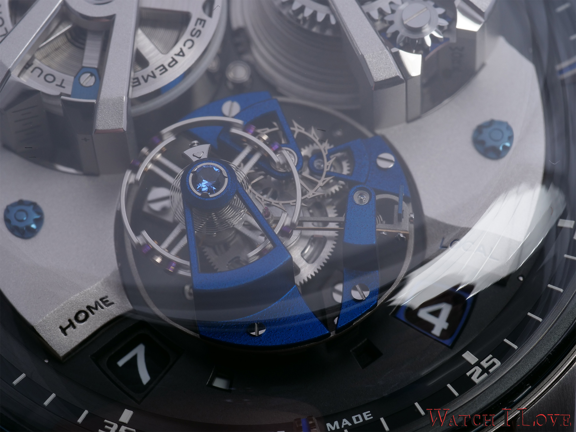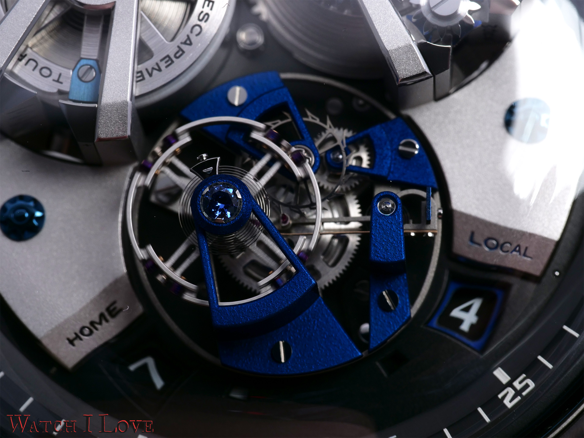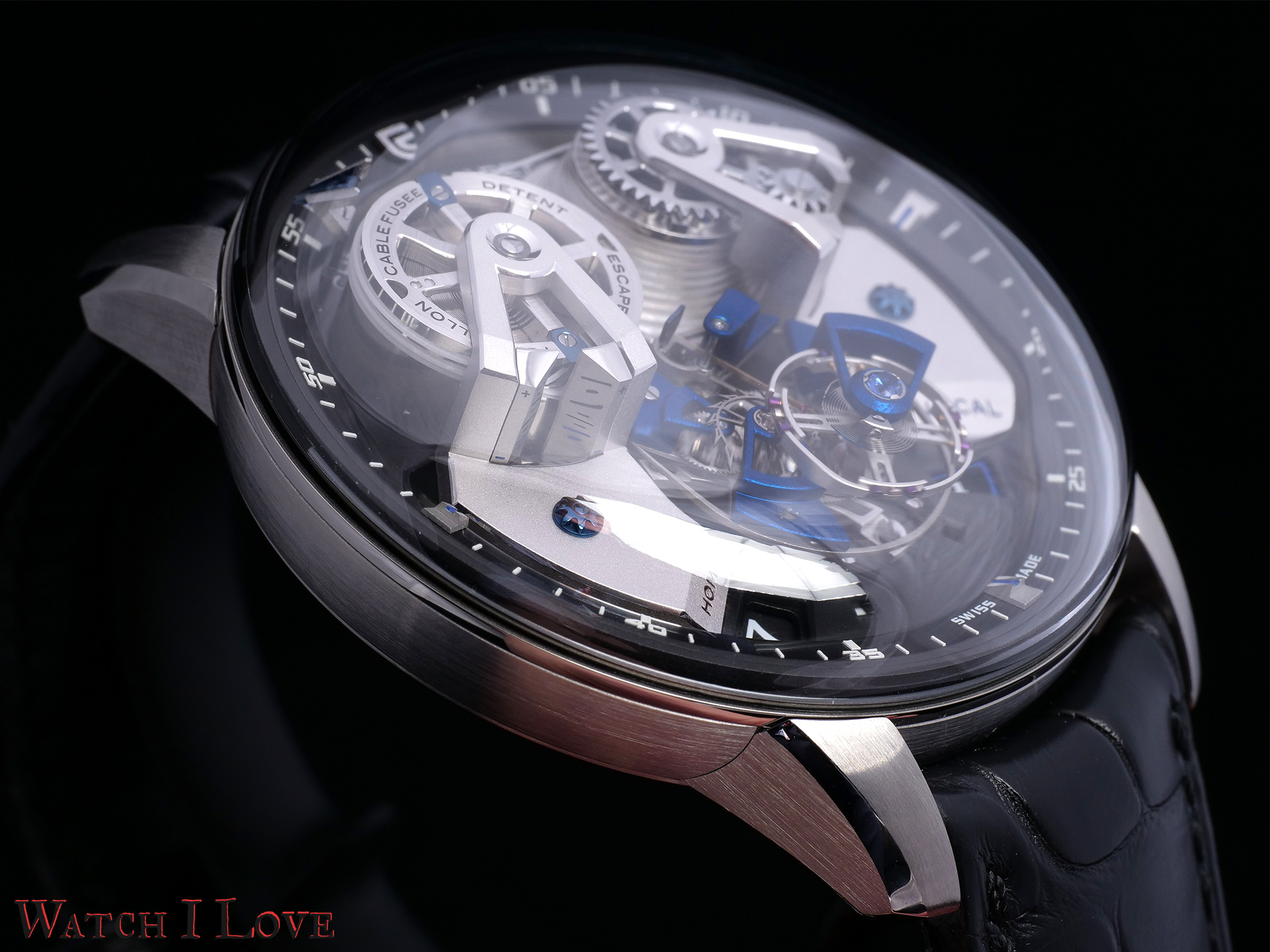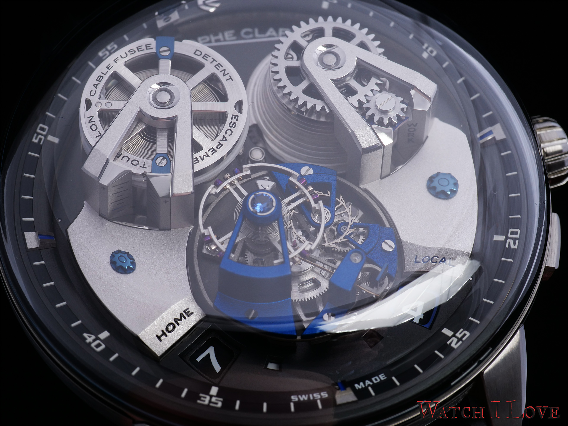 The most important feature of the Angelico is not the time display. Even if the watch is capable of instant-jump dual-time display with day/night indicator. The stars of the show are the 6-minute tourbillon with detent escapement and the cable-type fusee.