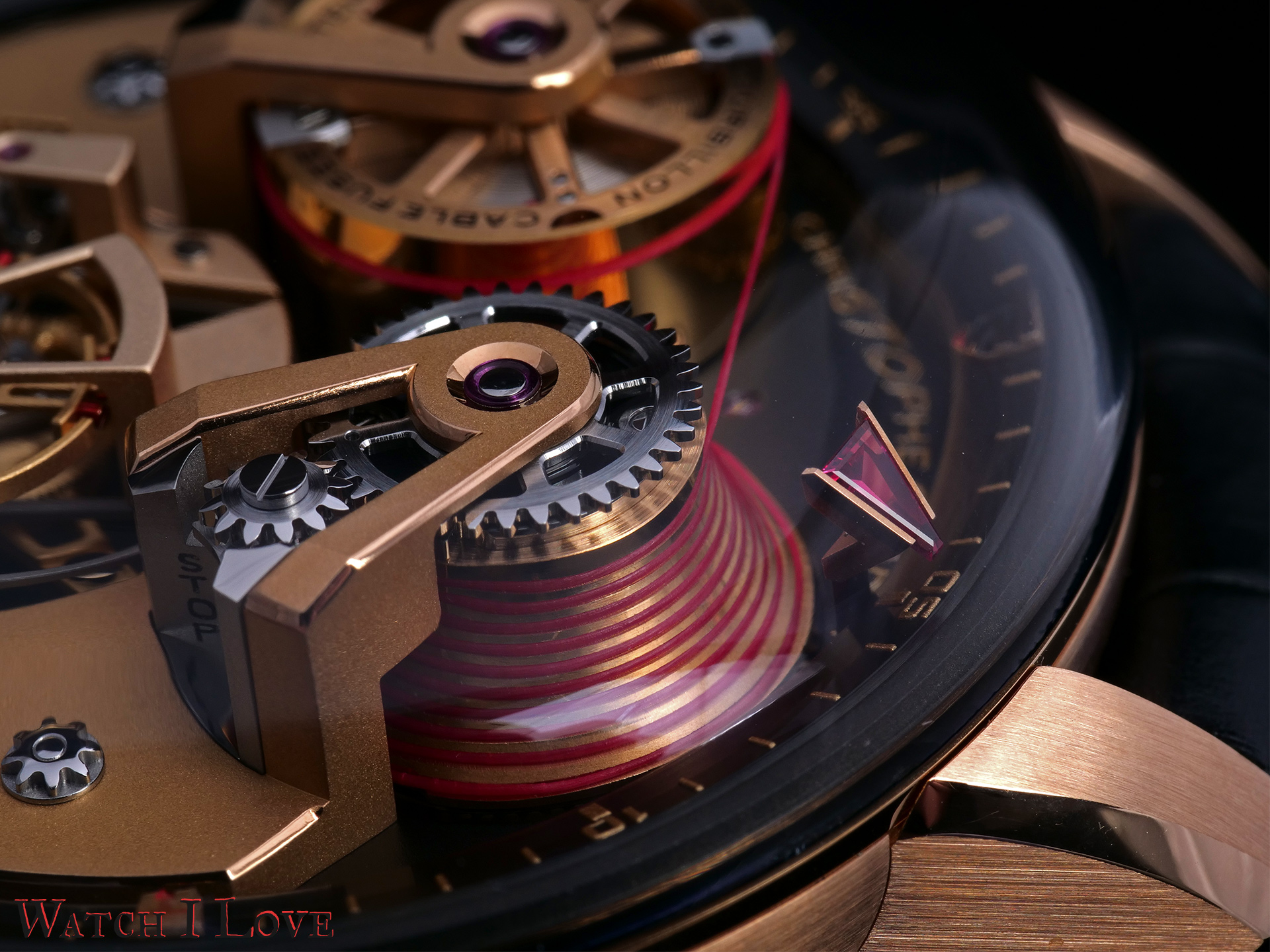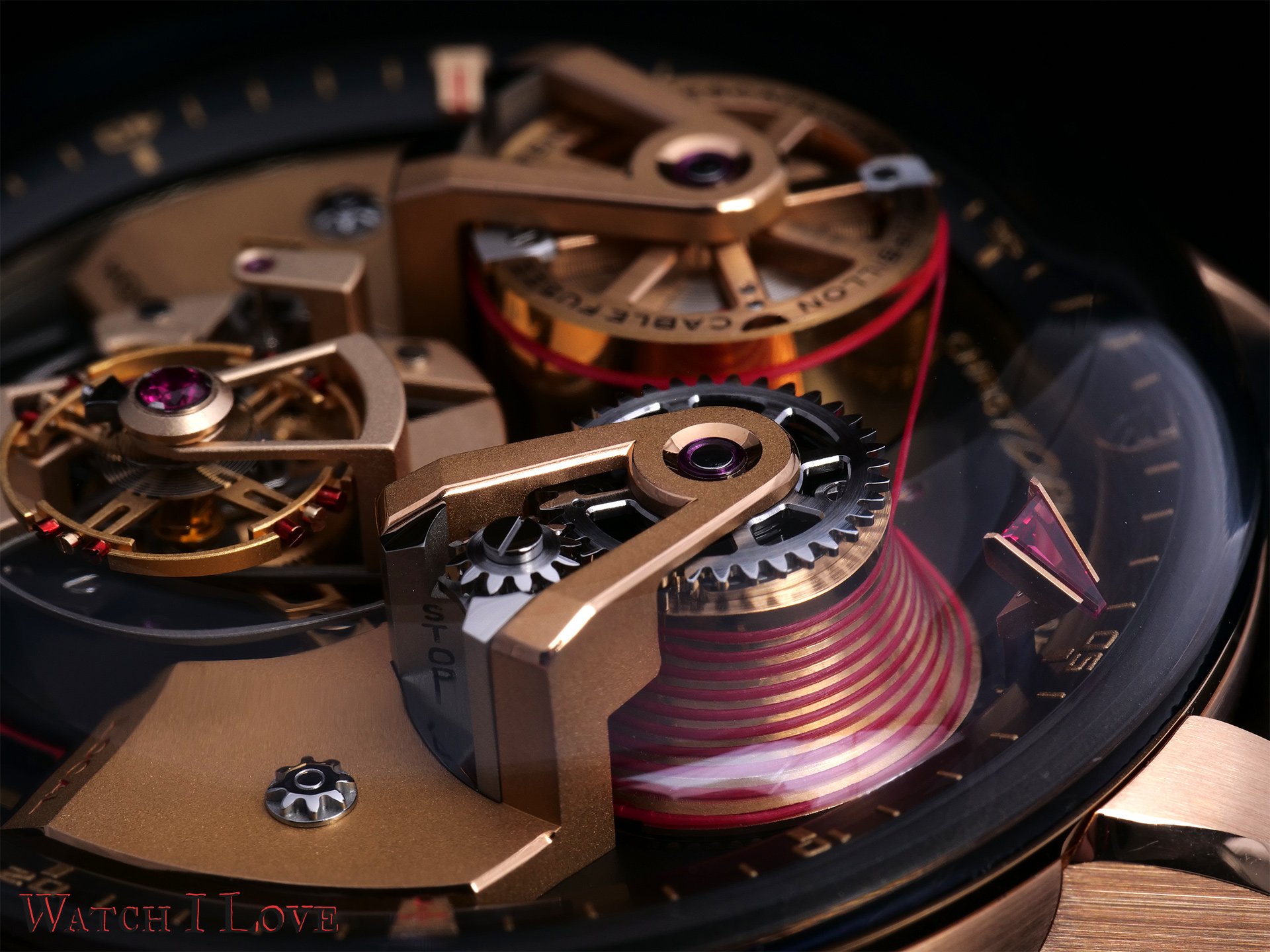 The power reserve is ingeniously displayed by the cable on the barrel body using a notation on the barrel’s bridge.