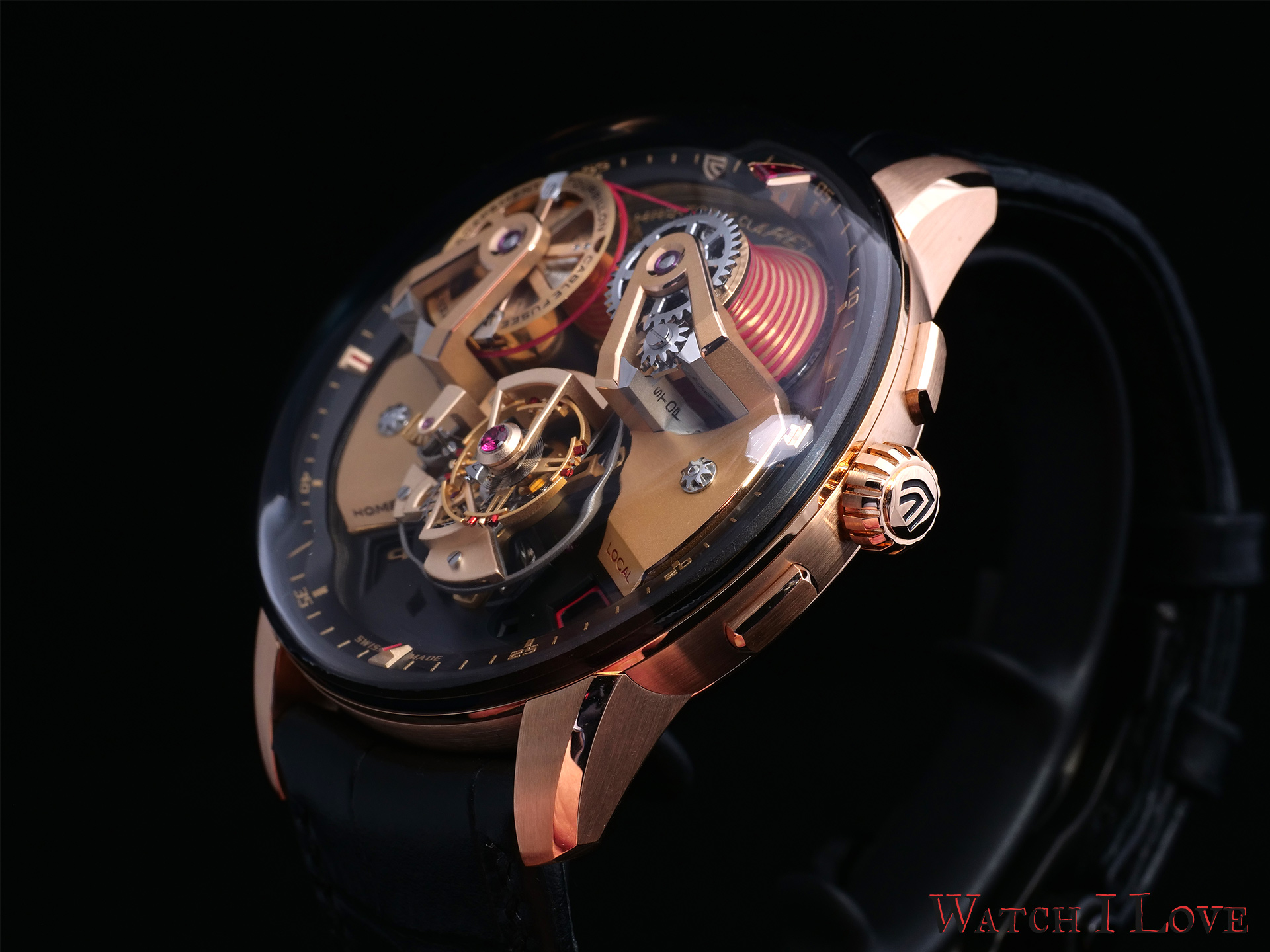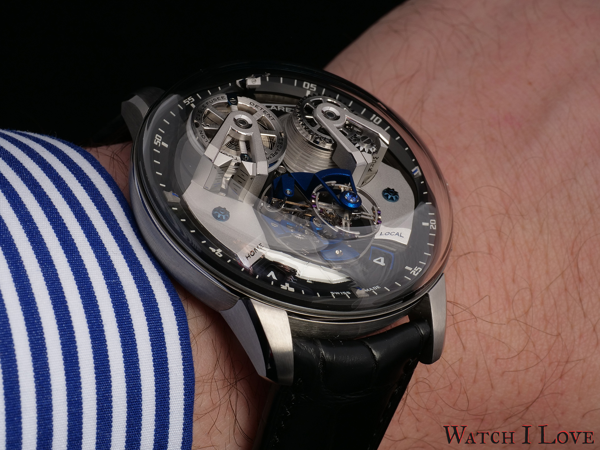 The Christophe Claret Angelico is presented in a relatively large case – 45.5 mm diameter and 17.5mm height. The watch is covered by a domed crystal. The show is multi-dimensional displayed, the Angelico being a world of itself.