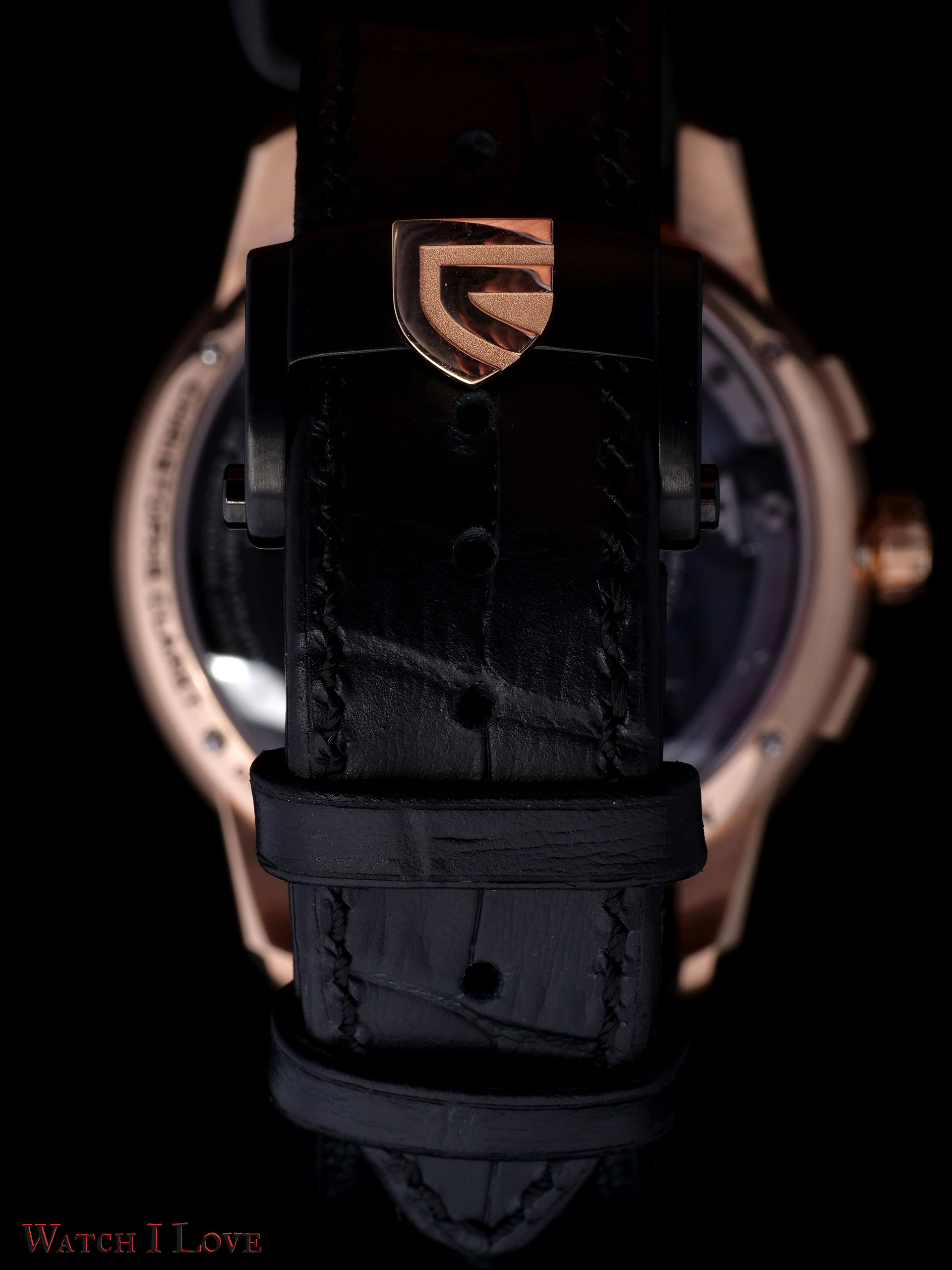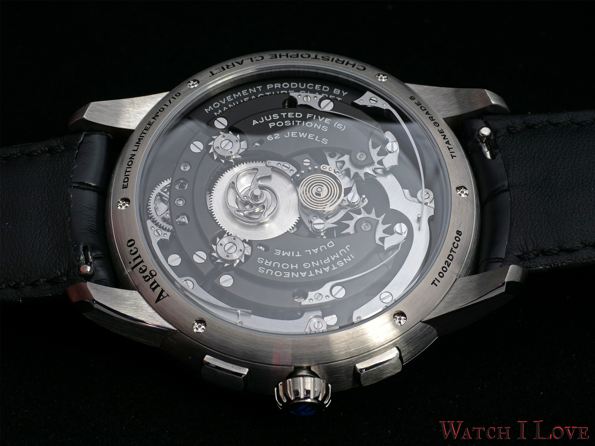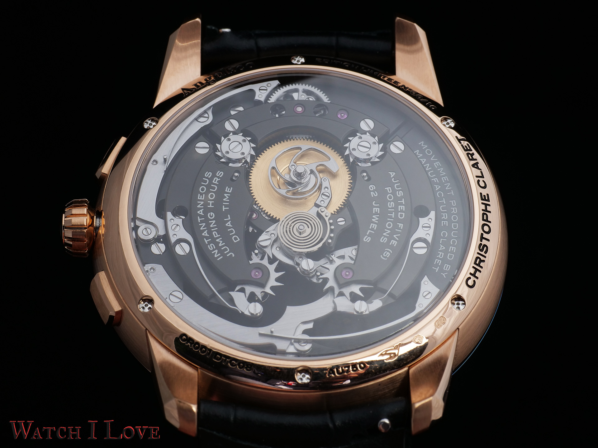 The back of the watch reveals the “uninteresting” parts of the DTC08 mechanical hand-wound movement. All the spectacular horological complications are displayed on the top: the detent escapement on a 6-minute tourbillon and cable-type fusee system.