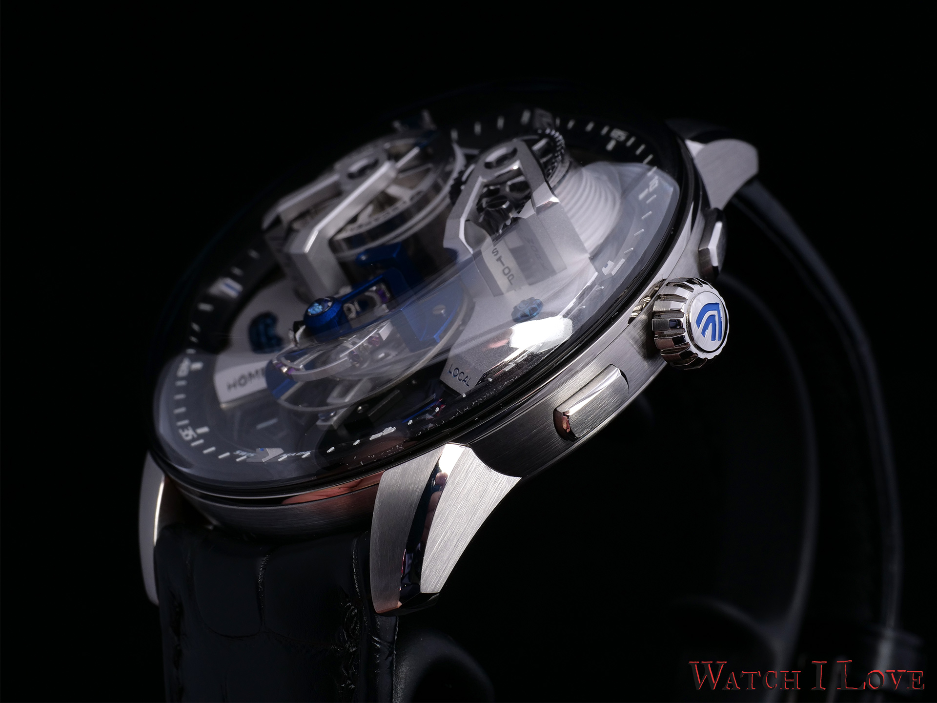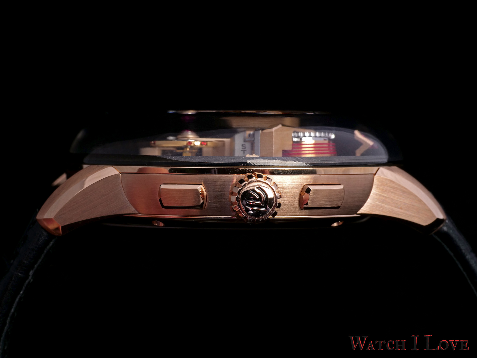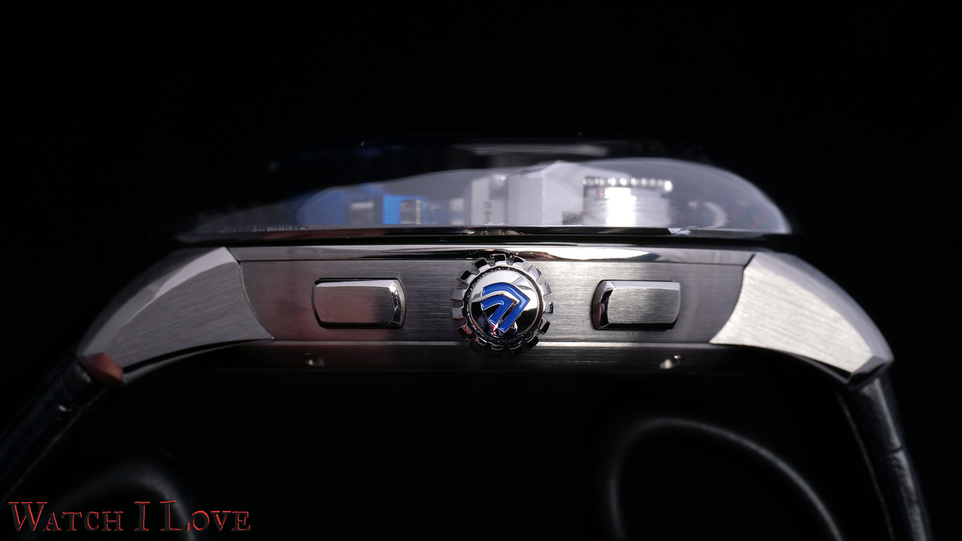 The pushers are decorated in the same way as the case: a subtle brushing that highlights the polished beveling. The crown follows the theme, but with a deeper chamfer. The crown is engraved and lacquer filled: black for the gold version and blue for the titanium.