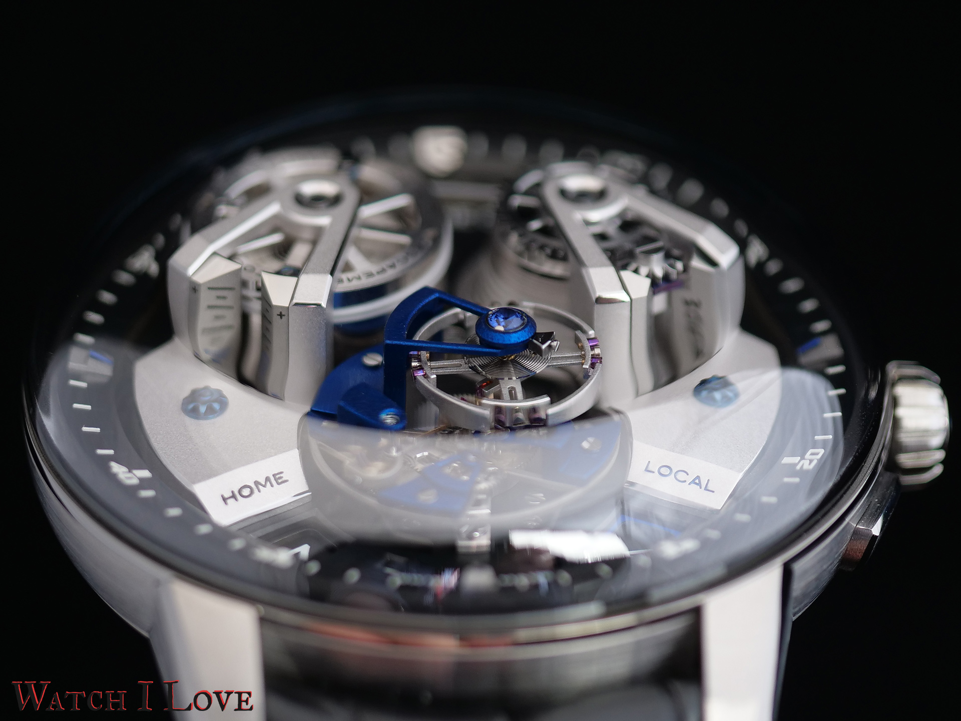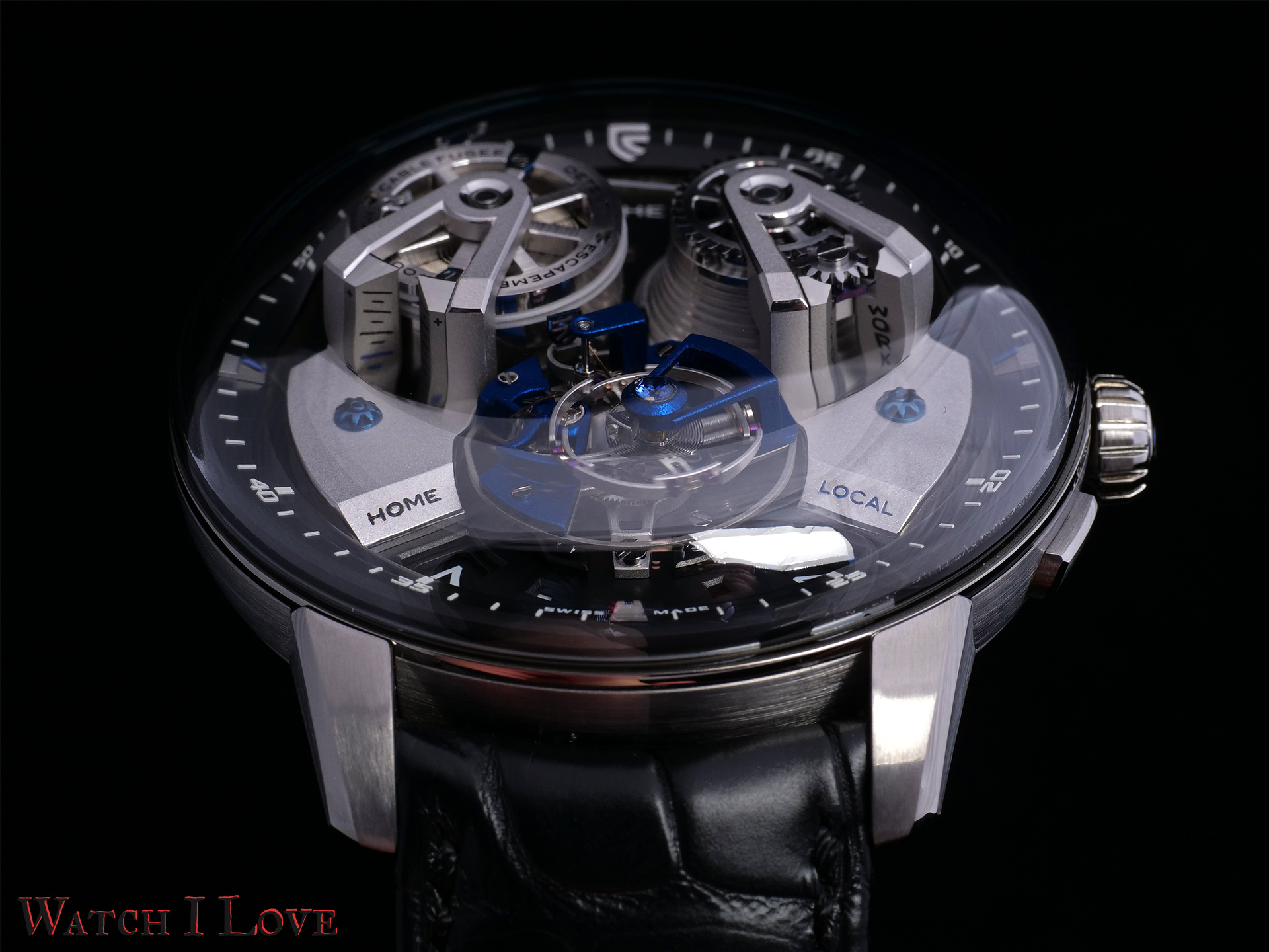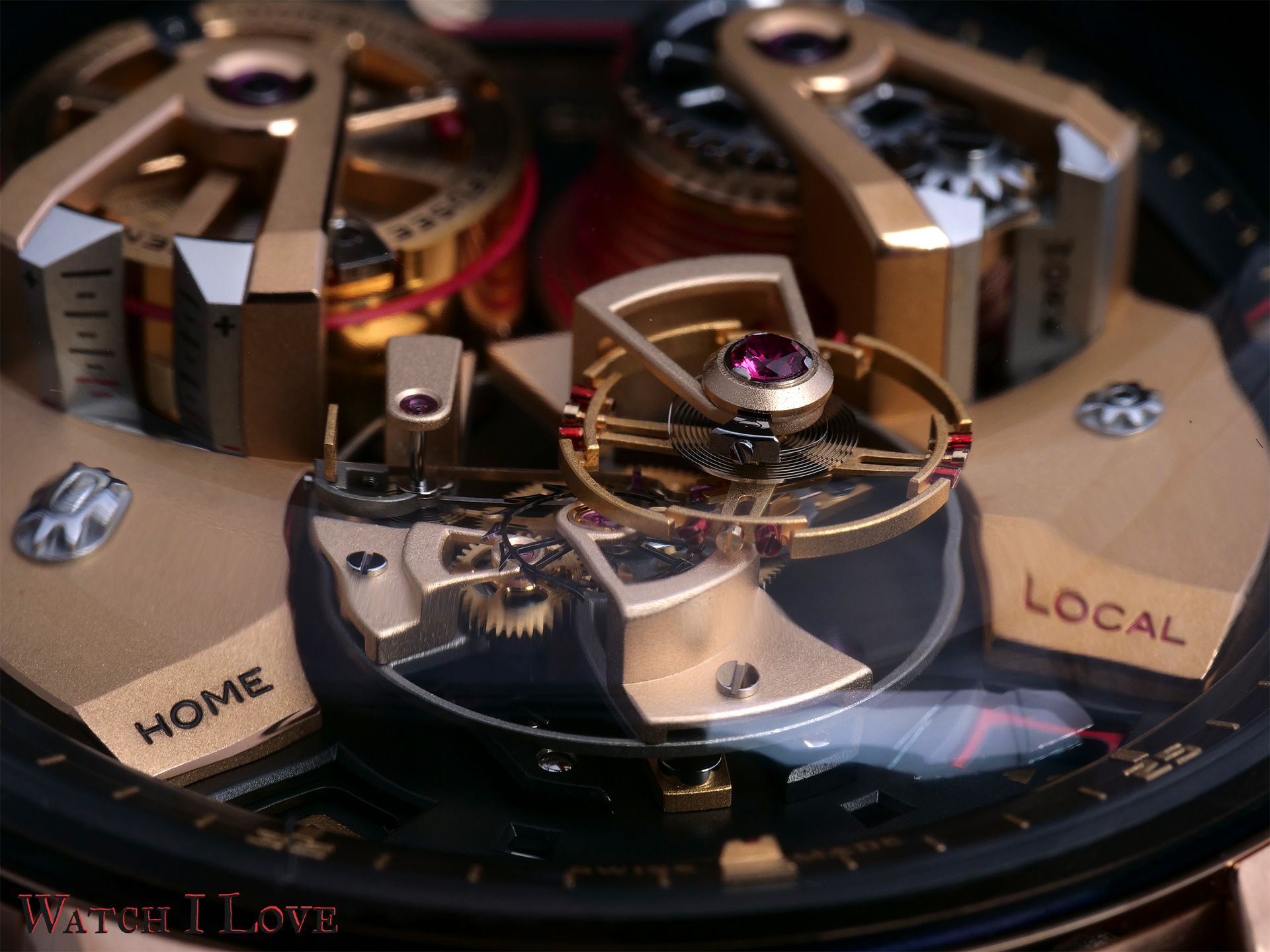 The home and local time are displayed via two apertures, symmetrically placed on the bottom of the dial. Moreover, the watch is capable to display day/night for both times.