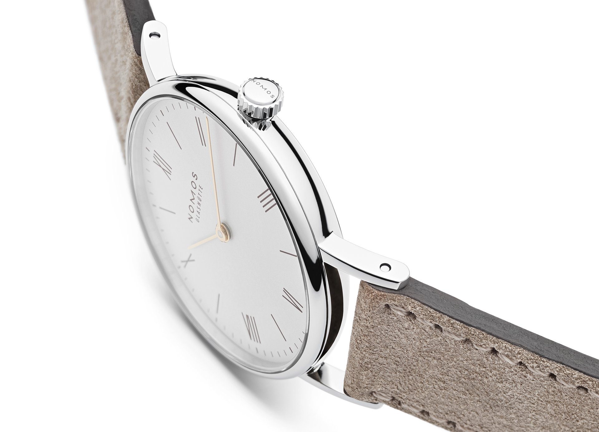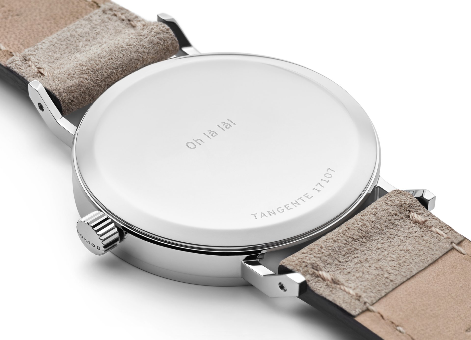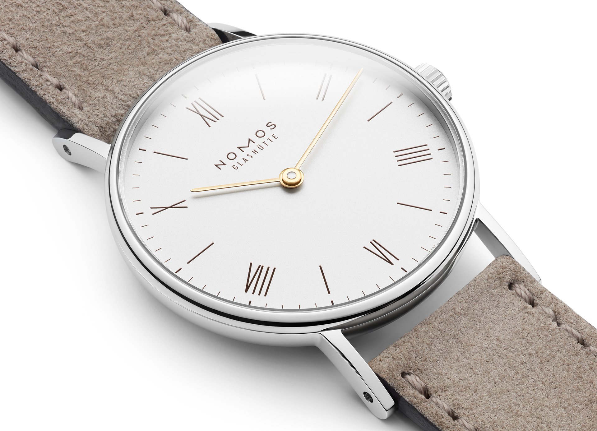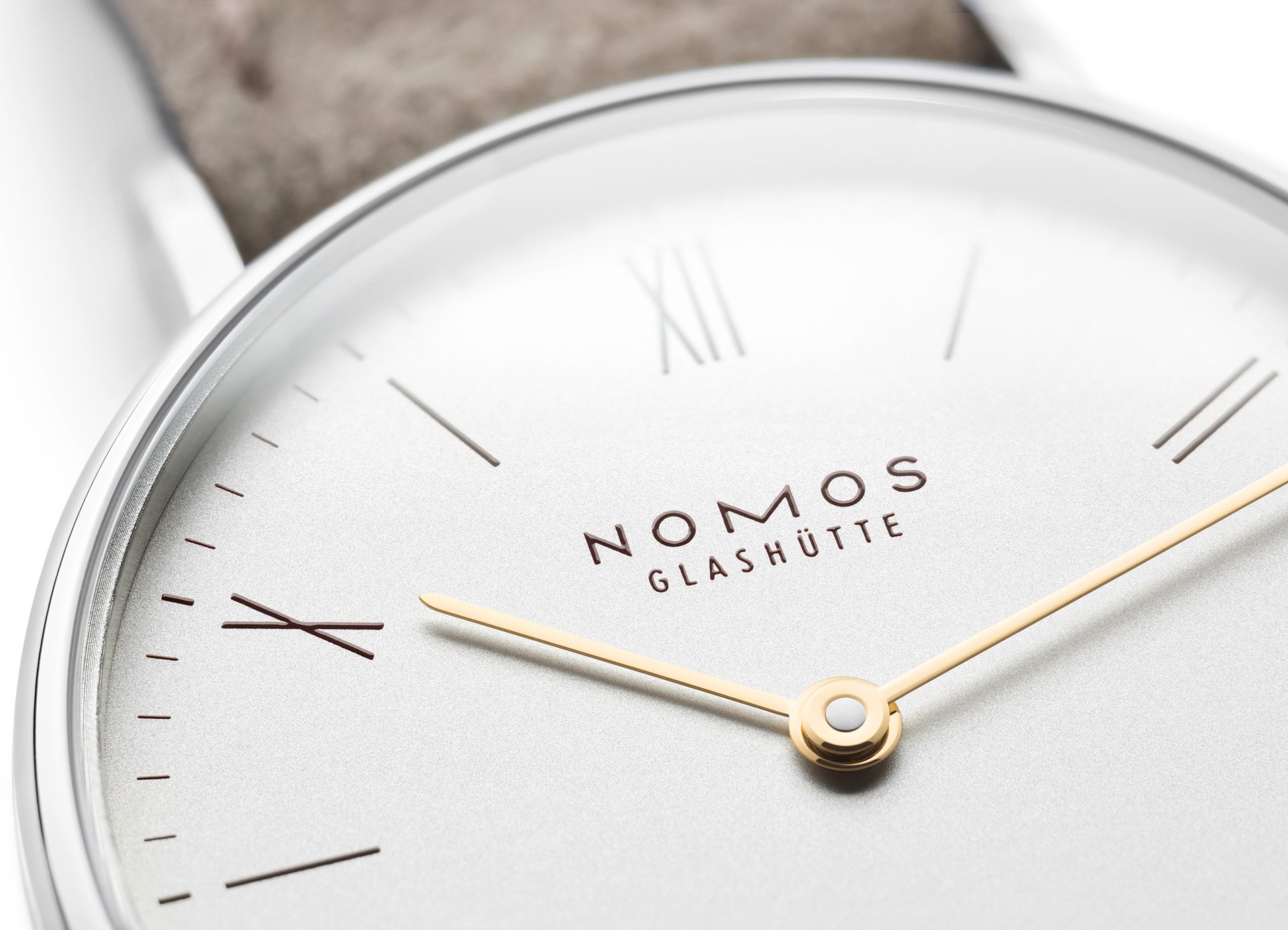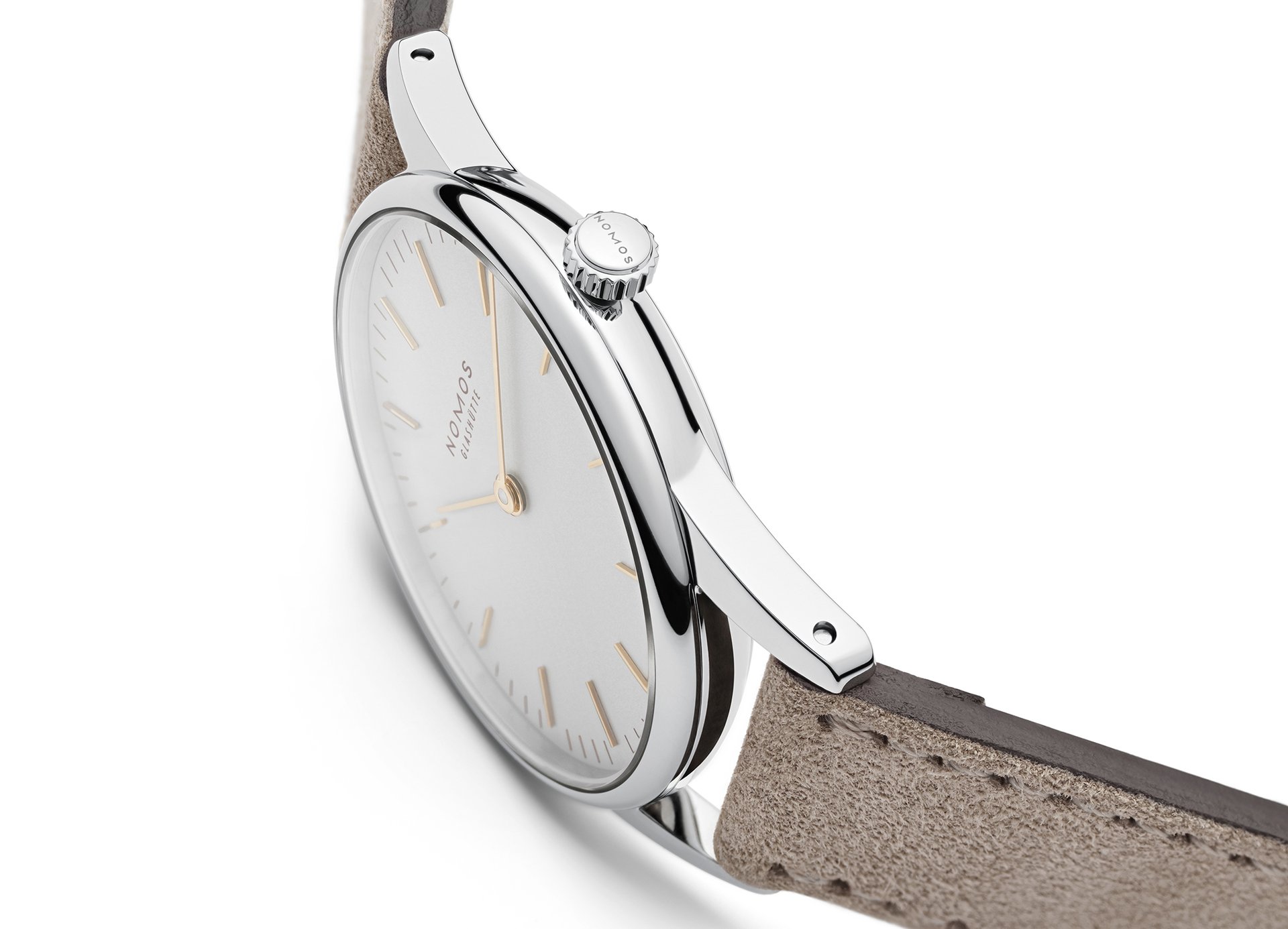 The case of the four new watches is made of stainless steel, the dials are white silverplated, as with other NOMOS classics. This silver case is complemented by golden hands, which makes this watch an ideal companion to jewellery. The mocha-brown typography is almost black, but softer, and the beige velour leather strap is also more delicate than the classic Shell Cordovan. A personalized engraving on the stainless steel back is the finishing touch—available on request.