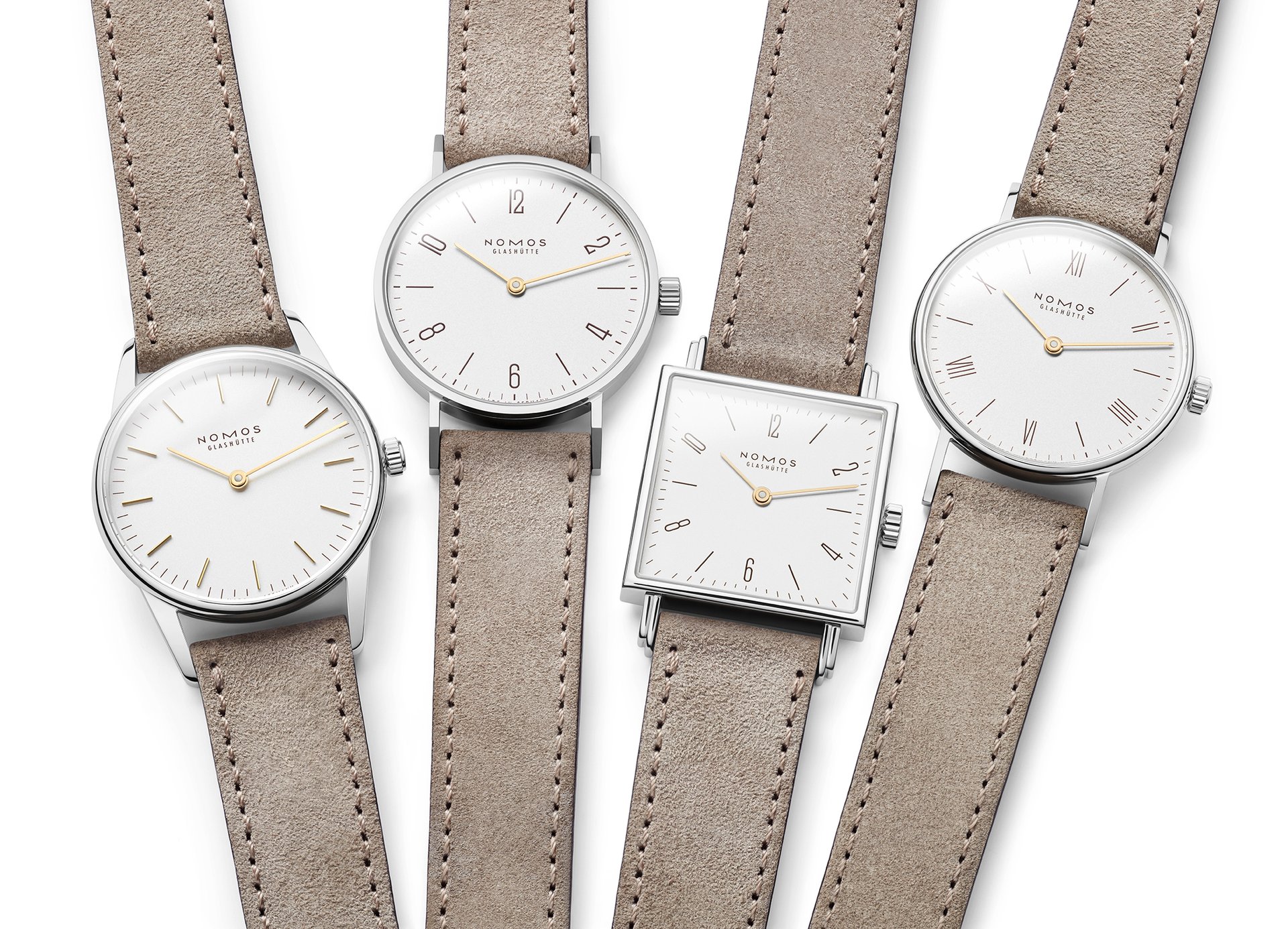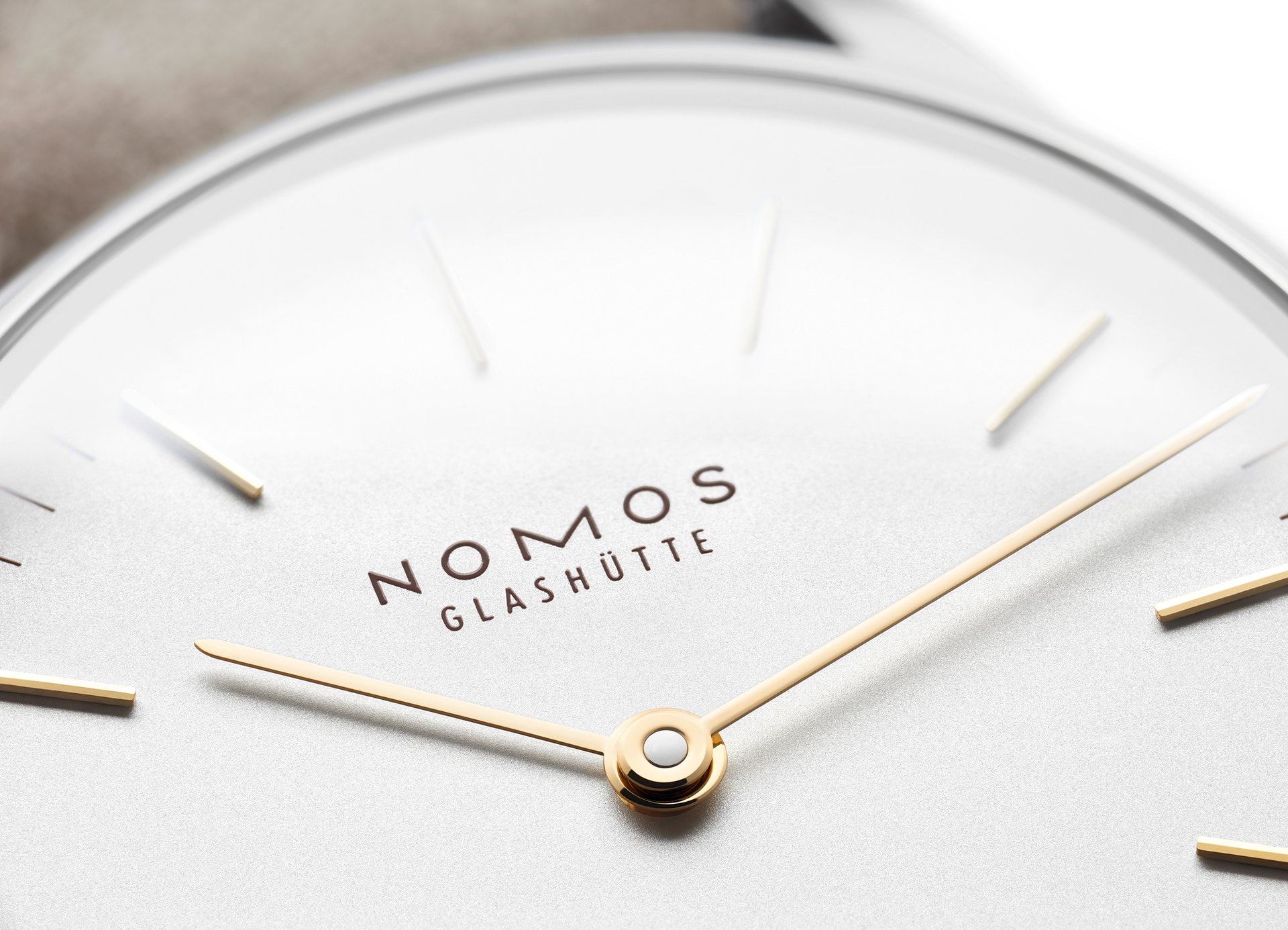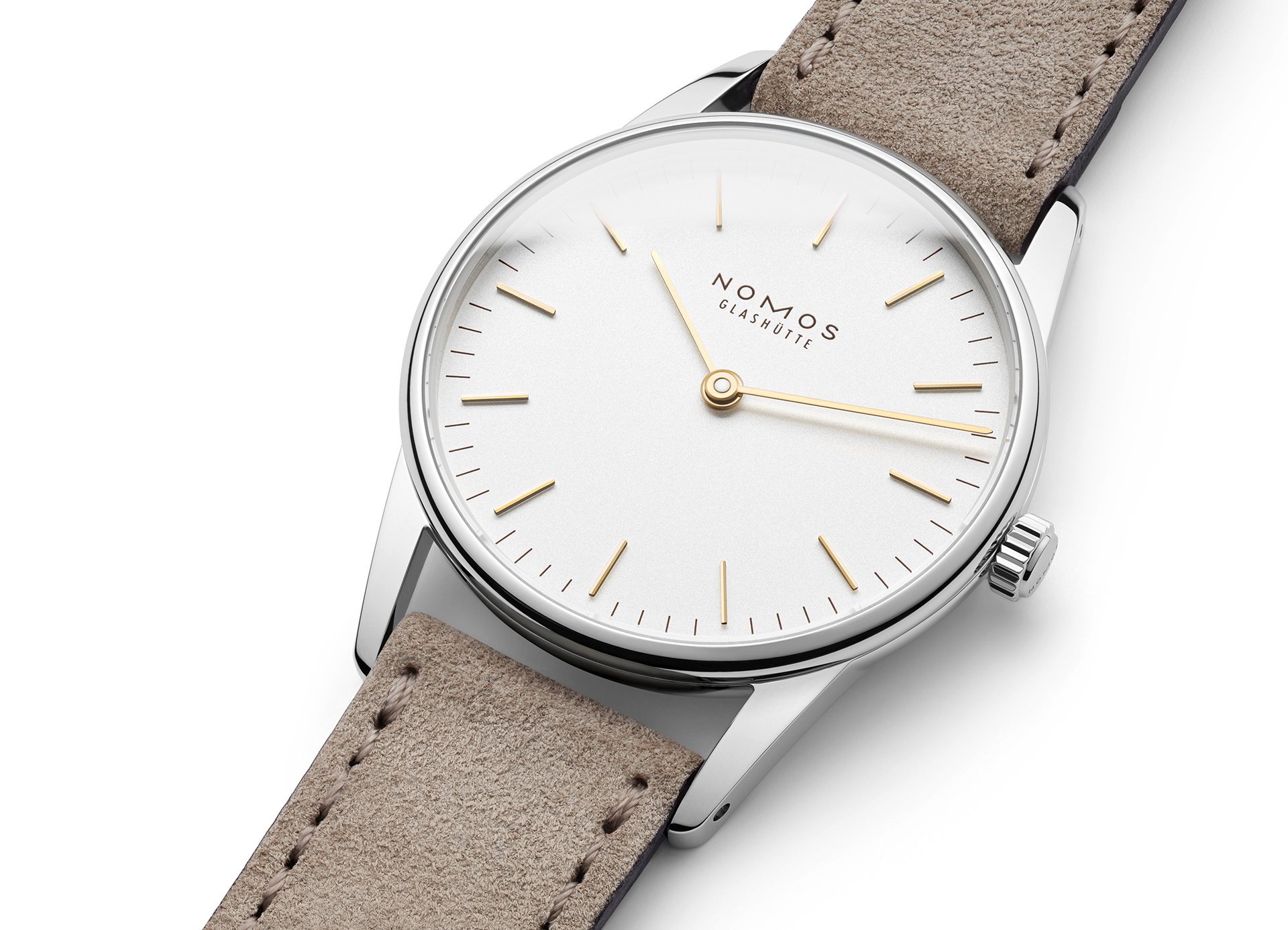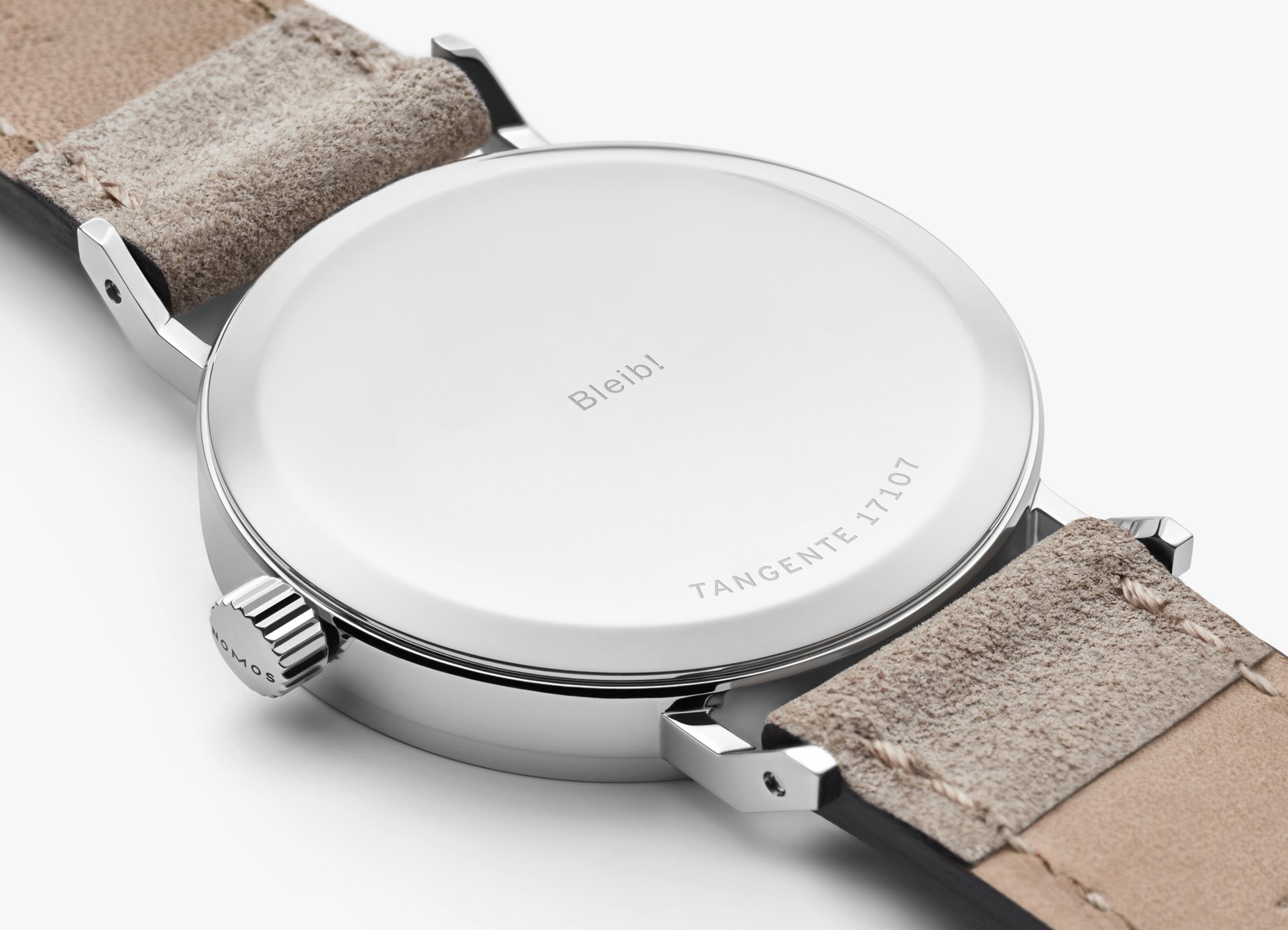 The case of the four new watches is made of stainless steel, the dials are white silverplated, as with other NOMOS classics. This silver case is complemented by golden hands, which makes this watch an ideal companion to jewellery. The mocha-brown typography is almost black, but softer, and the beige velour leather strap is also more delicate than the classic Shell Cordovan. A personalized engraving on the stainless steel back is the finishing touch—available on request.