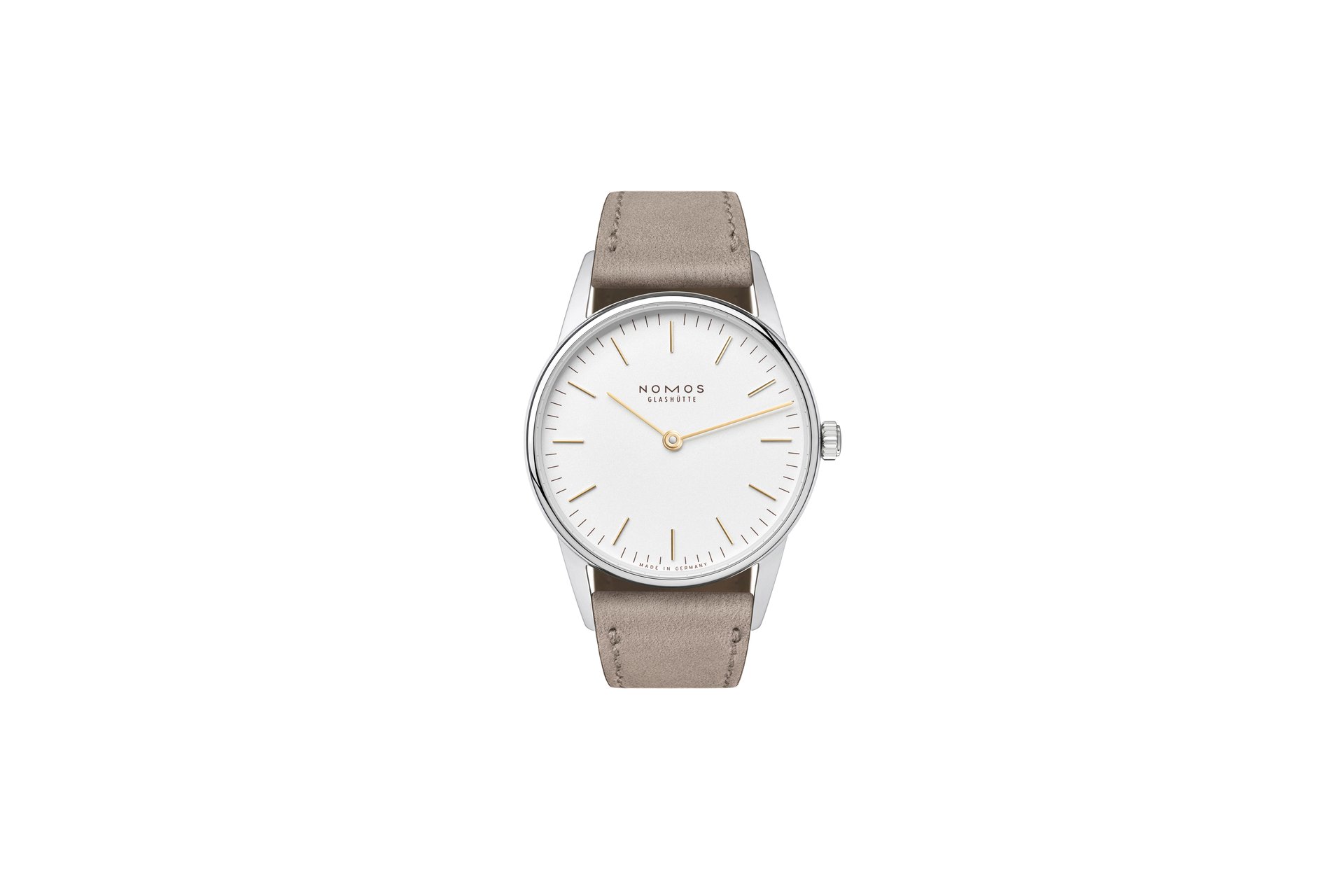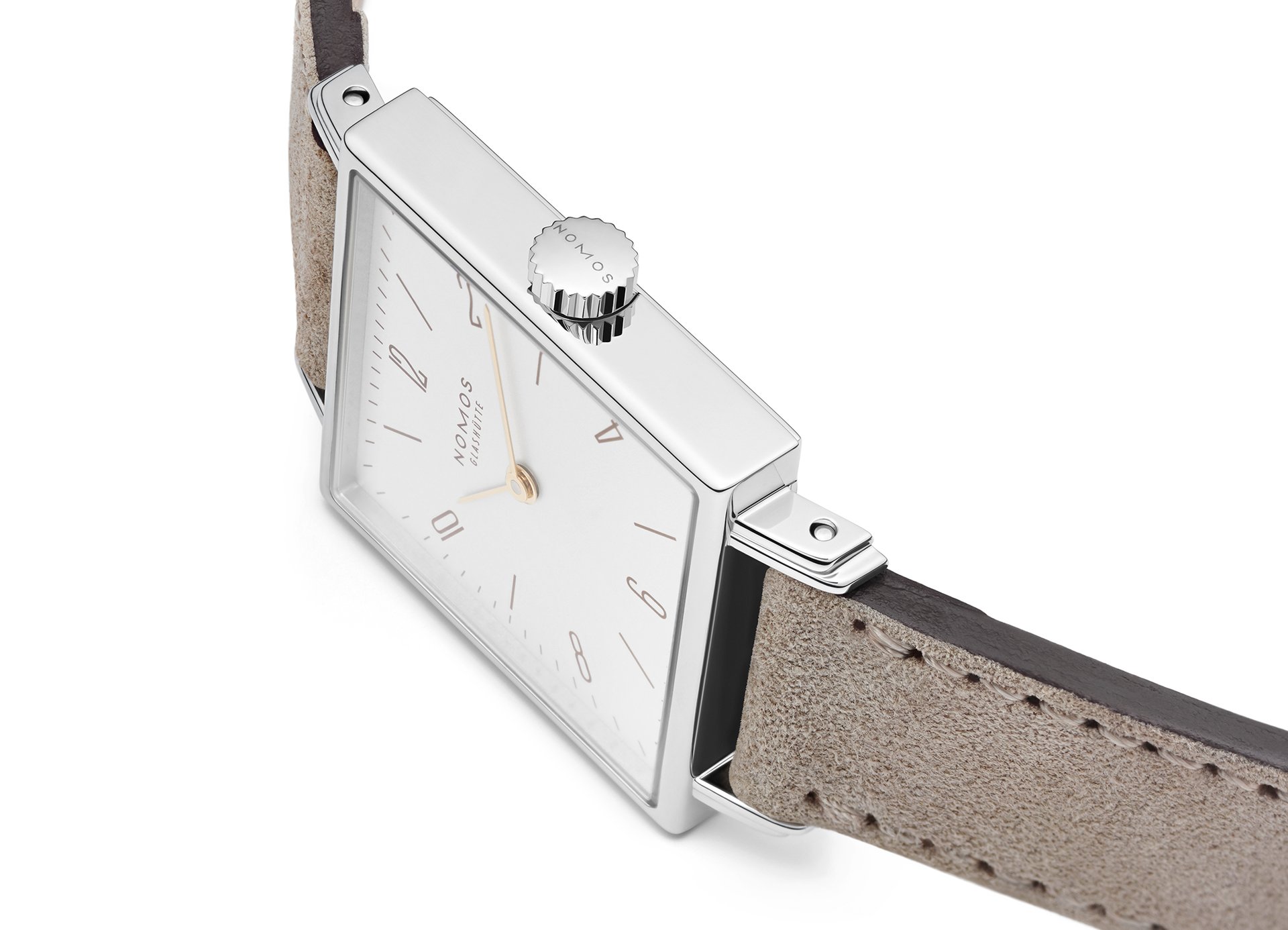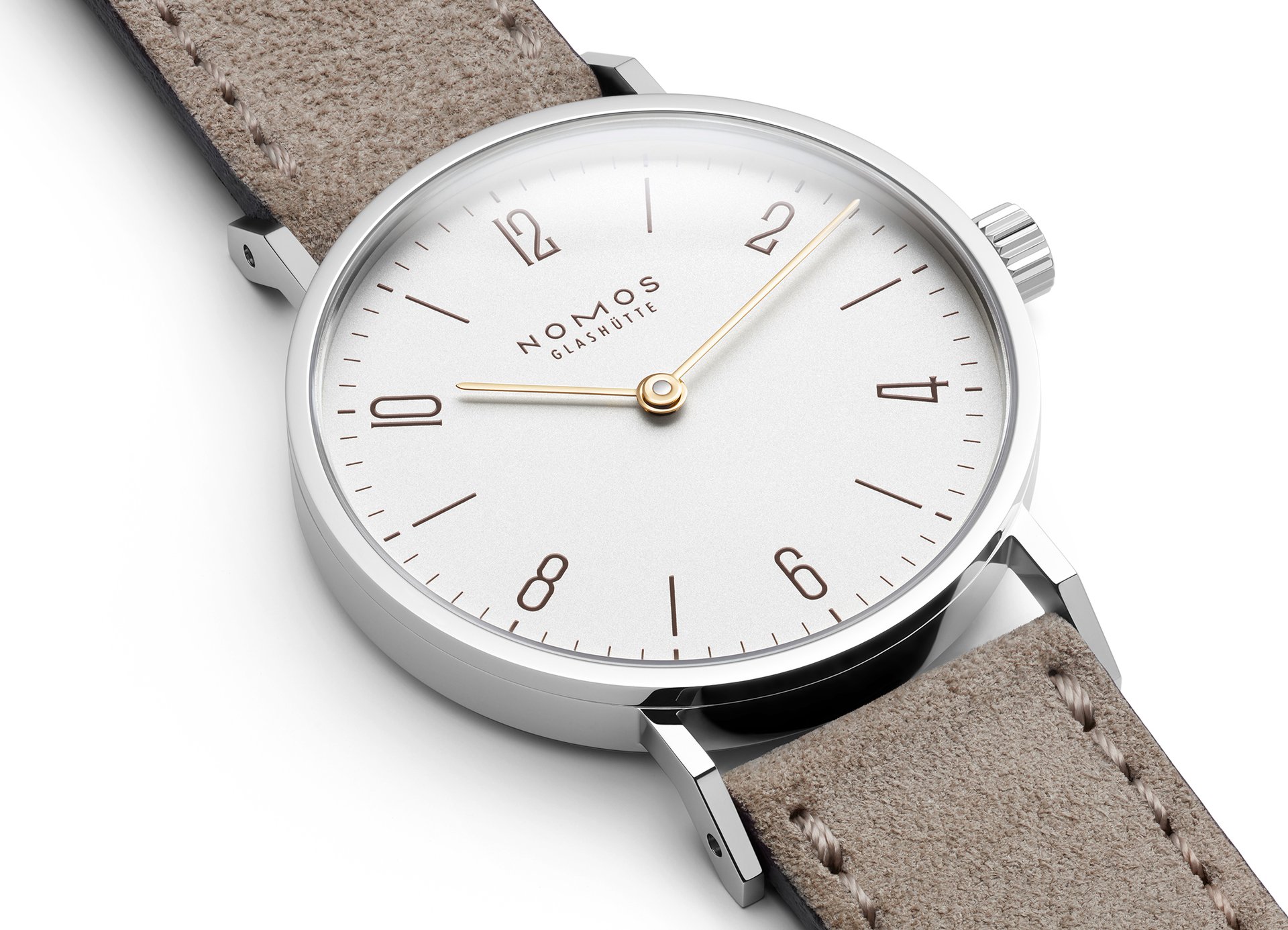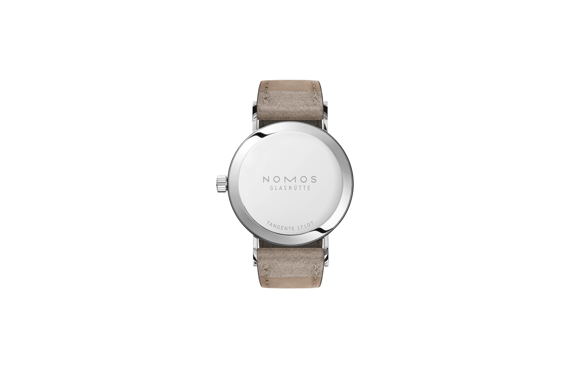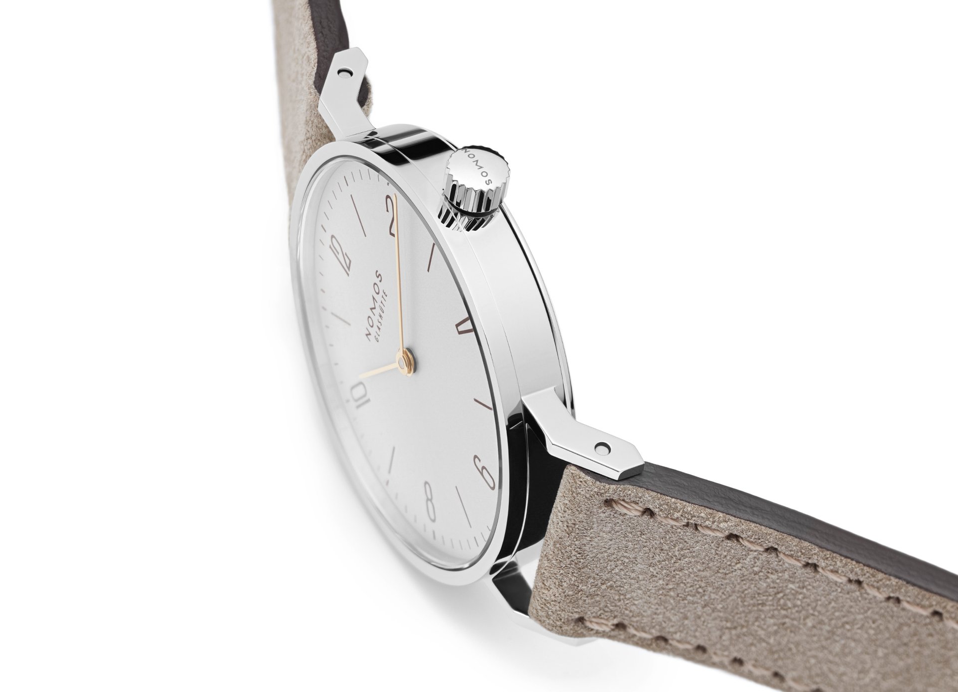The case of the four new watches is made of stainless steel, the dials are white silverplated, as with other NOMOS classics. This silver case is complemented by golden hands, which makes this watch an ideal companion to jewellery. The mocha-brown typography is almost black, but softer, and the beige velour leather strap is also more delicate than the classic Shell Cordovan. A personalized engraving on the stainless steel back is the finishing touch—available on request.