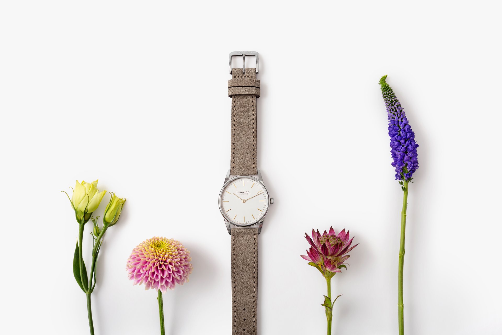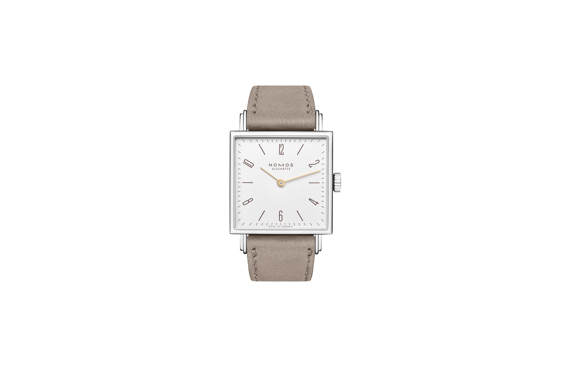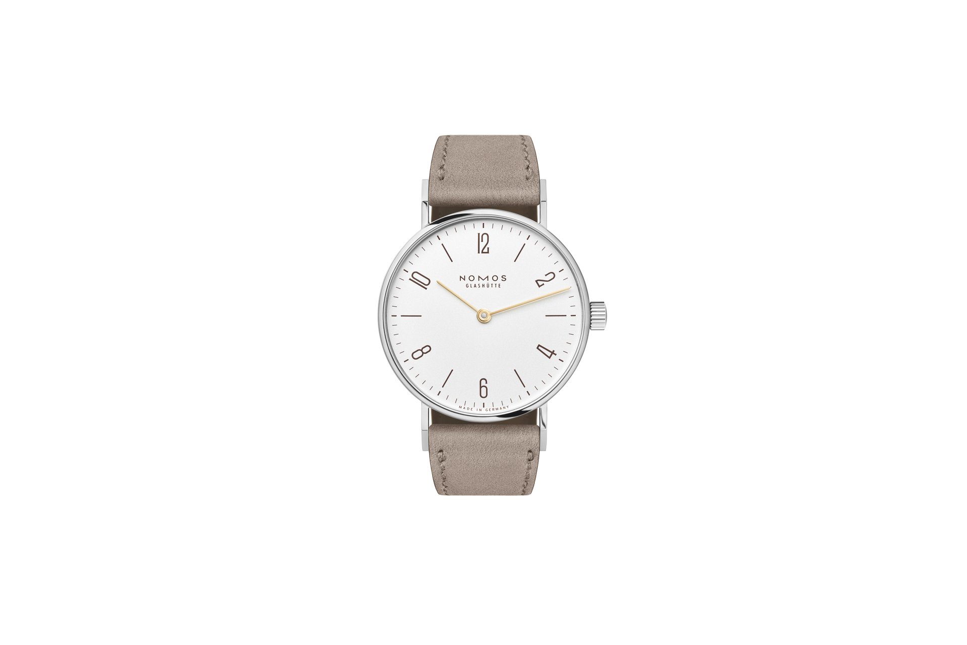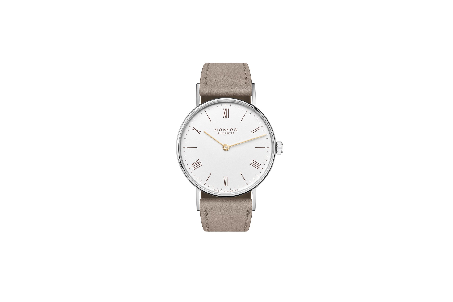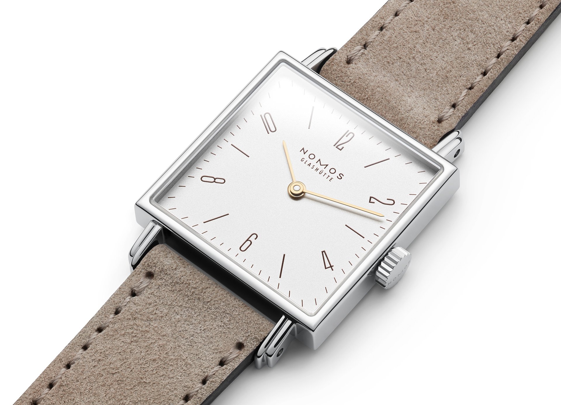 The case of the four new watches is made of stainless steel, the dials are white silverplated, as with other NOMOS classics. This silver case is complemented by golden hands, which makes this watch an ideal companion to jewellery. The mocha-brown typography is almost black, but softer, and the beige velour leather strap is also more delicate than the classic Shell Cordovan. A personalized engraving on the stainless steel back is the finishing touch—available on request.