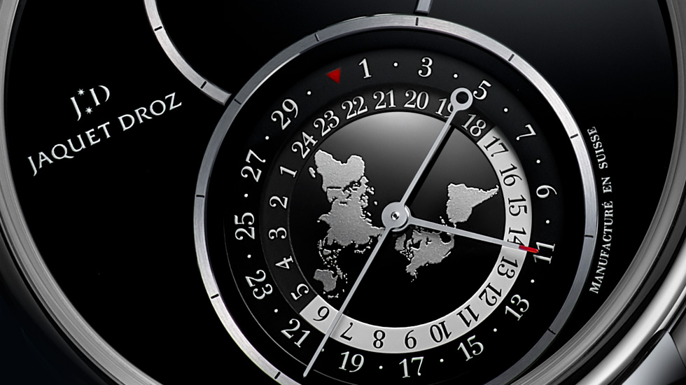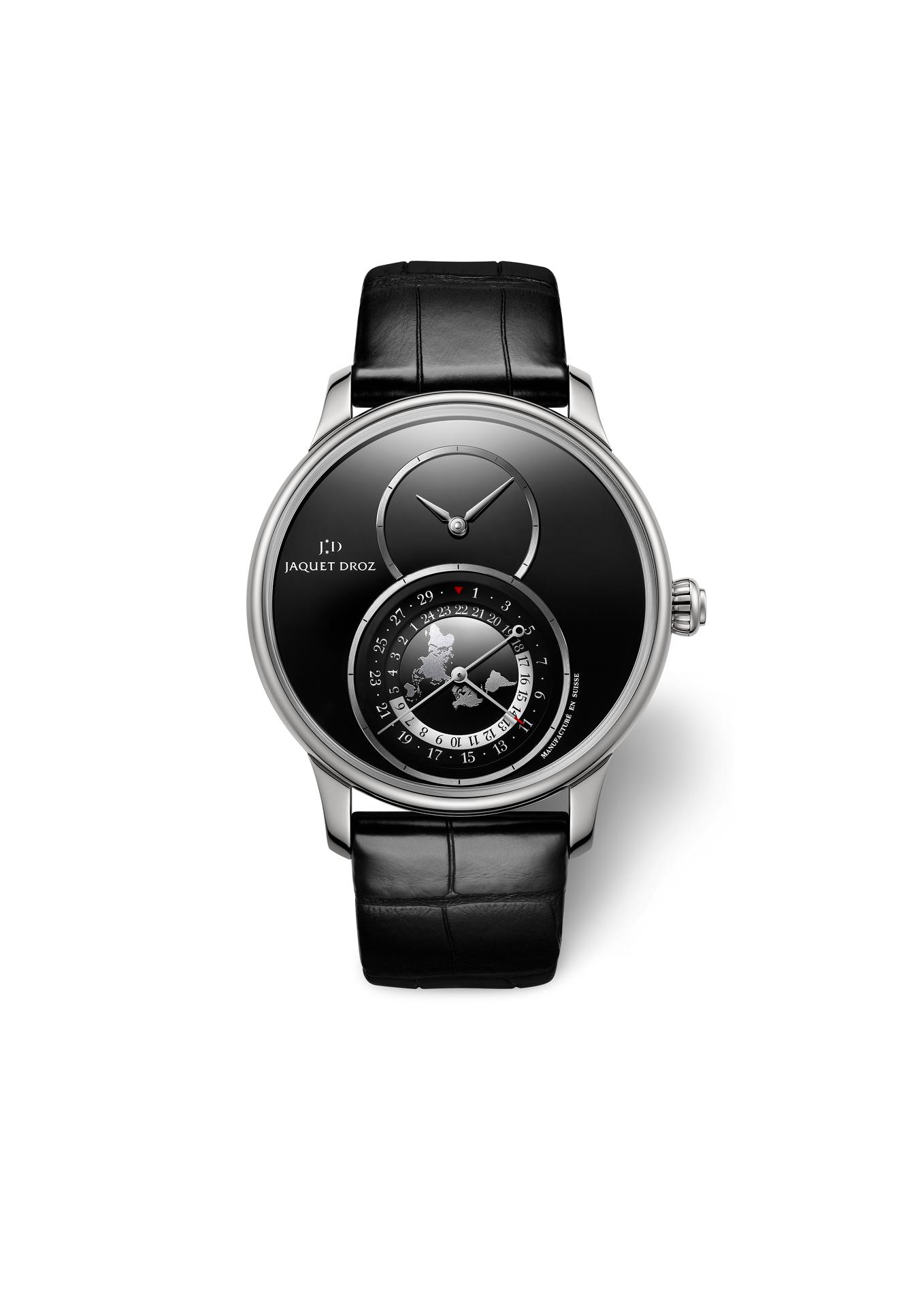 The evolution of a piece as iconic as the Grande Seconde Dual Time therefore has a particular significance for the heritage of the brand. In this latest version, the aesthetic has been thoroughly revised. Starting with the same self-winding mechanical caliber (with silicon balance spring and pallet lugs) Jaquet Droz finds a new home for its travel complication, nestled in the bottom half of the Grande Seconde’s signature figure 8 dial. At its heart the continents are seen flat from the North Pole in an azimuthal projection. The powdery finish chosen by the brand brings the modern-day mappemonde to life with the realism and volume of the Earth’s texture. The continents are depicted on a mirror polished backdrop in a choice of black or anthracite.