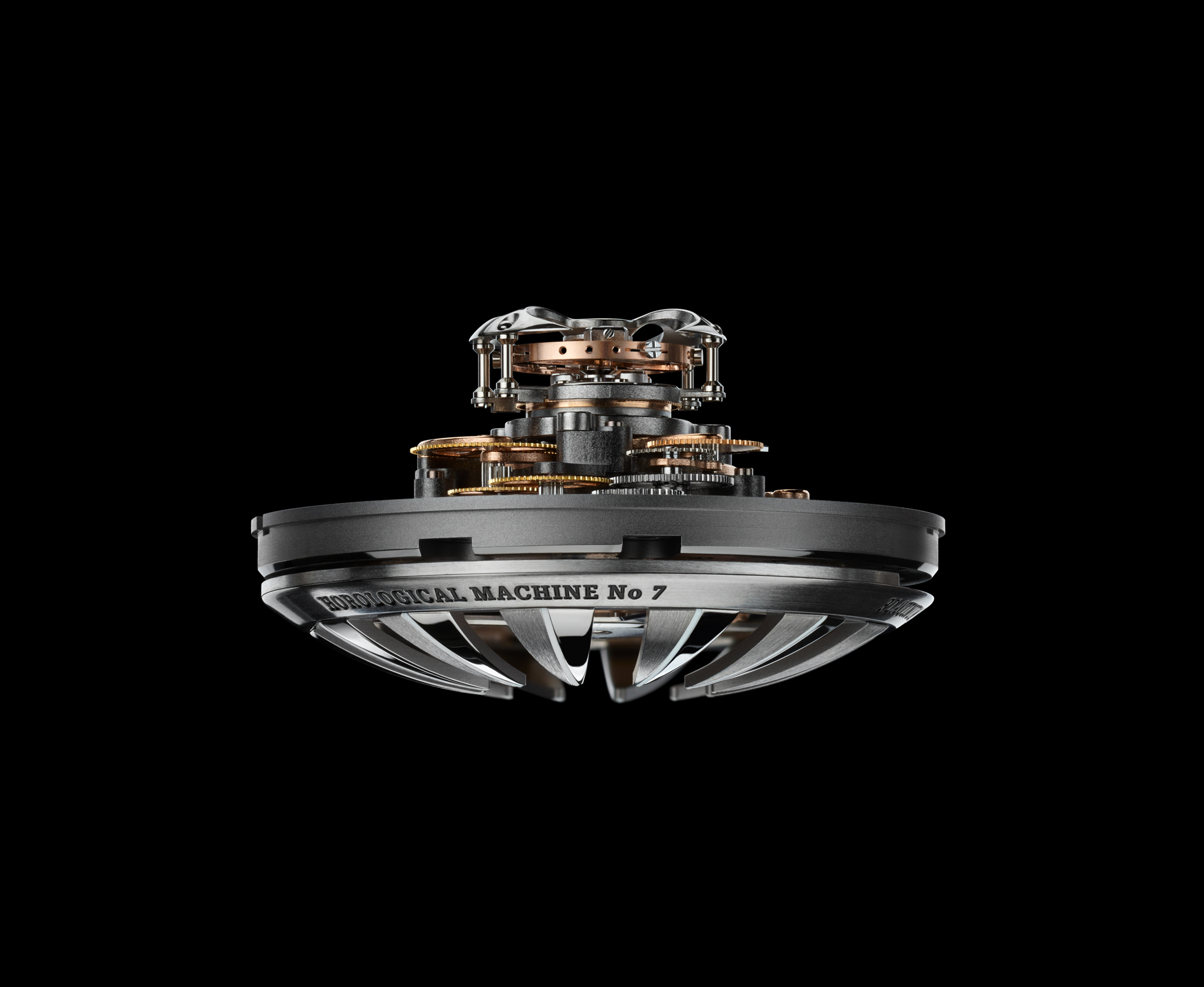 Whereas the majority of watch movements are constructed on a lateral plane to be as flat as possible, the HM7 engine goes up, not out, with all of its components arranged vertically. The movement of HM7 was entirely developed in-house by MB&F.