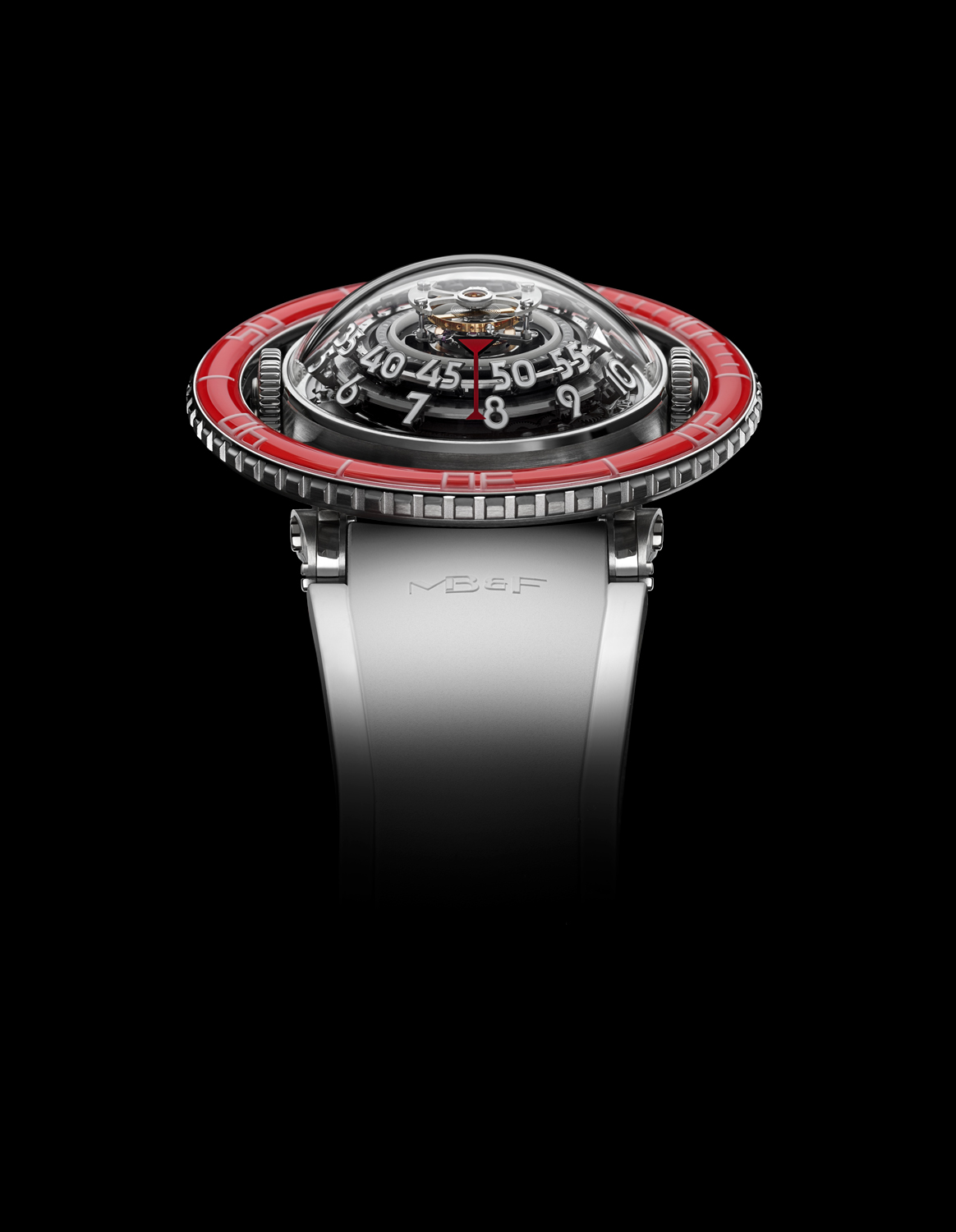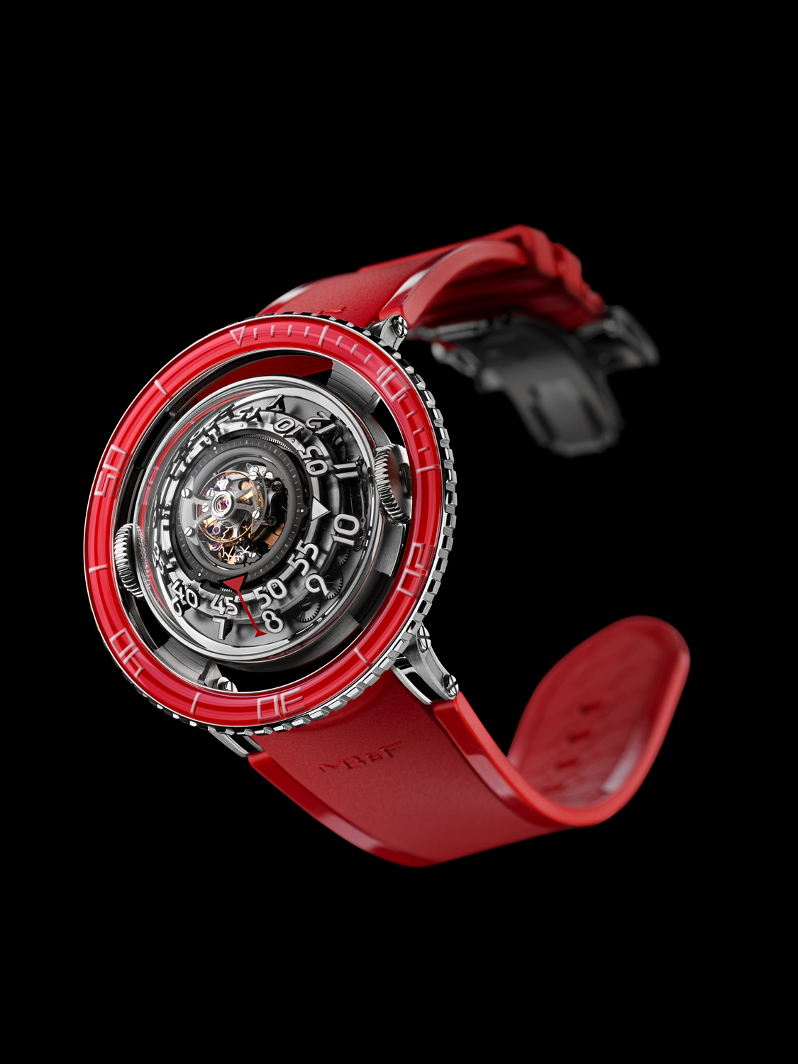 The self-winding, 391-component engine of HM7 Platinum Red was developed entirely in-house at MB&F. Fitted with a platinum case, bezel and buckle, HM7 Platinum Red will be made in a limited series of 25 pieces, each presented with three interchangeable straps (red, white and black) in aircraft-grade rubber.
