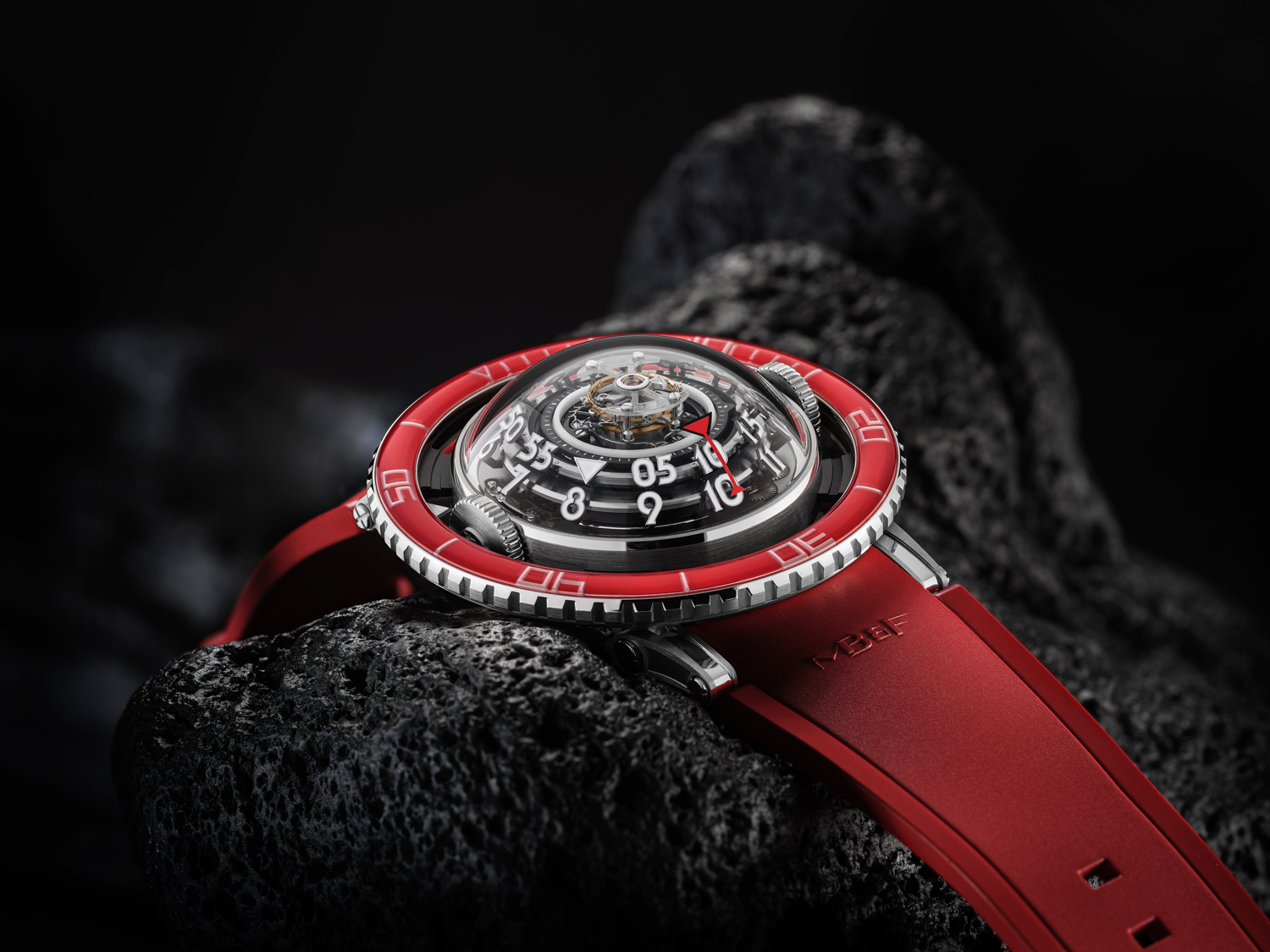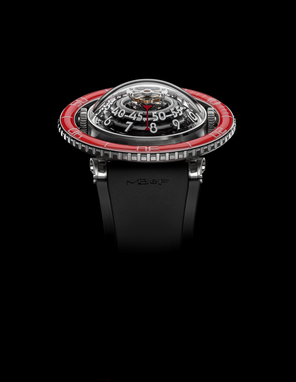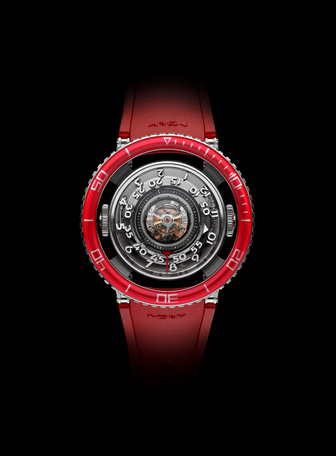 Platinum, which sits at the apex of the hierarchy of noble watchmaking materials, makes its debut in HM7, its bright silvery-white hue an emphatic counterpoint to the vividly crimson unidirectional rotating bezel. Used for the first time in any MB&F creation, red is not a colour that immediately comes to mind when thinking of marine life — but it has a very particular significance when it comes to the jellyfish.