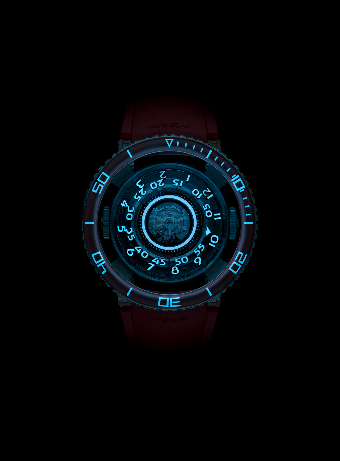 Because, of course, HM7 Platinum Red is aglow with luminescence, just as any fascinating creature of the deep should be. Apart from the AGT ring surrounding the flying tourbillon, luminous material is found in the laser-engraved markings of the unidirectional rotating bezel and on the surface of the hour and minute numerals. These are untinted Super-LumiNova, which fluoresce white after exposure to light.