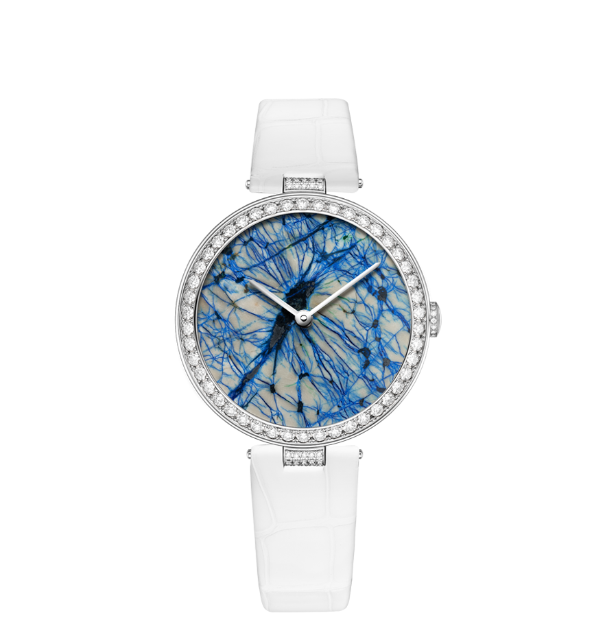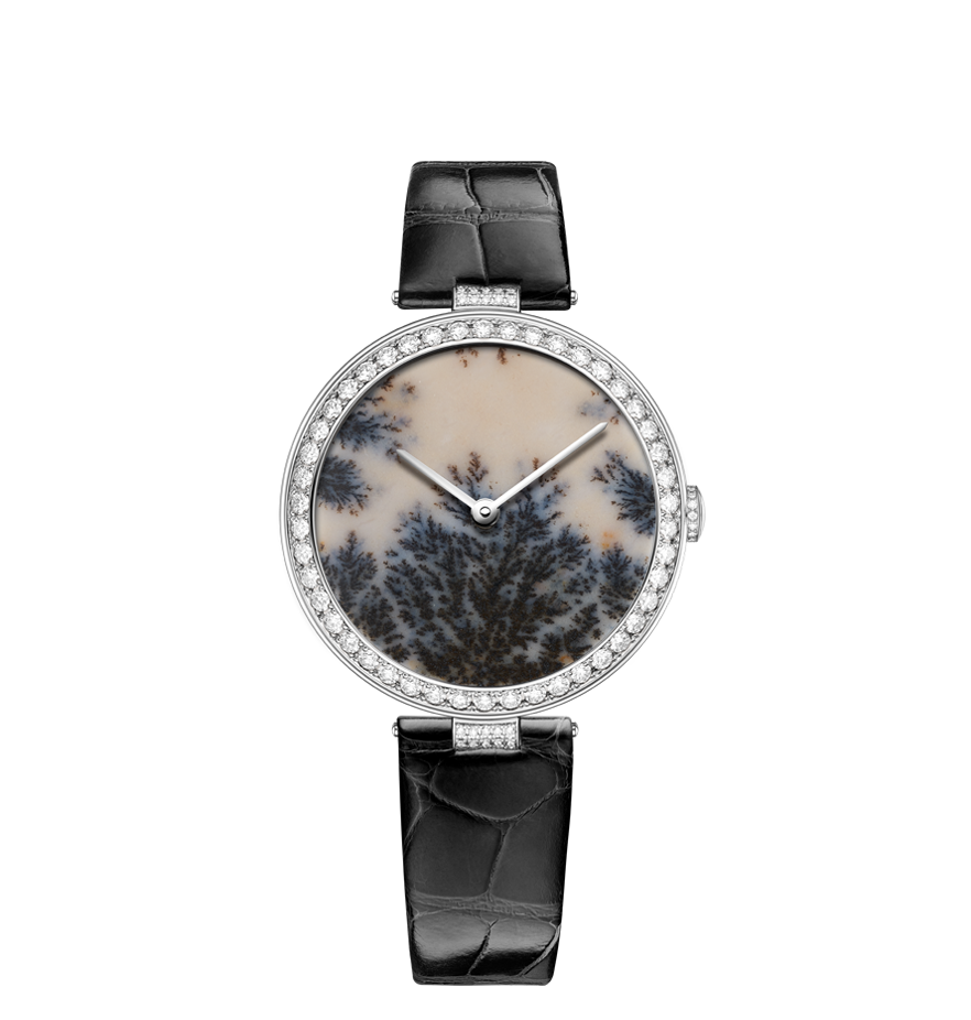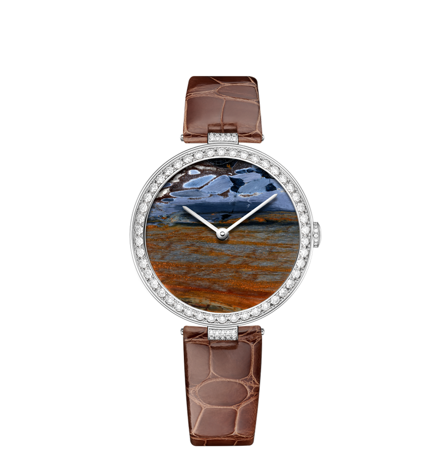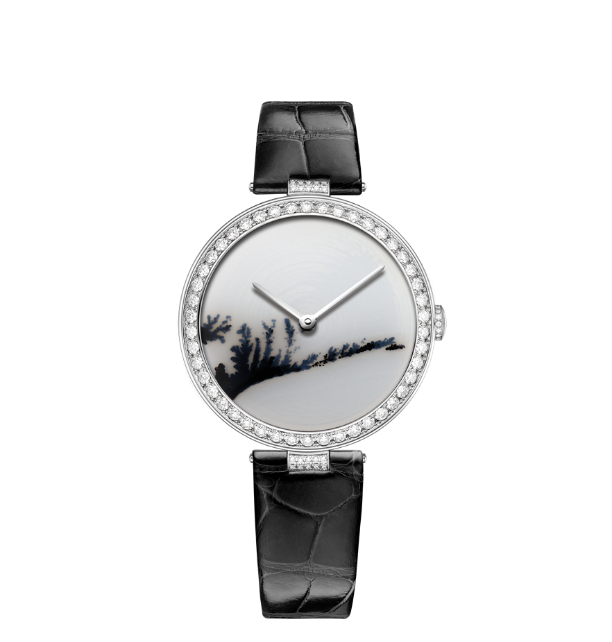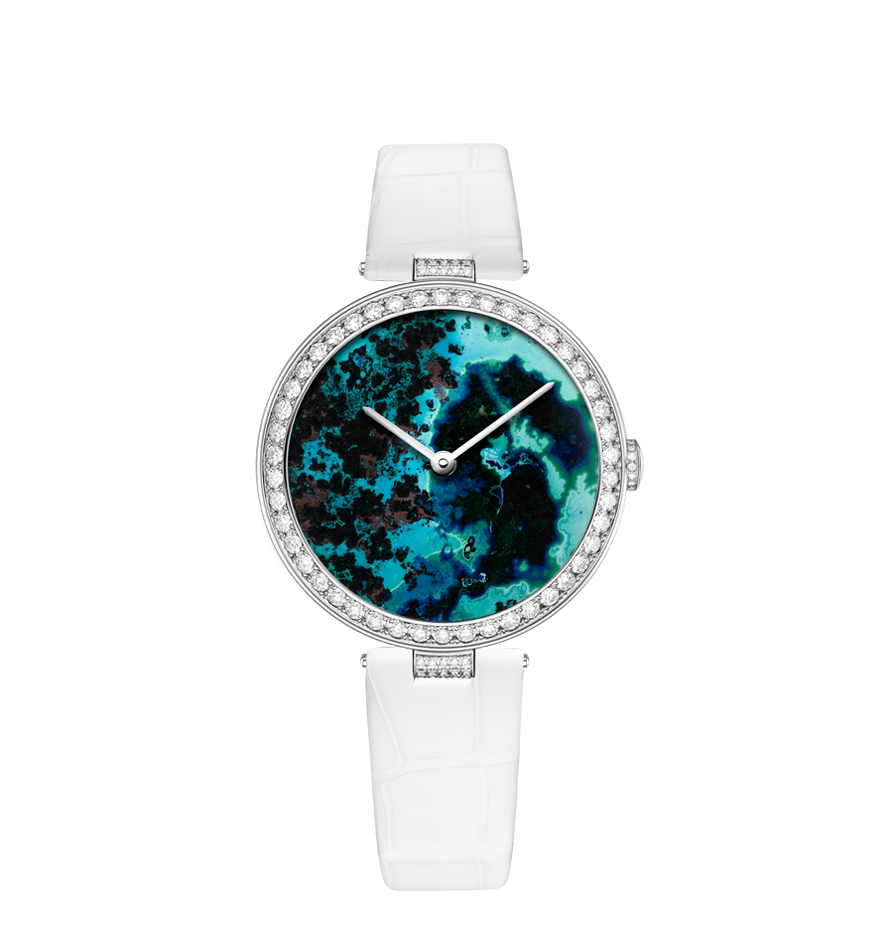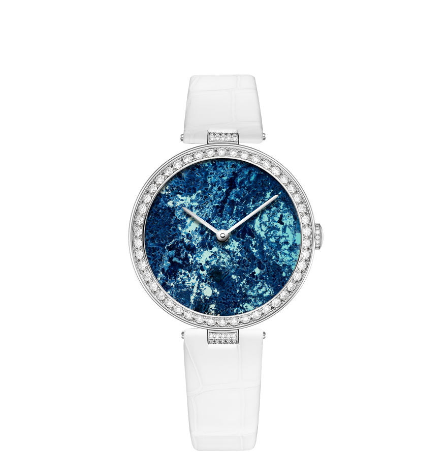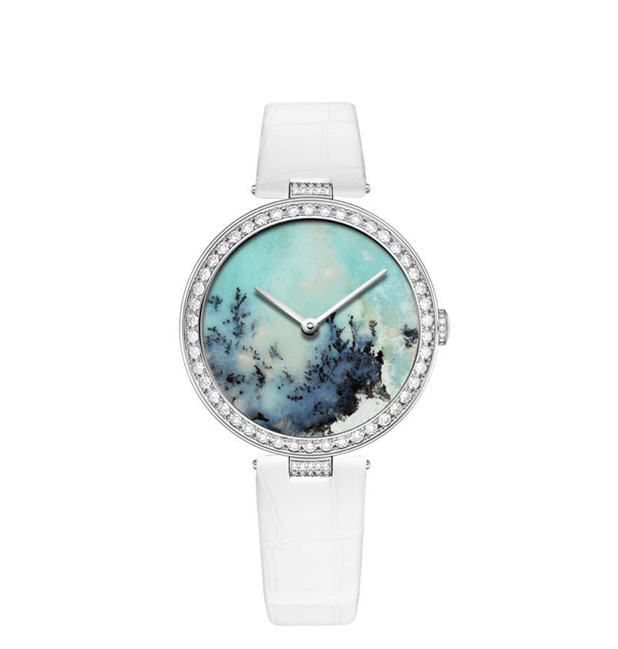 Chaumet reinvents this tradition through a collection of exquisite watches combining the skill and craftsmanship of the Maison with these fascinating treasures of nature. From Lapis Lazuli and opal to dendritic agate… Chaumet has researched and carefully selected twelve decorative stones, each with its own unique beauty. The stones are cut and set off by a white or rose gold bezel with pavé set diamonds and a coloured alligator bracelet, making way for the most beautiful landscapes. Whether it’s a wilderness, a conifer forest under a thick blanket of snow or an azure blue lagoon… Everyone sees a different landscape in these timepiece creations, like a reflection of their personal history and travels.