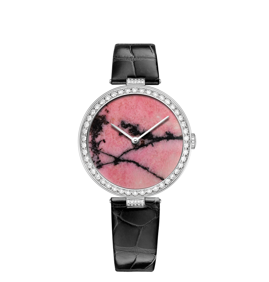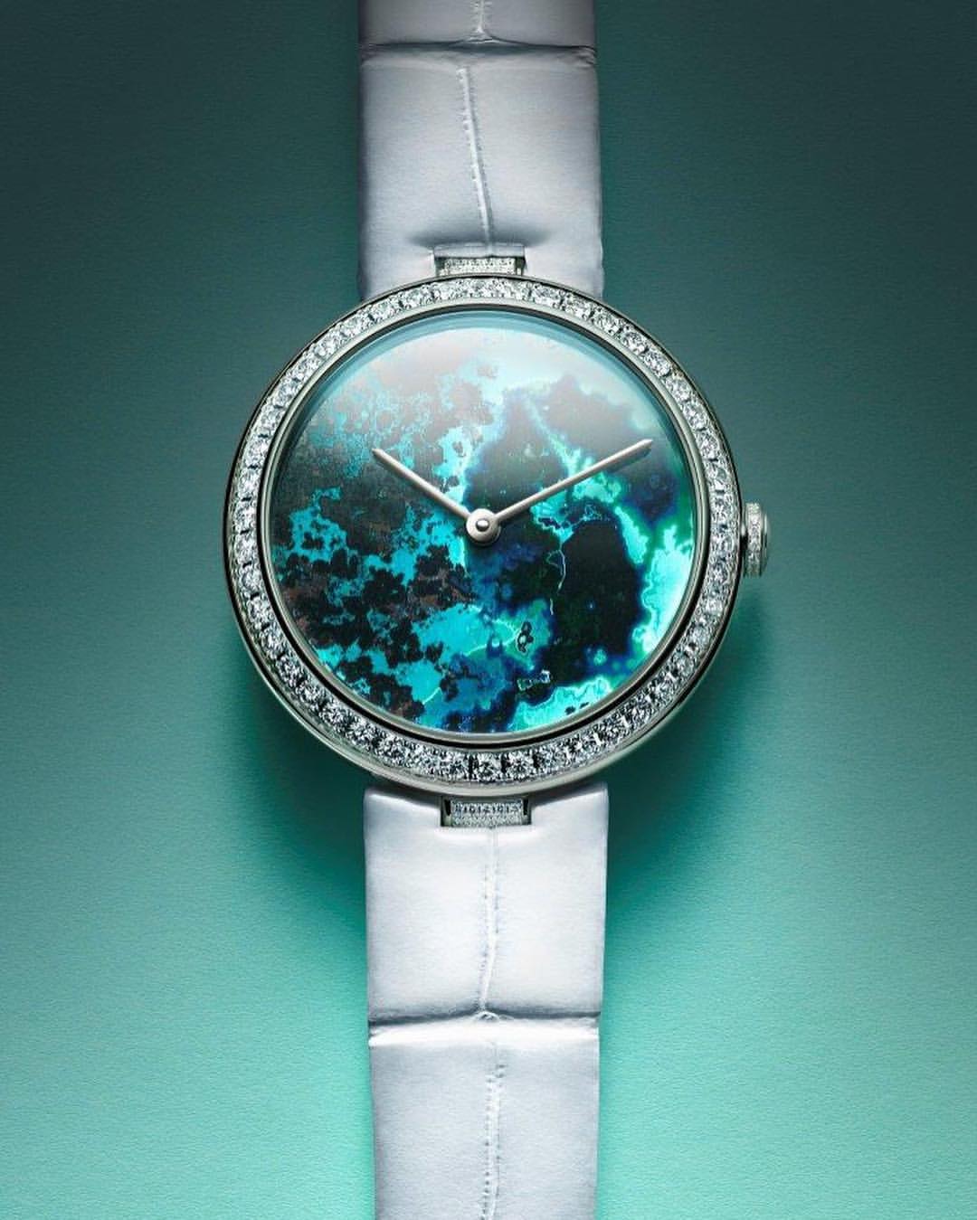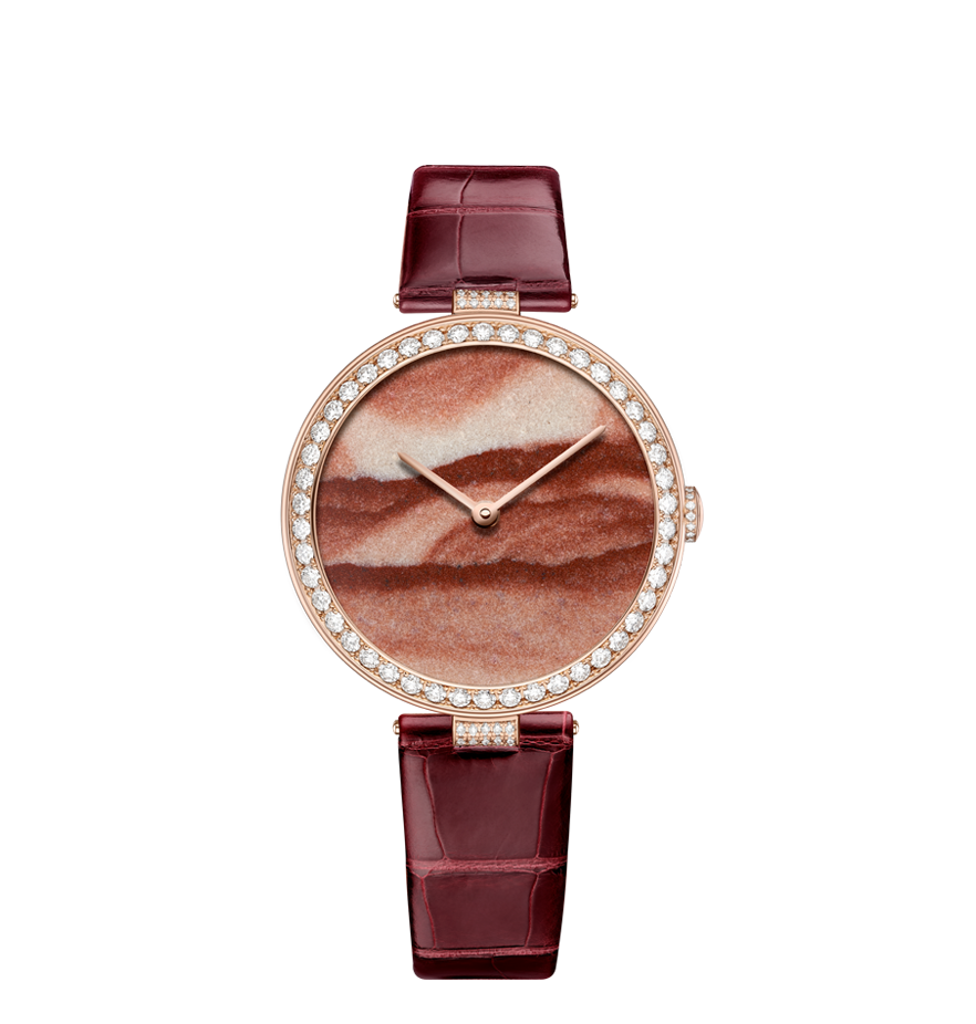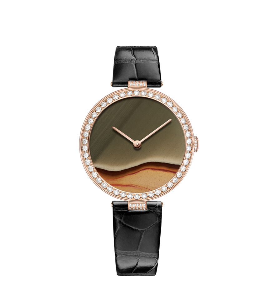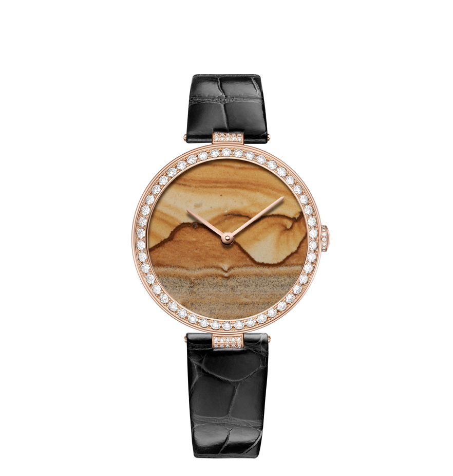 Chaumet reinvents this tradition through a collection of exquisite watches combining the skill and craftsmanship of the Maison with these fascinating treasures of nature. From Lapis Lazuli and opal to dendritic agate… Chaumet has researched and carefully selected twelve decorative stones, each with its own unique beauty. The stones are cut and set off by a white or rose gold bezel with pavé set diamonds and a coloured alligator bracelet, making way for the most beautiful landscapes. Whether it’s a wilderness, a conifer forest under a thick blanket of snow or an azure blue lagoon… Everyone sees a different landscape in these timepiece creations, like a reflection of their personal history and travels.