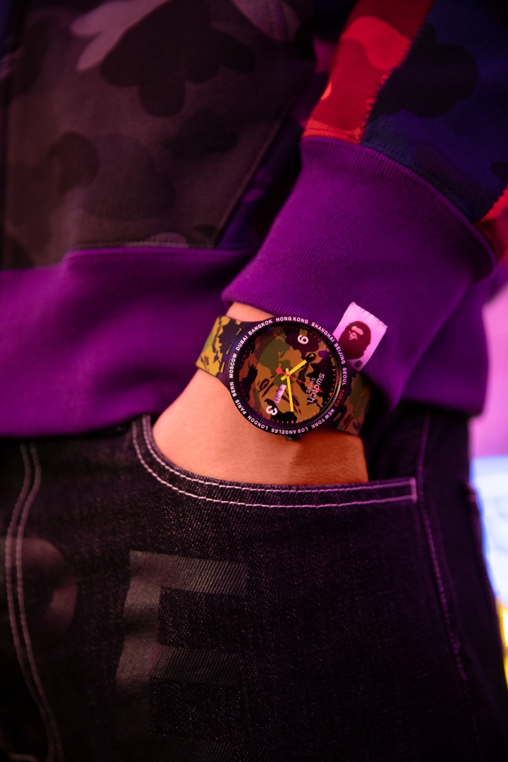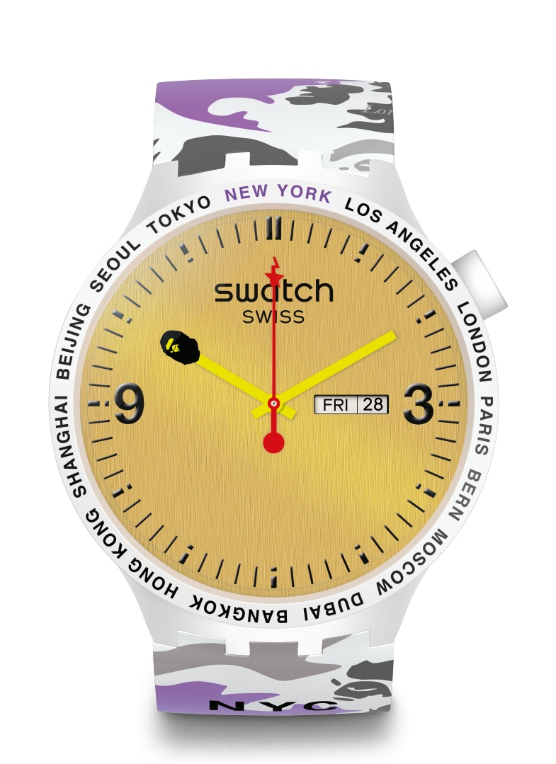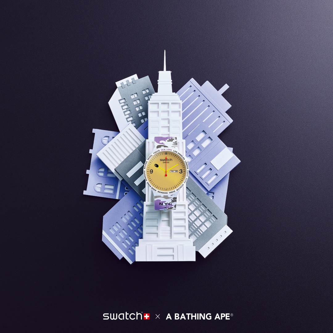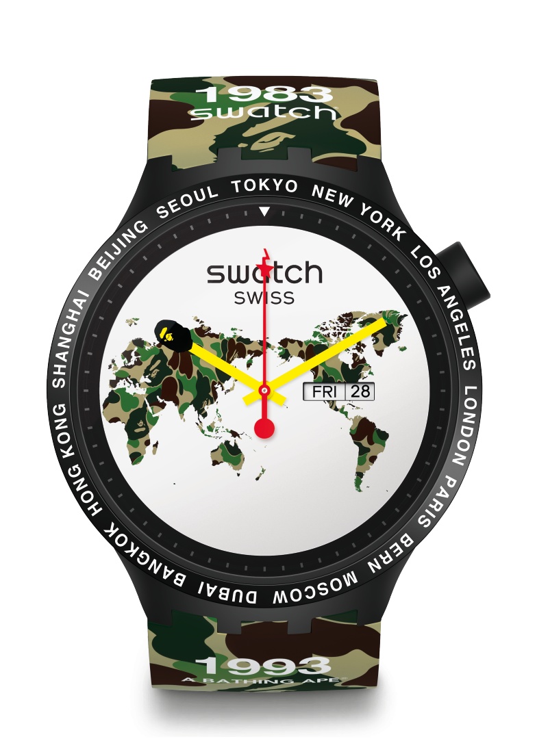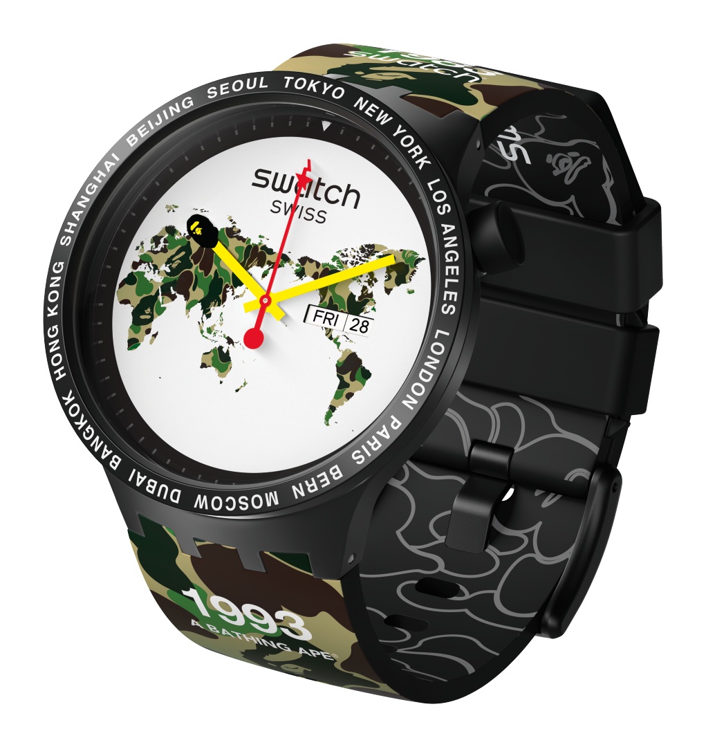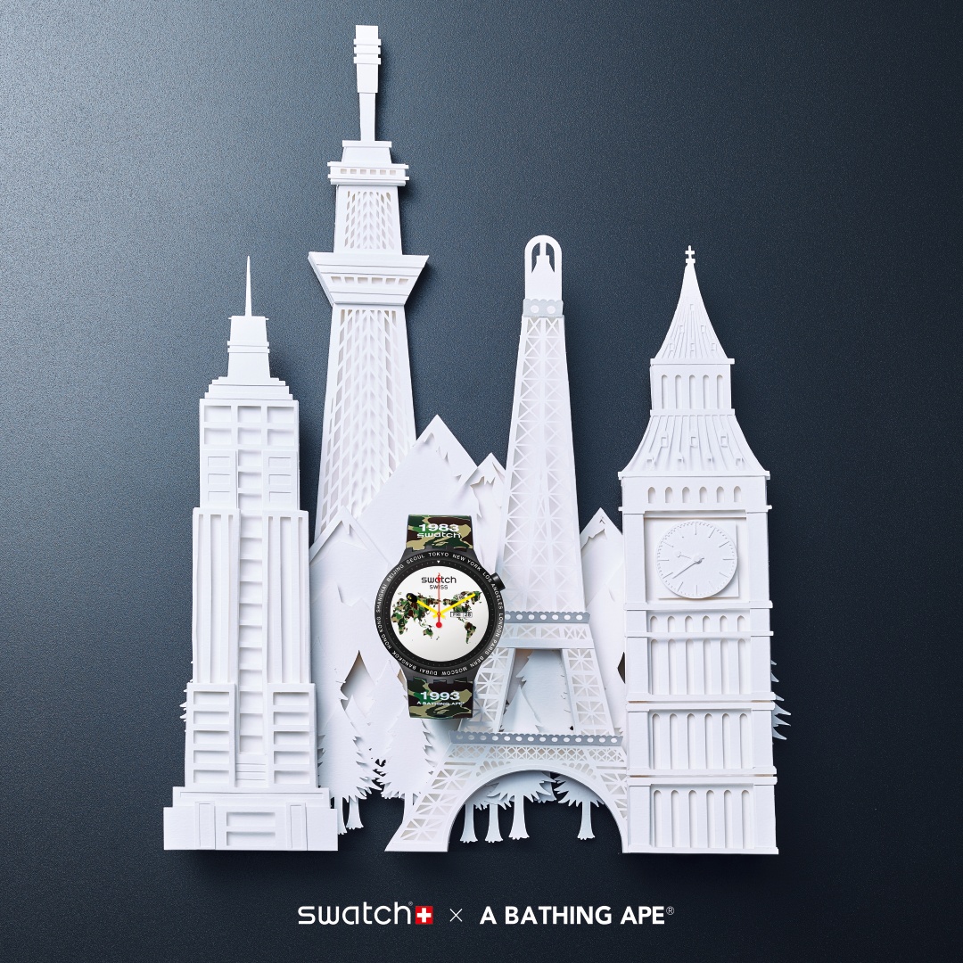The newest SWATCH BIG BOLD product line, a statement piece boasting a striking Ø47mm watchcase, serves as a daring canvas for this limited-edition collection. All six models feature a newly designed signature BAPE® camo pattern as well as the Ape Head logo on the hour hand and the lower strap, while the enhanced Swatch logo is invocative of the watchmaker’s debut in the 1980s. The five city watches are numbered and limited to either 983 or 1993 pieces, paying tribute to each brand’s respective birth year. Together with the sixth model BIG BOLD BAPE The World, this limited-edition collection shouts out to big personalities, celebrating the world, diversity and time.
