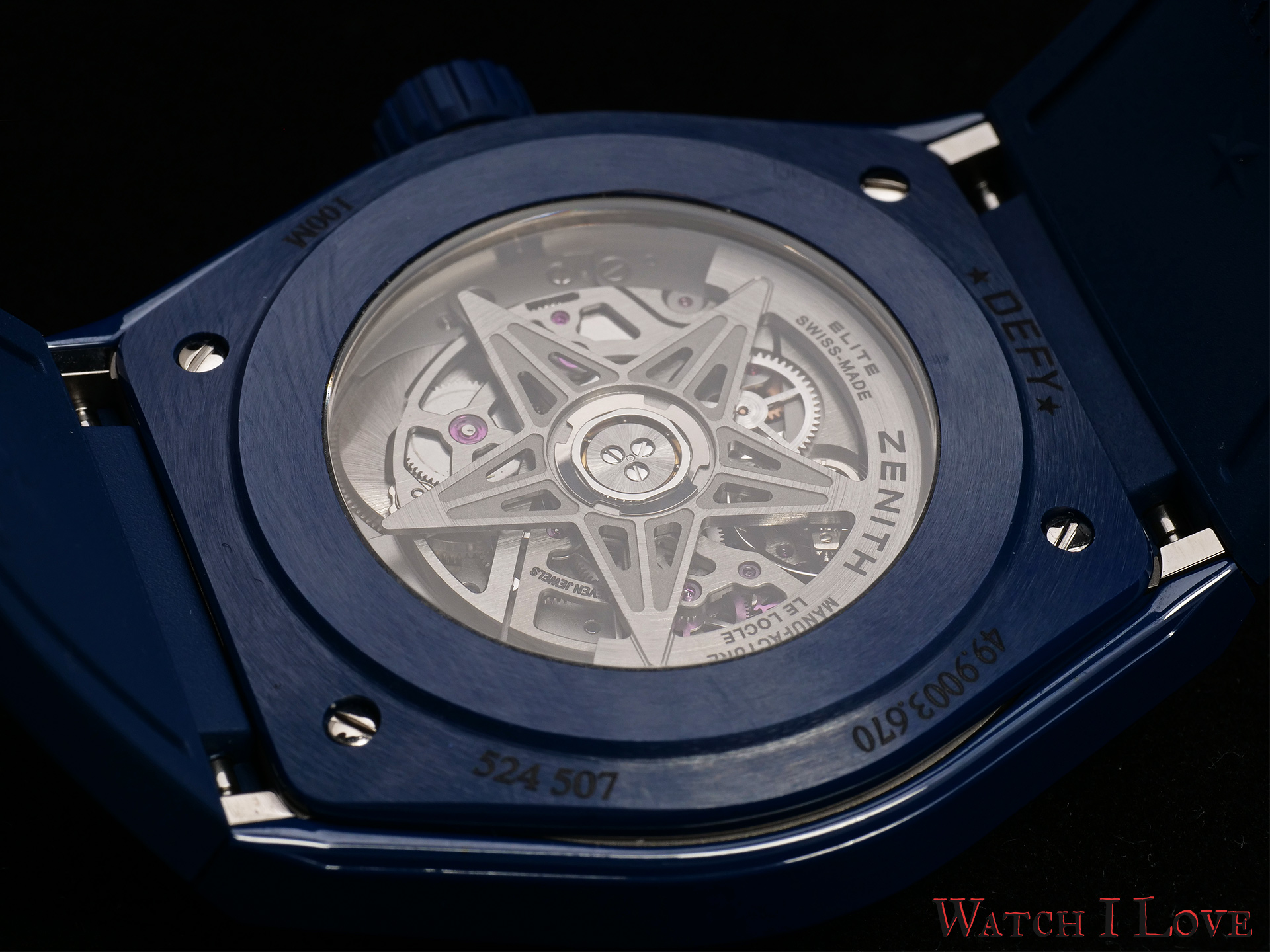 Turning the watch, one discovers the ceramic caseback fixed with steel screws. Besides the typical engravings, the back of the Defy reveals the calibre Elite 670 SK. A nice landscape. It is worth to remove the watch from the wrist to have a look.