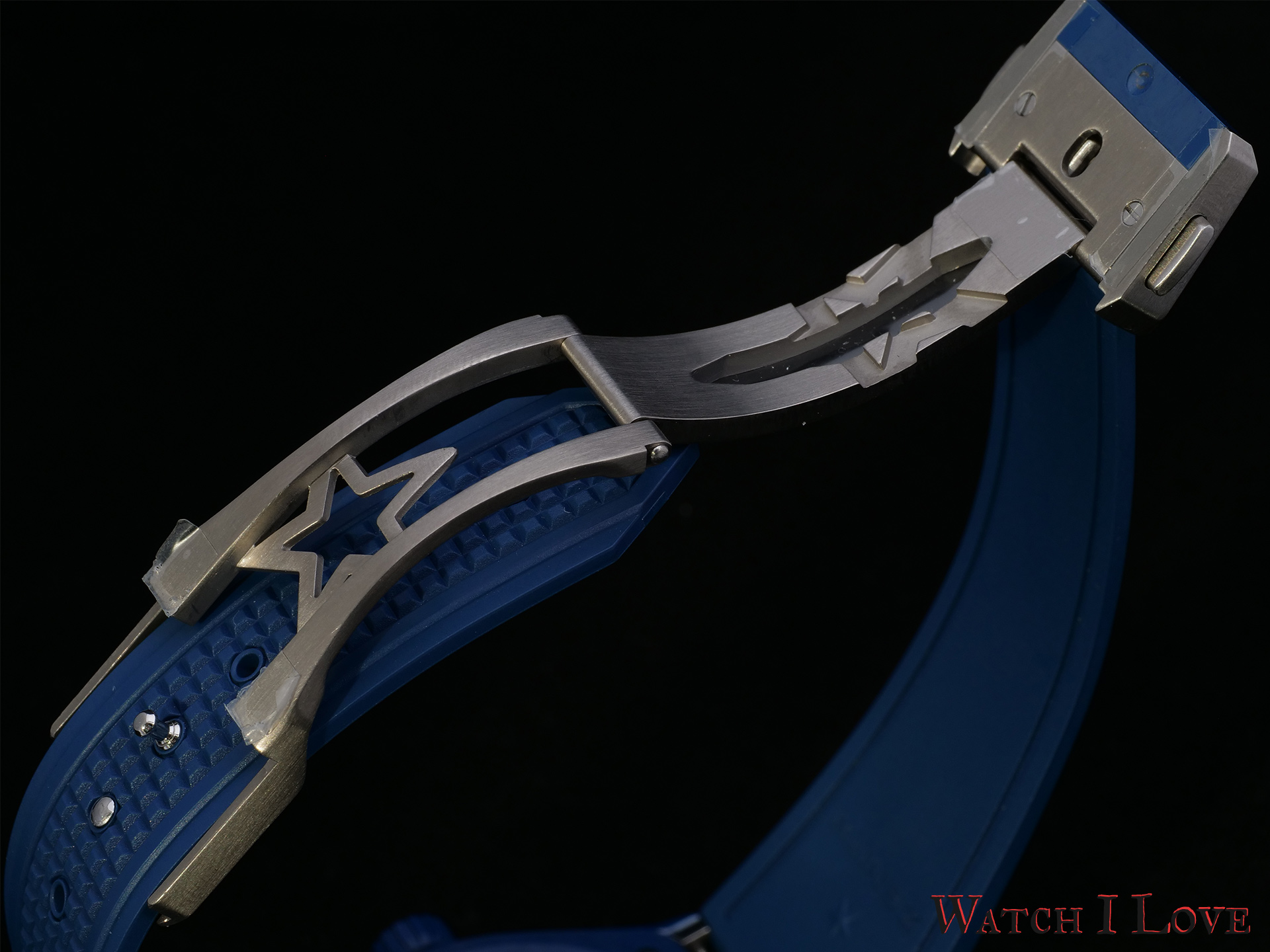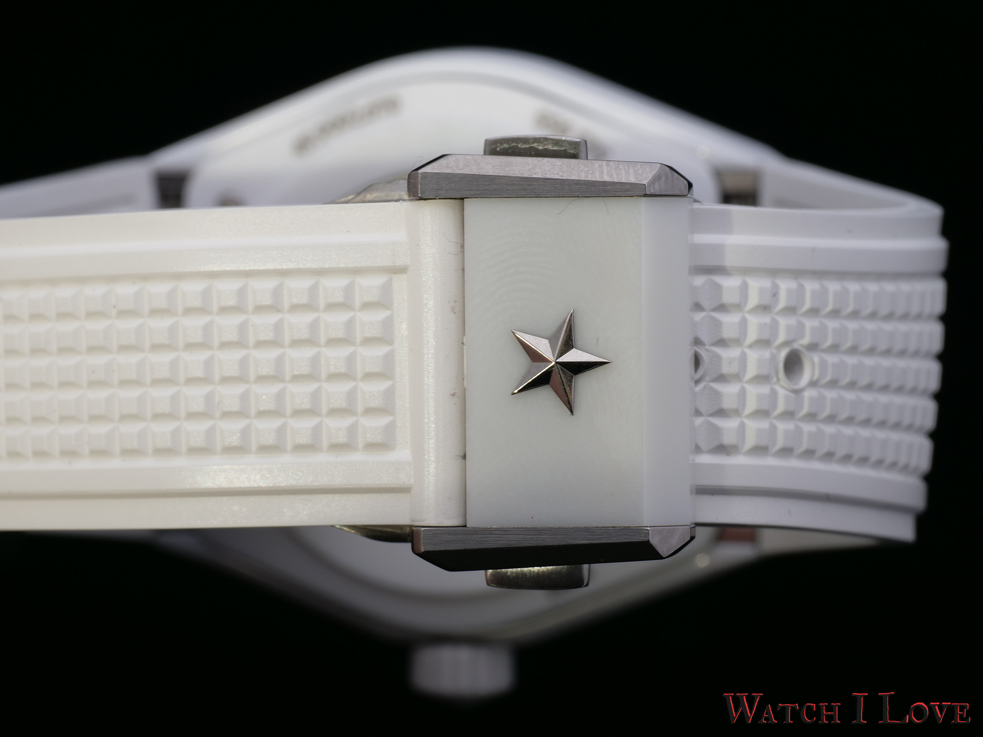 Note the metal structure on the lugs, that keeps the strap. It looks like the watch has metal frame construction on which the ceramic was added. The rubber strap (black, white or blue) is fitted with a titanium buckle with ceramic insertion.