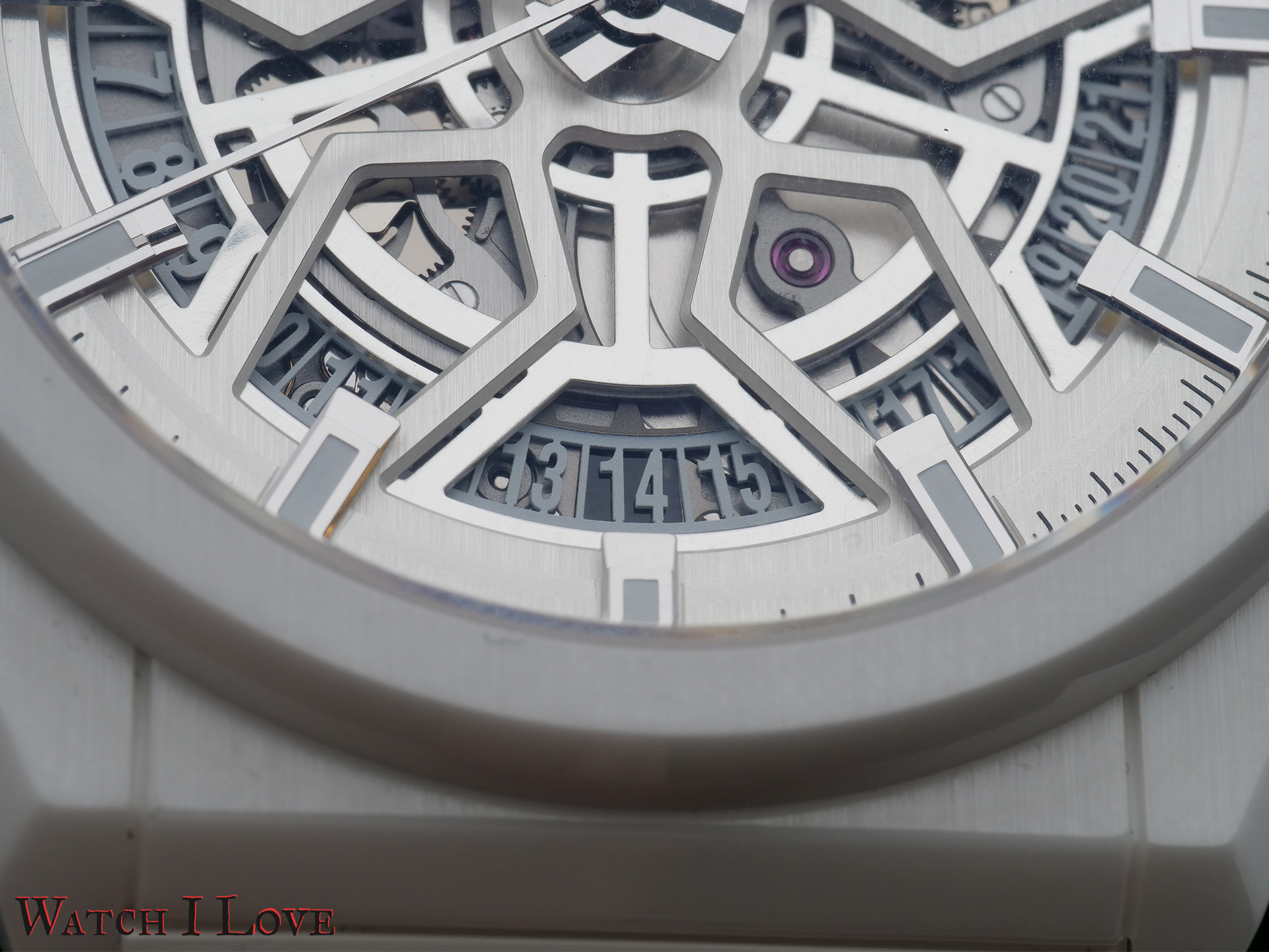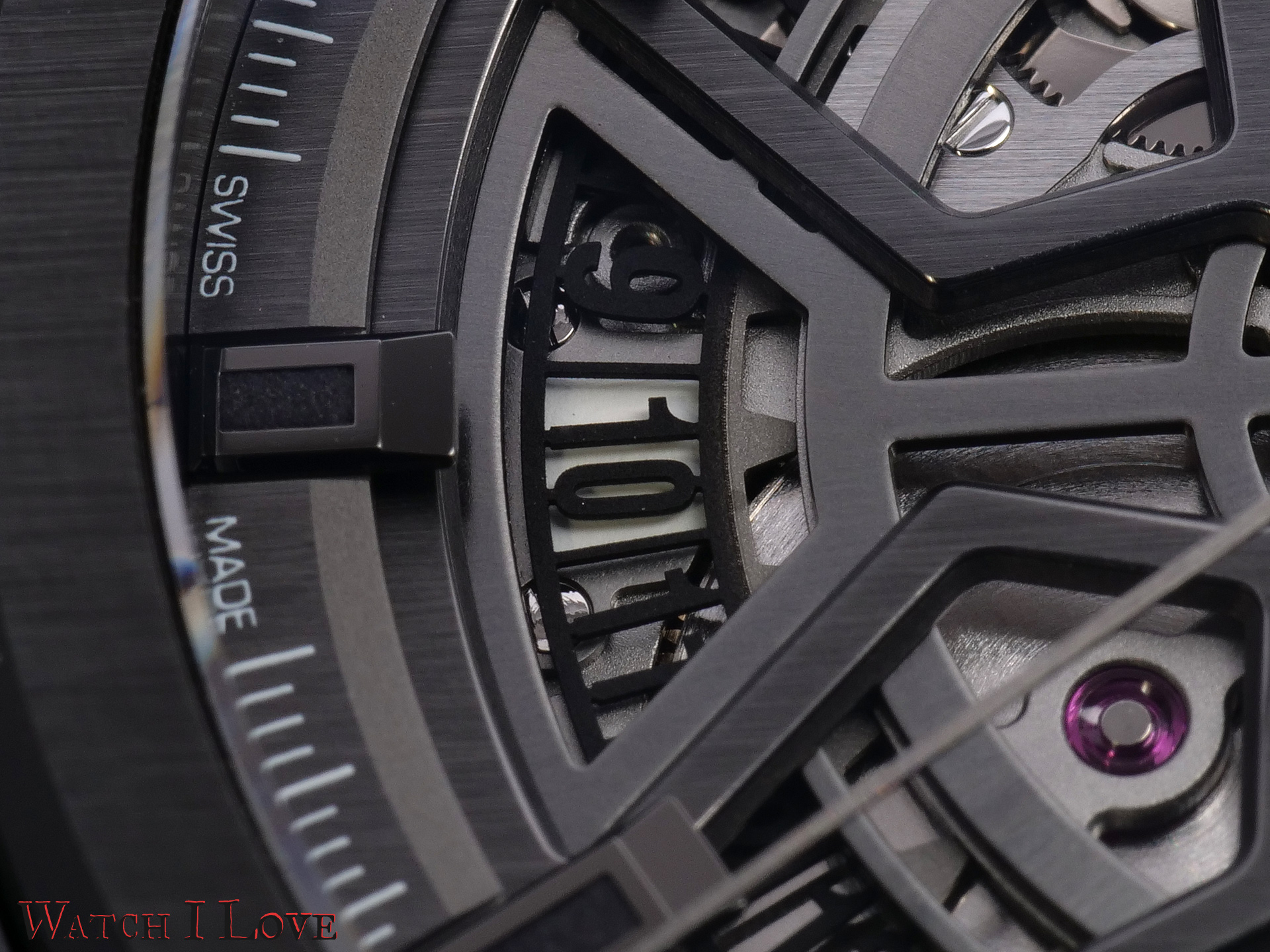 The spectacularity touch is given by the silicon pallet lever and escapement wheel, visible on top on the left side. See below.