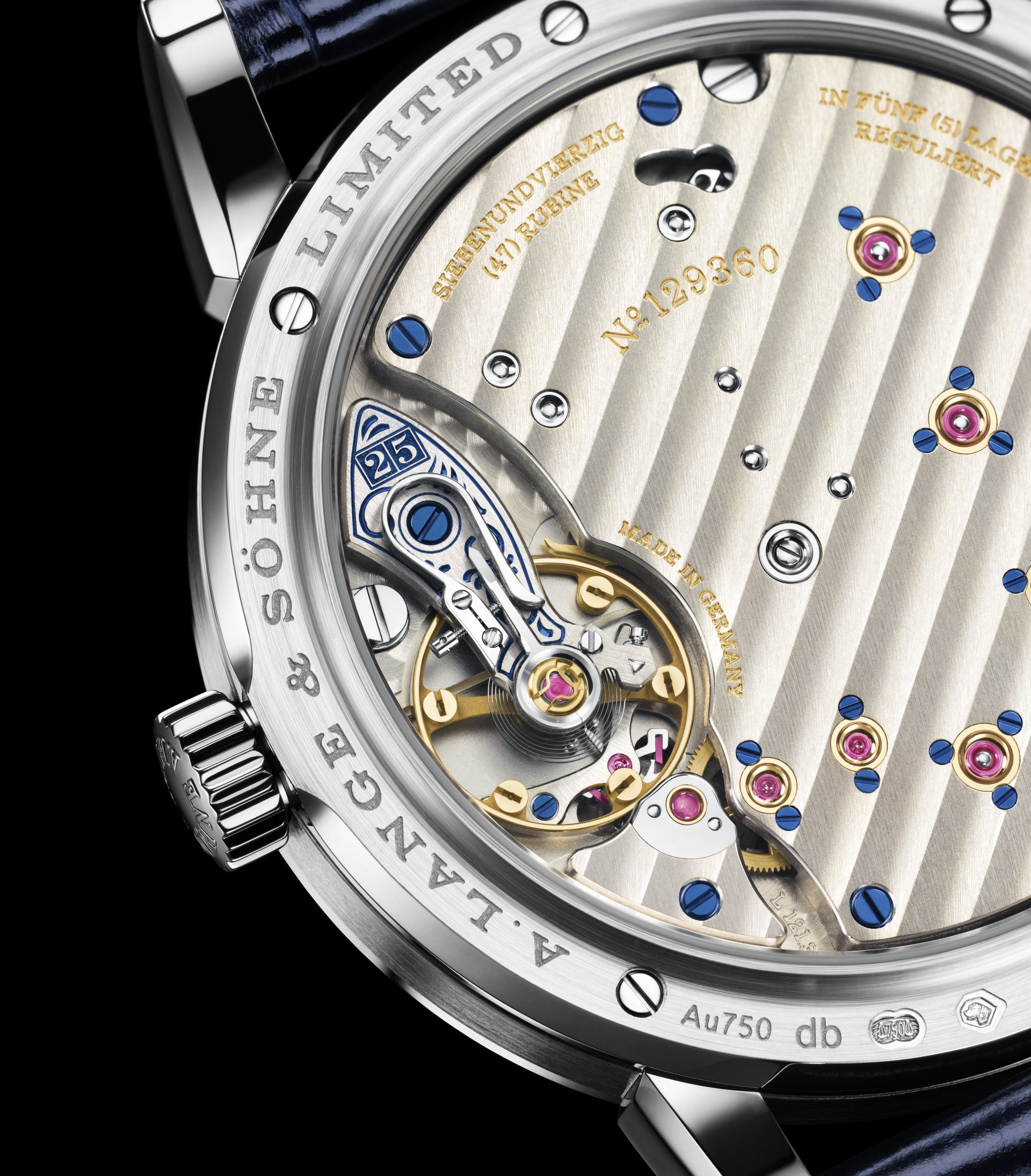 Like all other models of the “25th Anniversary” collection, the LANGE 1 MOON PHASE is endowed with a special movement detail: The anniversary number 25 is integrated in the manually engraved, blue-filled balance cock. As regards typography and form, it corresponds to the Lange outsize date which is set to 25 in all photos. The same number also refers to the strict limitations of all anniversary models.