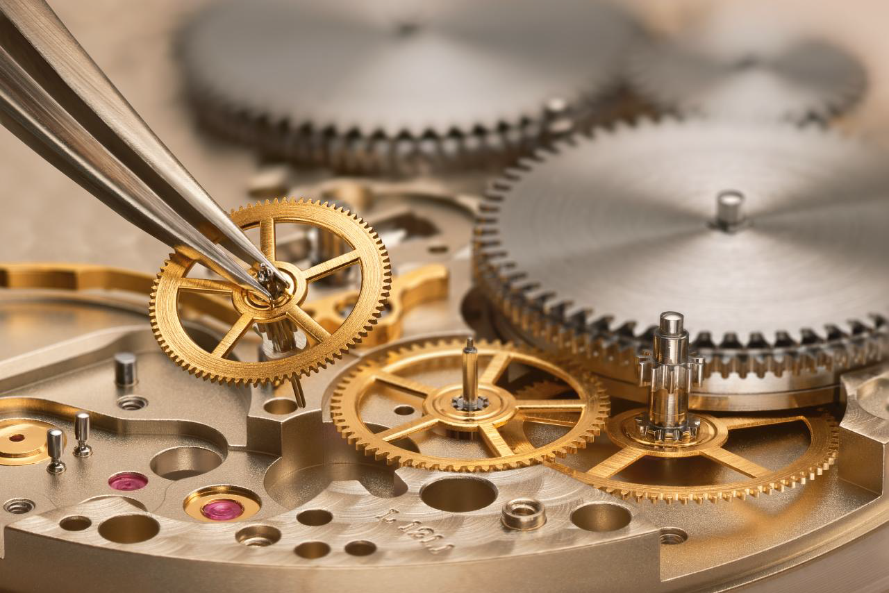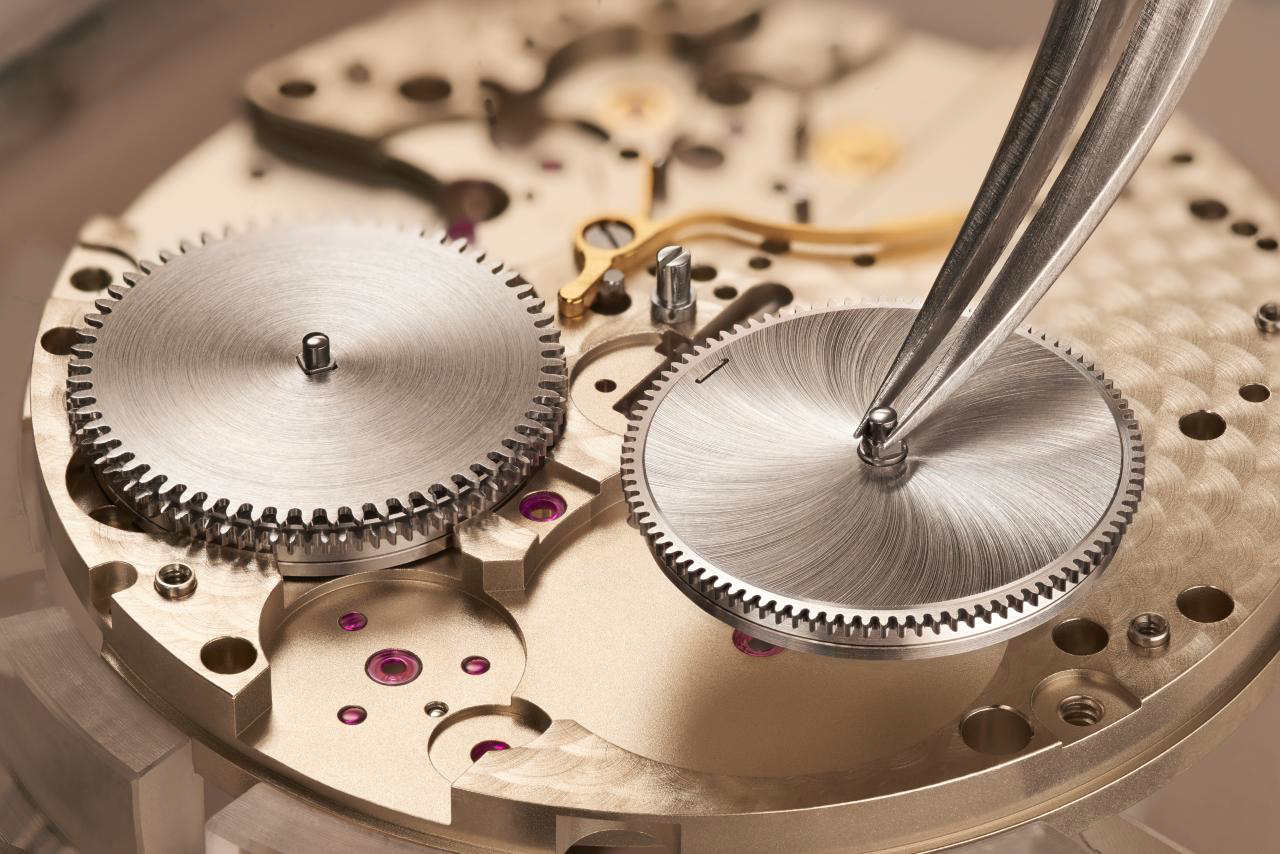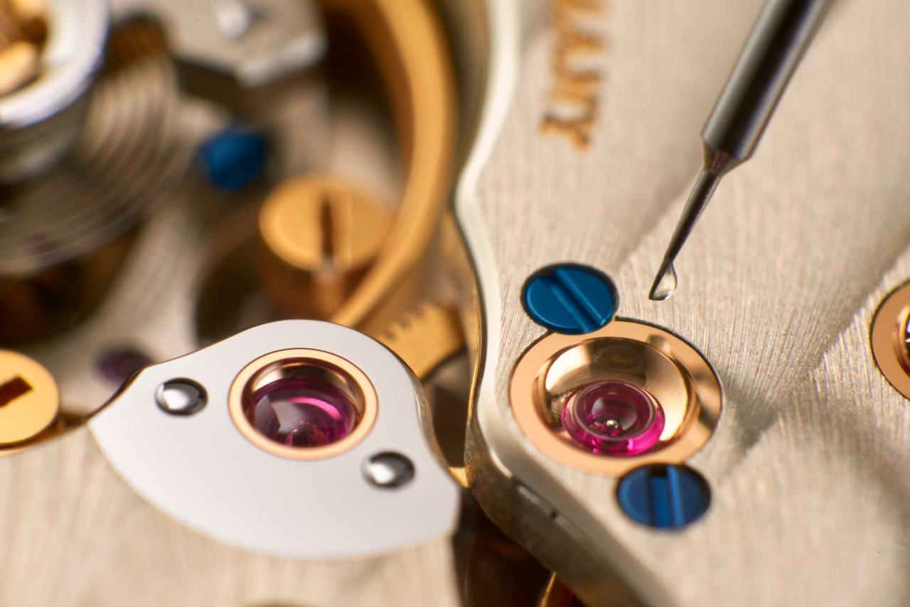 During the first assembly, different types of oil and grease are applied to the movement. They all have several additives that deliver the best possible lubrication effect for various applications. There are bearings that must sustain low pressures but high speeds and slowly rotating pinions that carry considerable loads. There are components that must withstand high acceleration and extreme slowness, and others that are exposed to significant levels of friction.