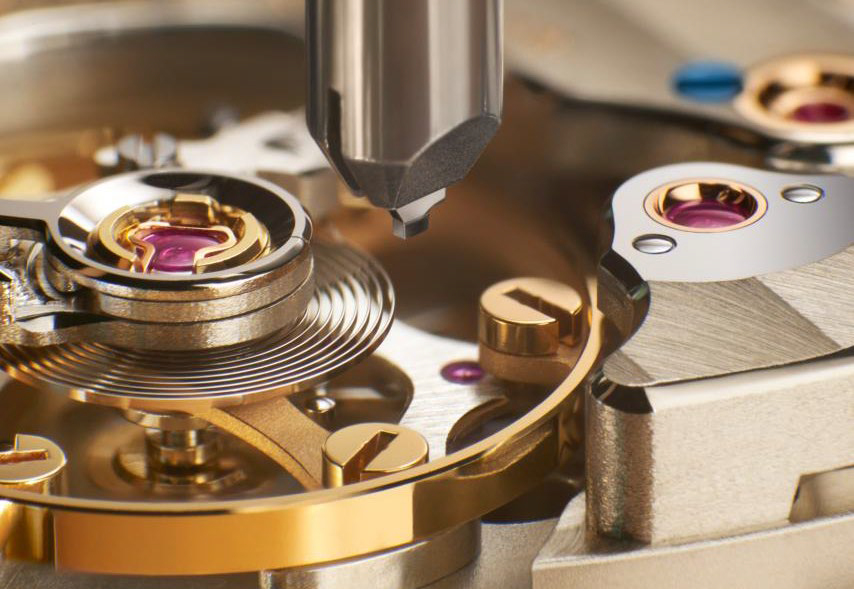 Shock-resistant cam-poised balance; balance spring manufactured in-house, frequency of 21,600 semi-oscillations per hour, precision beat-adjustment system with lateral setscrew and whiplash spring