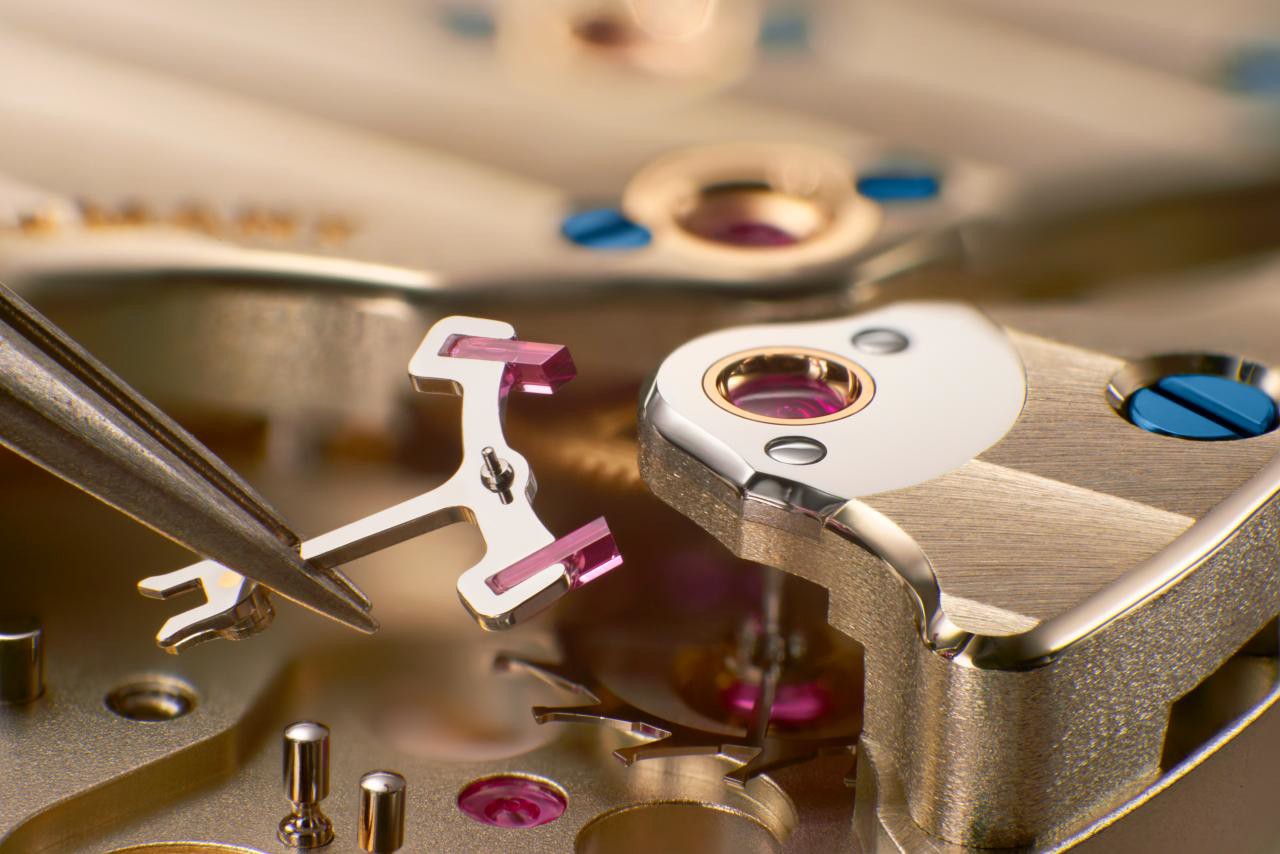With each semi-oscillation of the balance, the lever is moved back and forth, releasing one tooth of the escape wheel. This, in turn, transfers a precisely defined amount of energy to the oscillation system. Lavishly chamfered edges, sharp corners, grained sides and flat-polished or grinded surfaces require the utmost caution during the assembly.