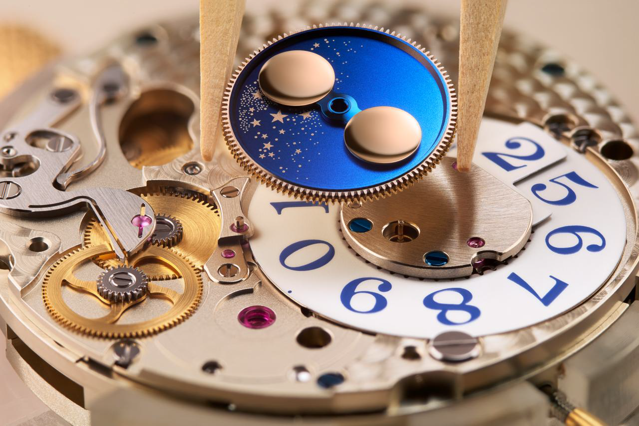 On the disc, the different times of day are represented by varying blue hues caused by interference effects. During the day, it shows a bright sky without stars, while at night it depicts a dark sky with prominently contrasting laser-cut stars. A separate solid-gold moon pursues its orbit in the foreground, thus always circulating against a realistic background that doubles as a day/night indicator when setting the watch. Thanks to a special gear arrangement, the moon is continuously on the move and accurate to 122.6 years.