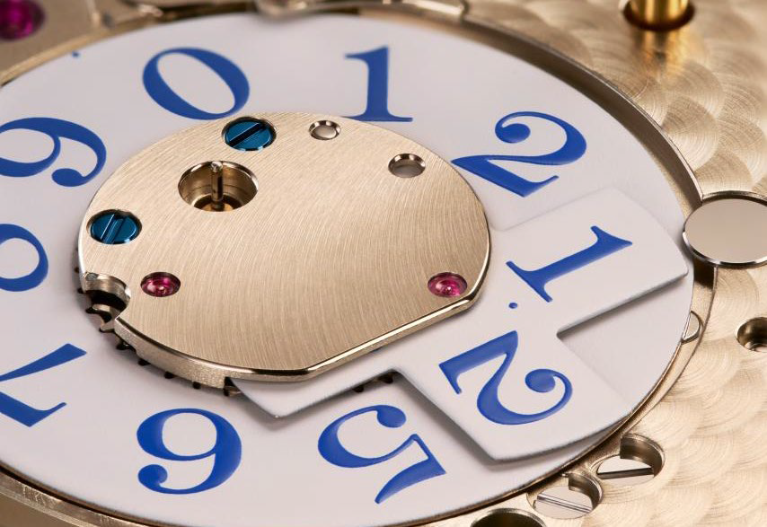 The components of the power reserve mechanism are assembled on the dial side of the movement and on the base plate which is decorated with a perlage finish. Each of the wheels is lavishly finished with circular graining.