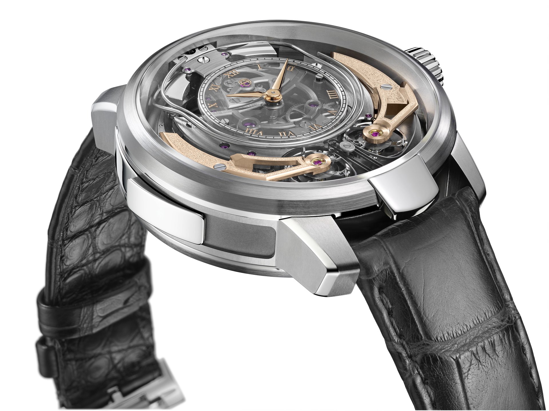 Activated by a slider on the left side of the case band, two hand-polished hammers at 11 o’clock and 1 o’clock respectively chime the hours and minutes on two three-dimensionally curved gongs encircling the hour/minute subdial. The hammers are visually and technically balanced by the two independent regulators – one for each of the two movements – at 5 o’clock and 7 o’clock.